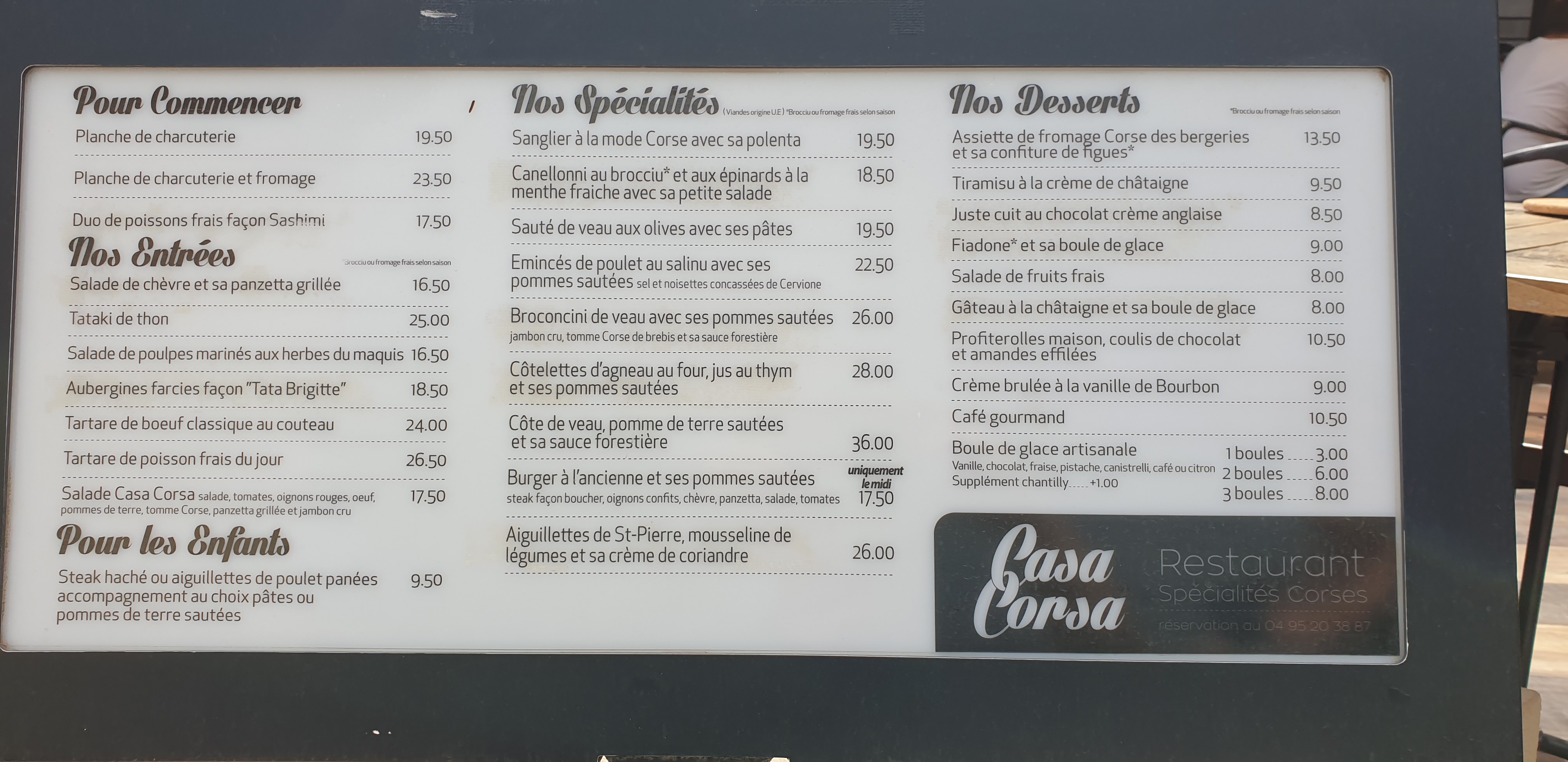 Casa corsa restaurant un peu à l écart, vue sur port belle terrasse ,personnel très sympa et à l écoute. Beau menu, produits locaux, cuisinés, bien présentés dans poêlon très sympa, très bon,copieu....belle soirée 👌👌