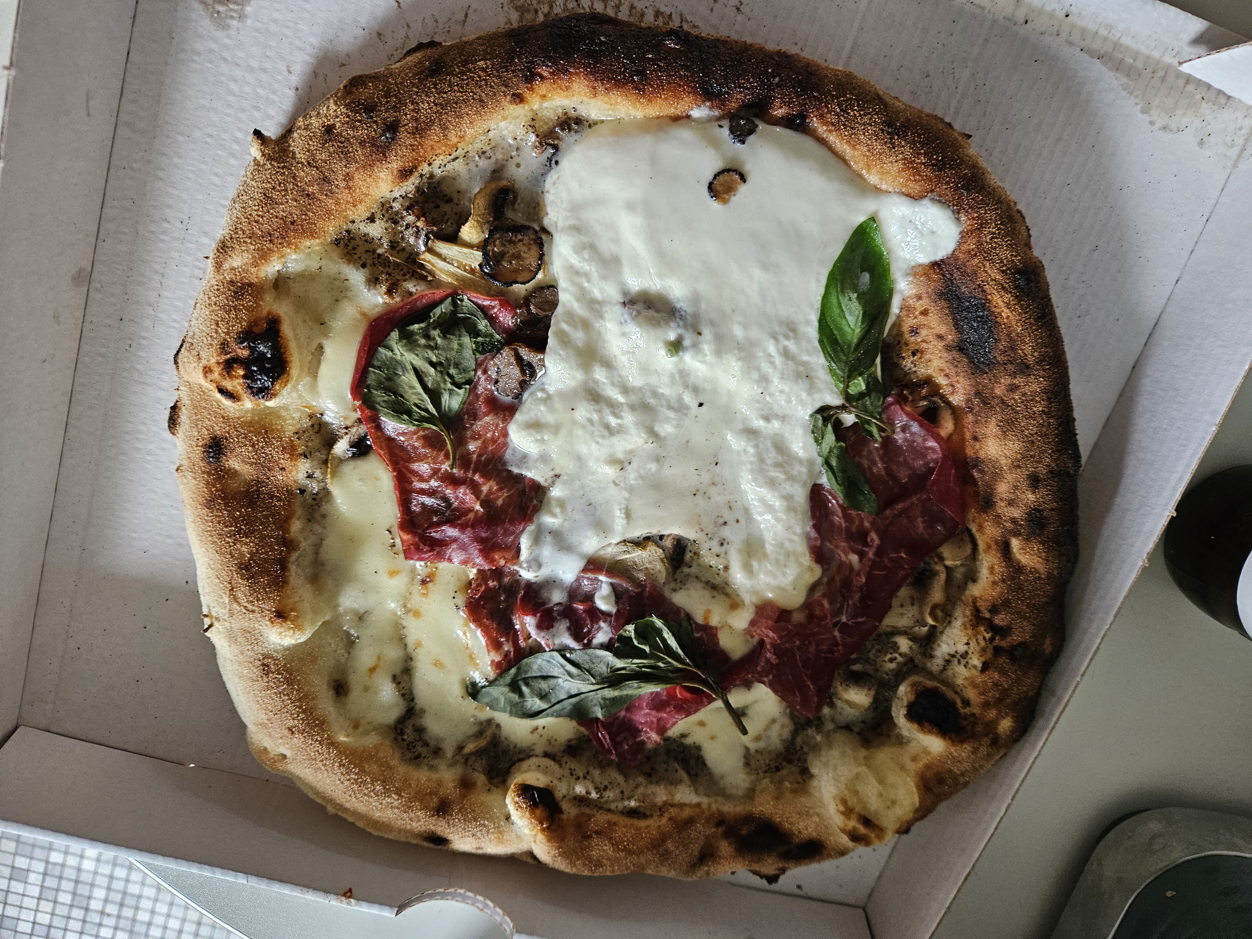 J'ai pris la Pizza Di Marco (burrata, crème de truffe, bœuf séché) à 19€, et elle était franchement mauvaise. Je ne fais généralement pas le difficile avec la nourriture, mais cette pizza avait mauvais goût, surtout le bœuf qui se trouvait sur le dessus. Je n'ai pas pu la finir et, 4h après, j'avais encore ce goût désagréable qui remontait. Pour en rajouter à mon malheur, la pâte n'était pas assez cuite ! Je vois que le restaurant est très bien noté sur Google, donc je ne sais pas si c'est un manque de chance ou un mauvais alignement des étoiles qui a fait que ma pizza était mauvaise, et peut-être que leurs autres produits sont bons, mais je ressors très déçu de cette expérience. Surtout qu'à ce prix, on s'attend à avoir une pizza au moins correcte !