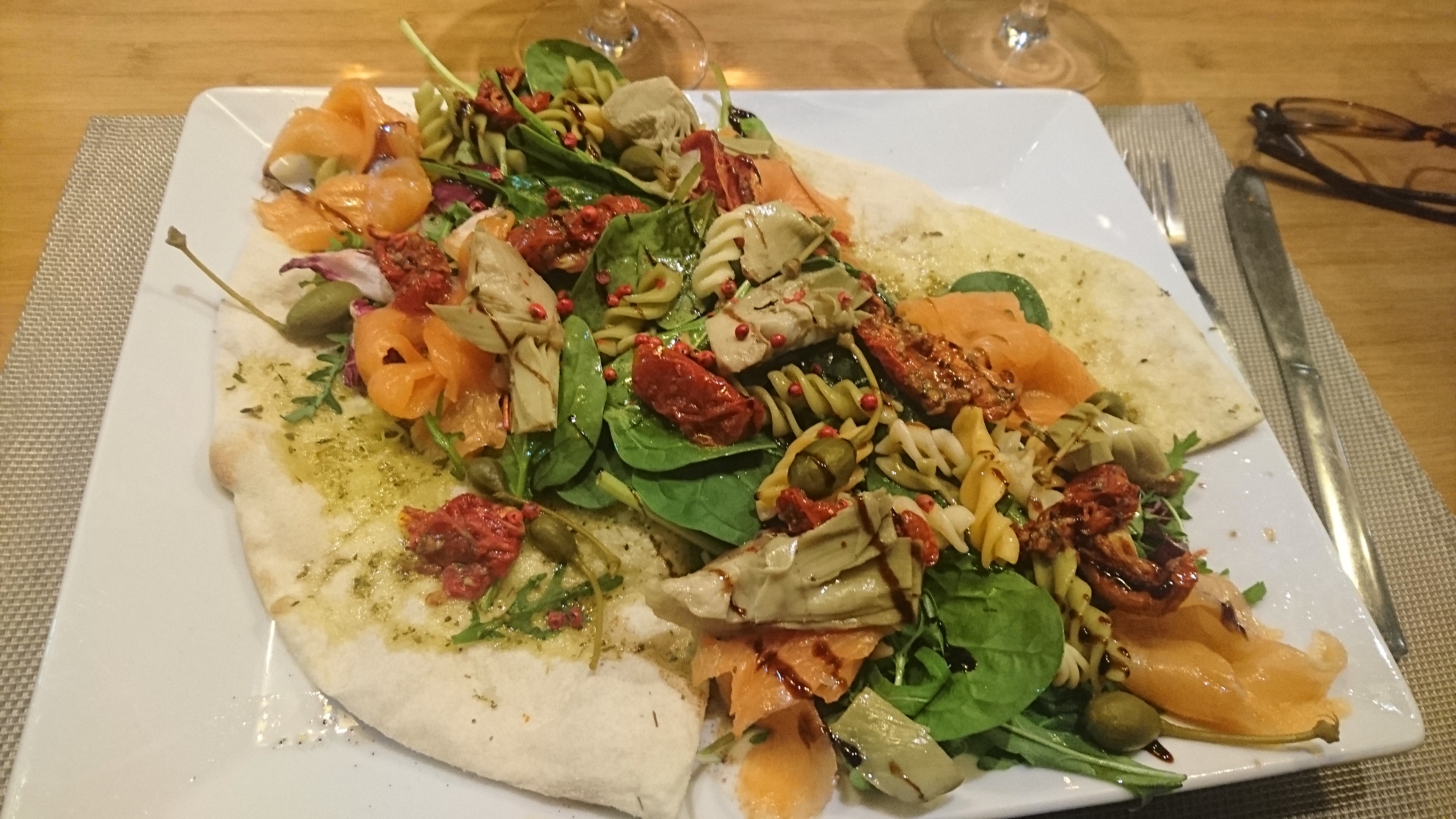 Bien via deliveroo j ai commandée une pizza salmone truite bio fumée tomate COnfite fleur de câpres etc la description donner l eau à la bouche. Et bien heureusement que l on ne mange pas avec les yeux... Mais au moins cette truite posée comme une lingette avait du goût.