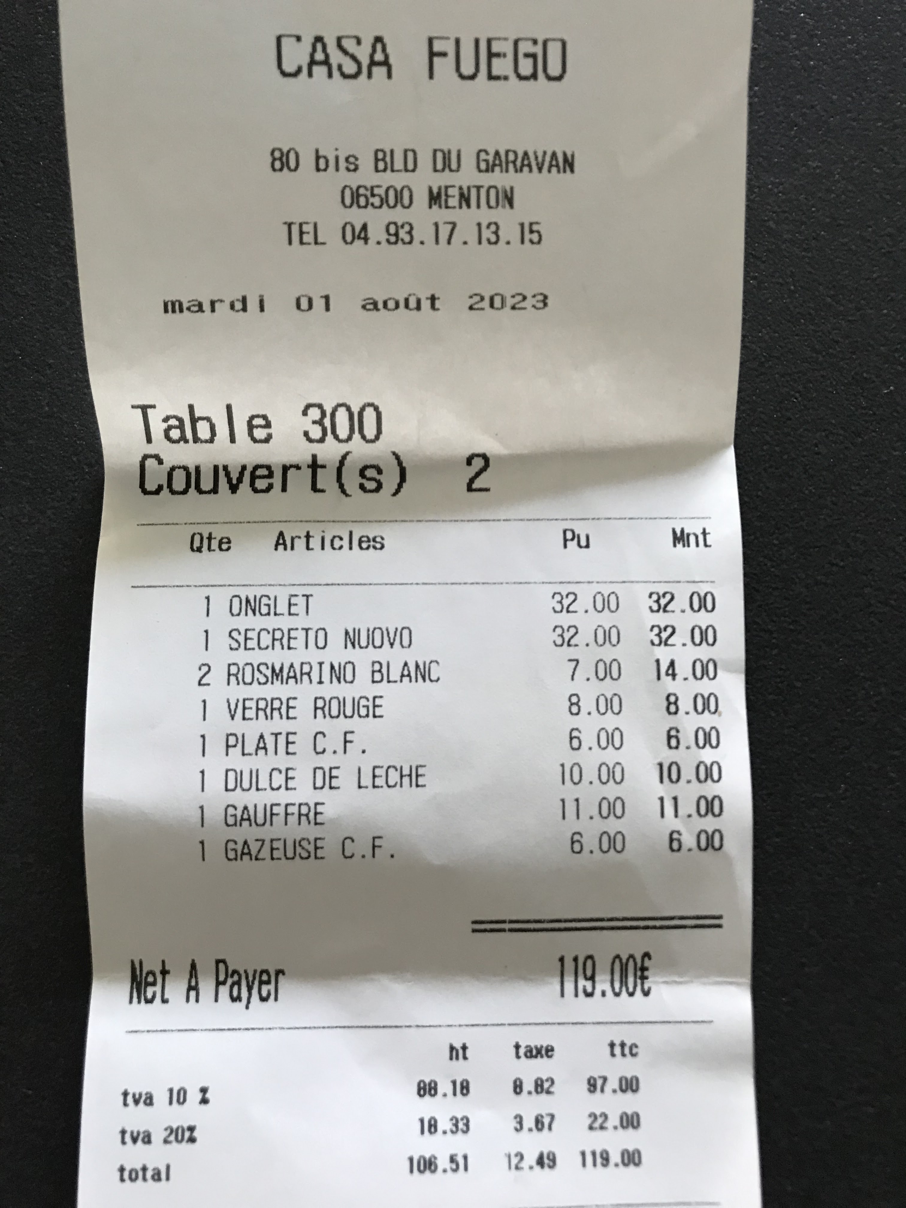 Bonjour, voici mes notes à l'égard du restaurant :CASA FUEGO sur 10. accueil:10. Service, attente,15mn : 7. Confort des chaises :8. Goût des produits, bon mais pas transcendant :7. Propreté des couverts, etc:20. Cadre fort agréable :20. Champagne, agréable en bouche :10. Ambiance, bruyante, musique forte :7. Serveurs ,serveuse près du client :10. Grappa, un pur bonheur :15. Toilettes, (homme)papier WC disséminés un peu de partout, sèche mains défectueux, poubelle pleine, j'ai du ramasser les papiers WC :5. Serveurs, serveuse, discret :20. Serveurs,serveuse niveau habillement, la classe :30. Éclairage de la salle :8. Anecdote, ma fourchette étant tombée sur le sol, aussitôt remplacé:30. Commerçants,non:0. Propreté de l'établissement :30. Humour, (j'en est beaucoup):10. Rigueur :10. Gentillesse :15. Patience :10. Pas de parking, énormément de difficulté pour trouver une place :2. Le personnel aime de discuter avec leurs clients, on aime beaucoup :20. personnel bon chic, bon genre :20. Personnel professionnel et près du client, on a énormément apprécié :20. Langue parlé, français,anglais, italien, espagnol, (j'ai testé):20. Prix onéreux :6. Salle chauffée, température ambiante, Moyenne :10. MORALITÉ DE L'HISTOIRE: avons déboursé 227€(pas de problème pour nous, nous pouvons nous le permettre)nous avons laissé un pourboire de 10€,et c'est la que le bas blesse, pas commerçant du tout, rien nous à été offert ,malgré tout ce que l'on a dépenser. Comme vous l'avez constaté, nous avons été généreux, nous avons pas été radin à vos égards, donc soyez compréhensif et commerçant à notre égard, surtout si vous désirez nous voir souvent dans votre établissement. Excusez nous du peu . P.S:un agréable merci au serveur qui nous a fait rentrer à la loca jolie geste,il ce reconnaîtra. RÉSULTATS :NOUS REVIENDRONT, si vous désirez avoir une place dans cette établissement, mieux vaut réserver ! Car celui-ci est très convoité et fréquenté,si vous avez un portefeuille bien garni, vous pouvez y aller sans problème, sinon passez votre chemin ! Total des points (sur 10):418 P. À bientôt pour de nouvelles aventures. Cordialement votre. Plein de belles choses à toutes l'équipe. Courage !