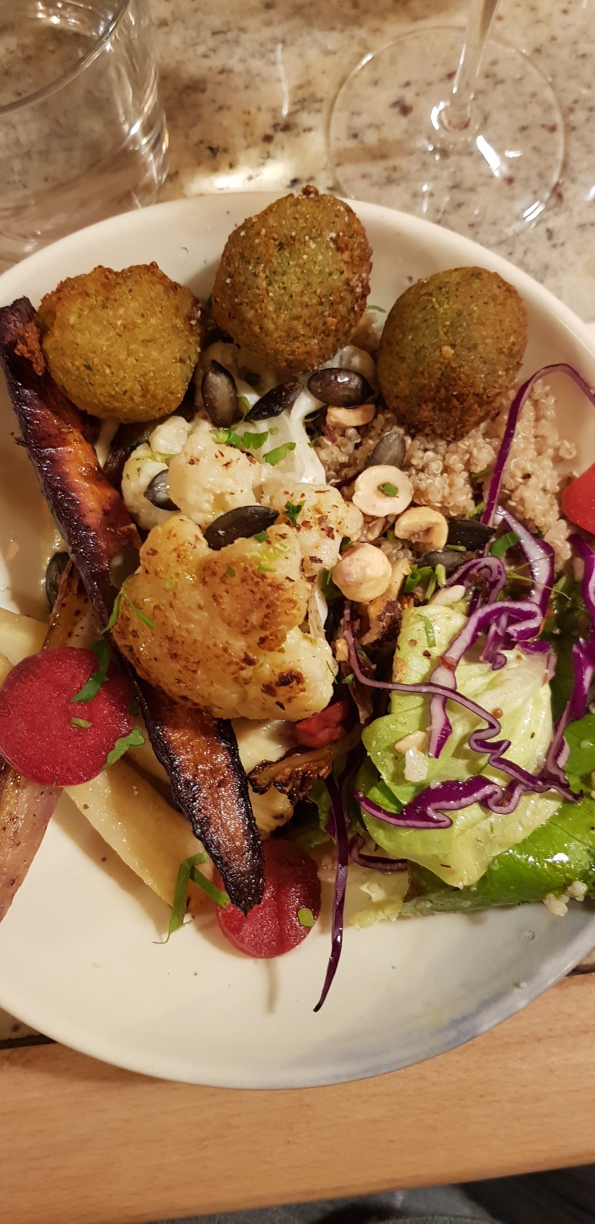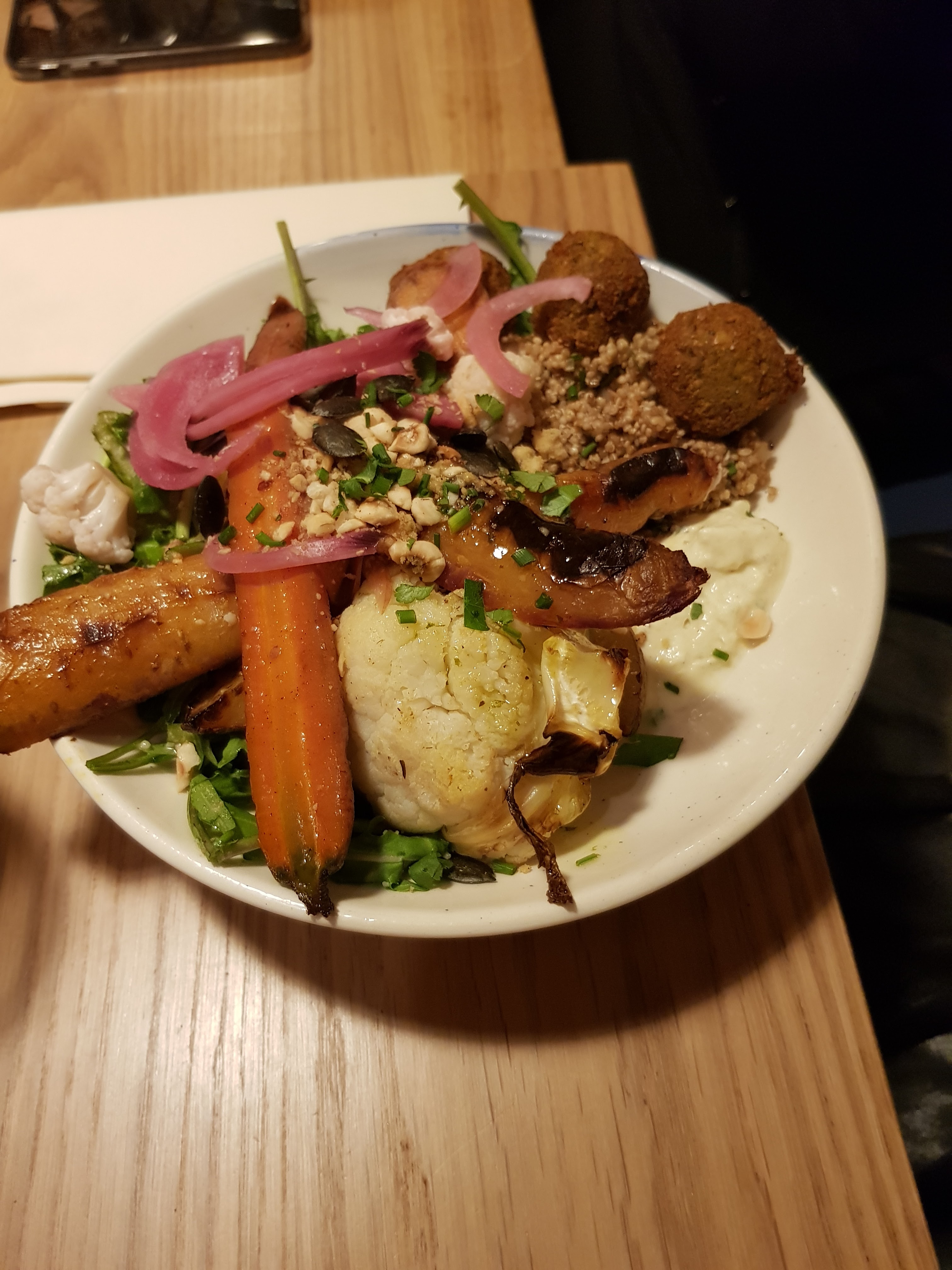 Lieu charmant, service souriant et carte alléchante mais ça se gâte au niveau du goût : quinoa pâteux et amer, falafels secs, sauce et légumes insipides, frite de pois chiches molle... La foccacia perdue en dessert manquait de finesse pour rattraper le menu. Dernier point négatif c'est cher ! Hautement recommandé par des amis, ce top est devenu flop.