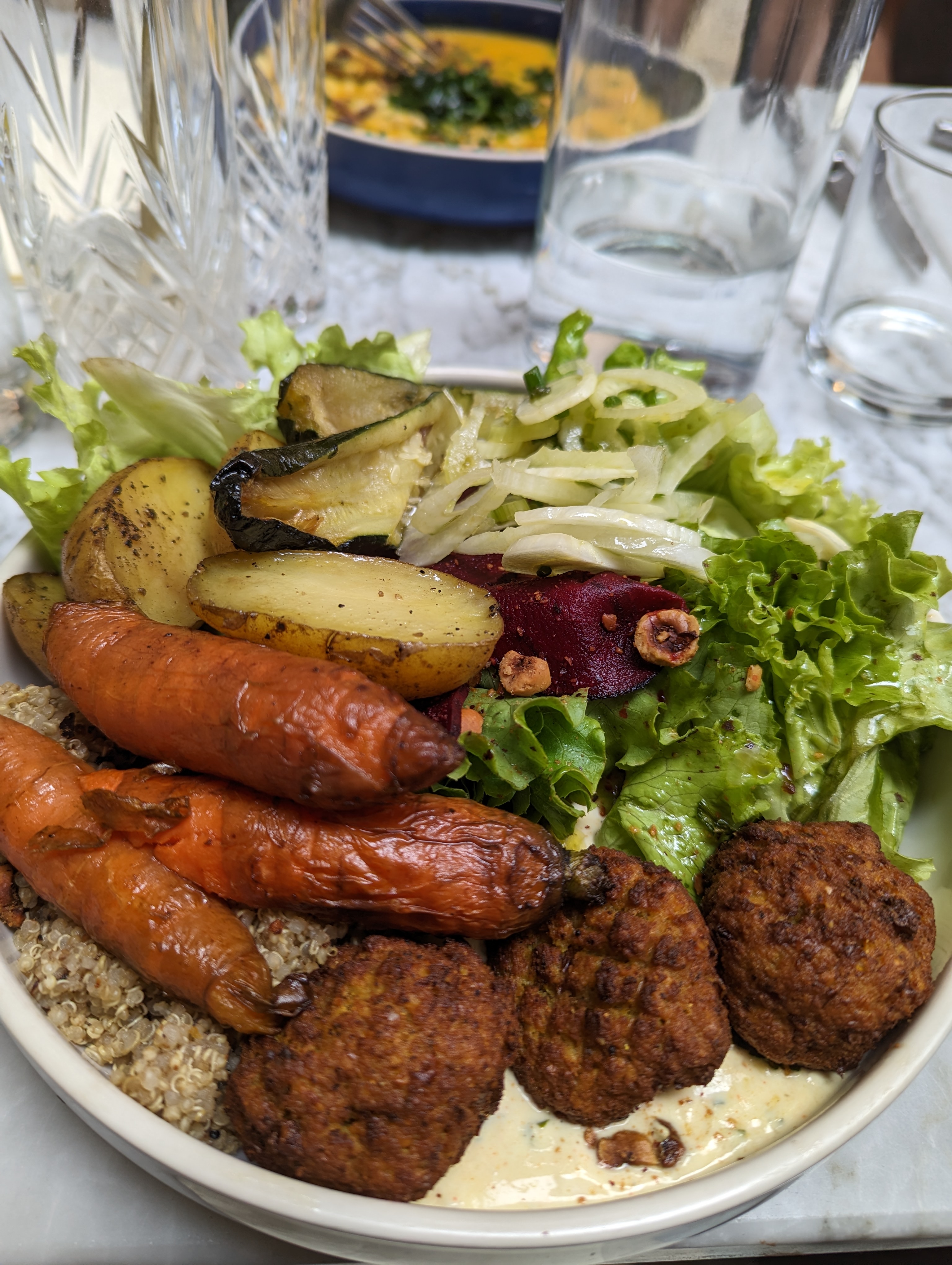 Ambiance chaleureuse, décoration très sympa, service au top et enfin nourriture très sympa. Aucun problème à proposer un plat végétalien (il paraît même qu'un plat à la carte est en préparation). Bref très bonne expérience je recommande chaudement.