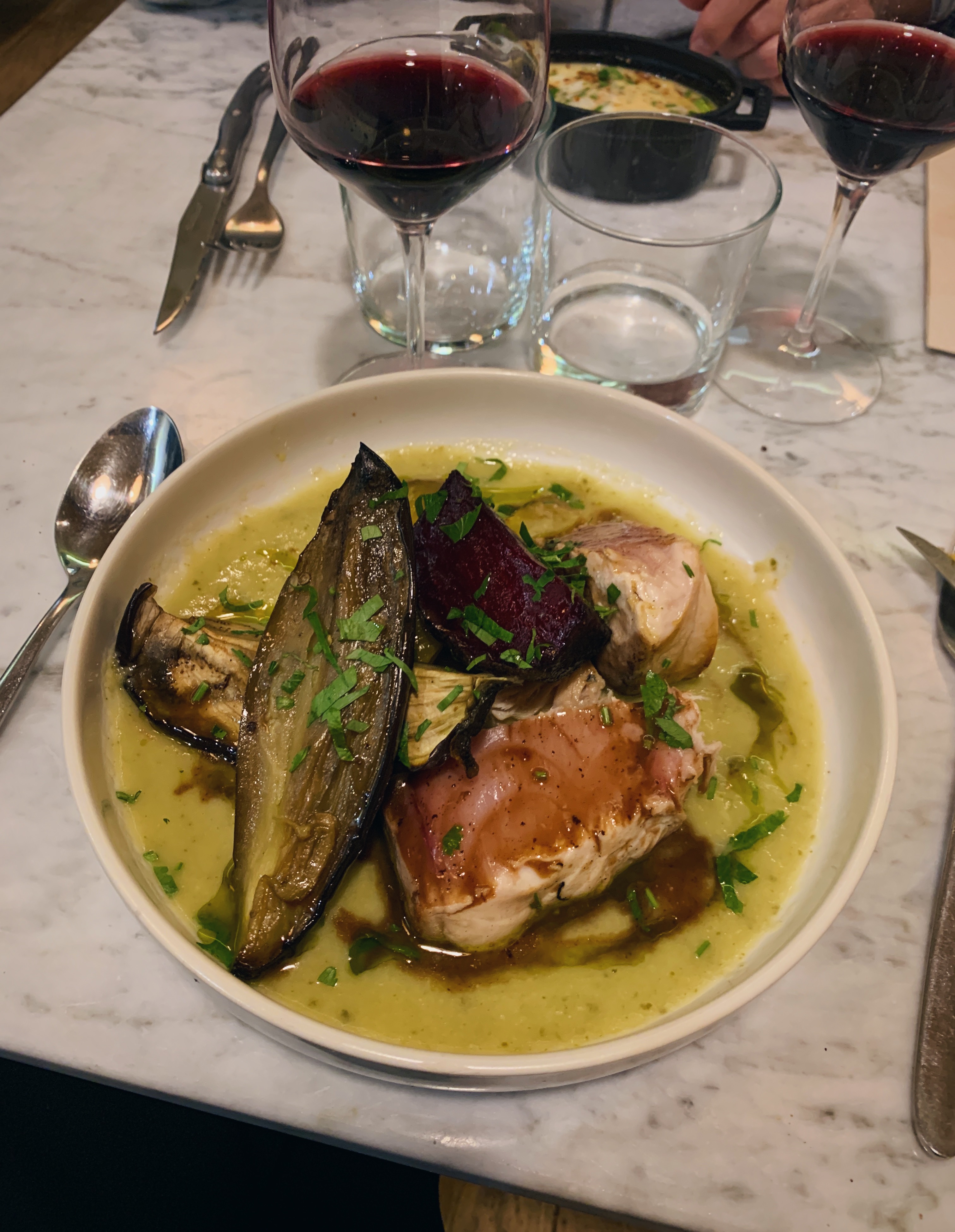Très bonne expérience immersive avec une carte travaillée, aux produits très bien sélectionnés. Service de qualité, plat bien présenté (une côte de cochon parfaitement cuite) par le serveur sympathique (vous le reconnaîtrez avec sa moustache et ses lunettes). Bref très bon moment, je recommande !