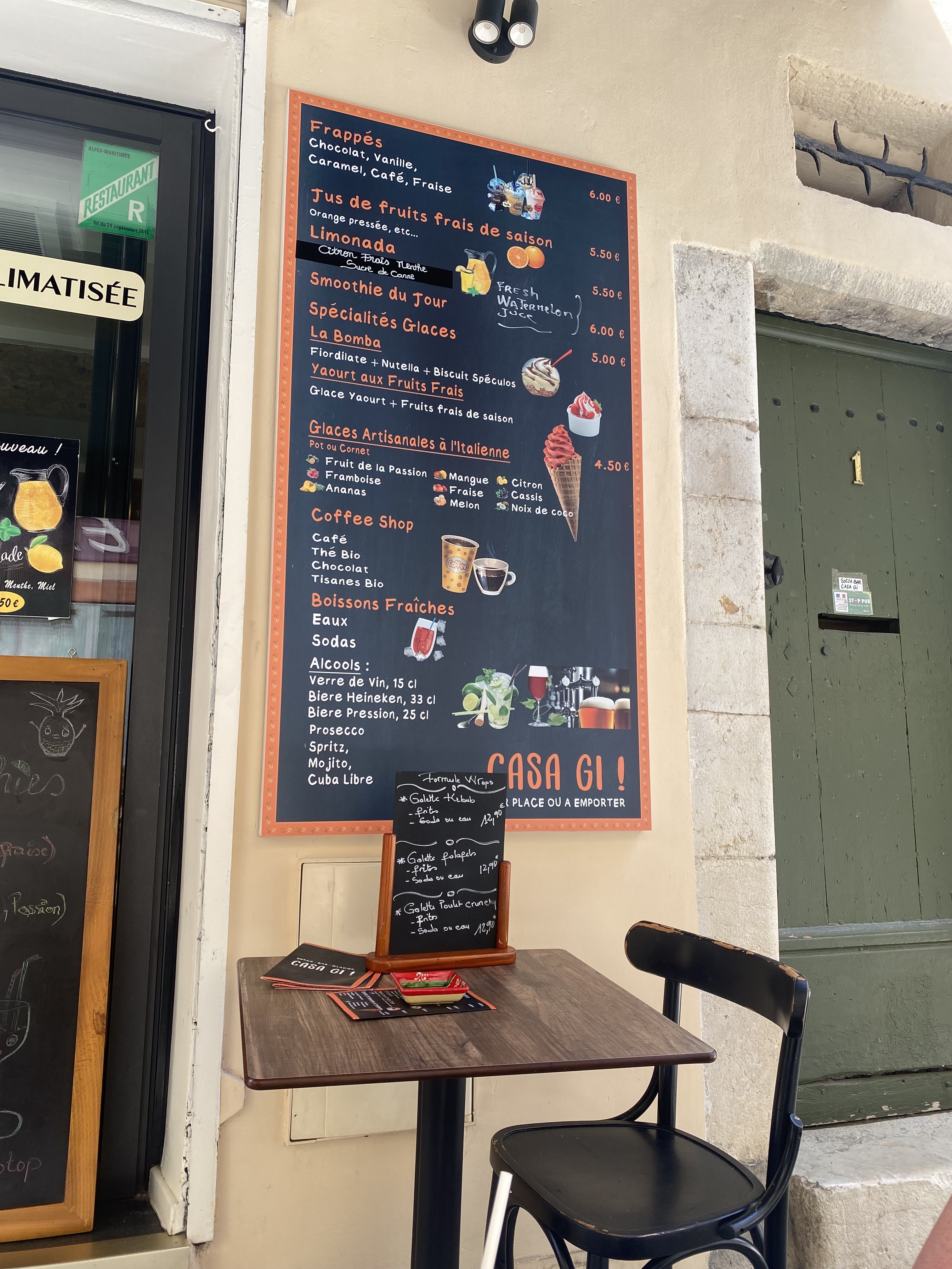 Nous nous promenions dans Antibes et avons décidé de déjeuner, Casa Gi est à l'écart des circuits touristiques habituels, nous avons eu un Beouf Tartare, des frites et une salade verte, un panini poulet et pesto, un fondant au chocolat, 2 cafés et une bouteille de Rosé pour € 45 au total. La nourriture est fantastique, le propriétaire est bavard en français et en anglais. Casa Gi était une excellente trouvaille et je le recommanderais à tout le monde. Le menu est agréable et concis, vous n'avez donc pas à feuilleter 10 pages de nourriture piège à touristes habituelle.