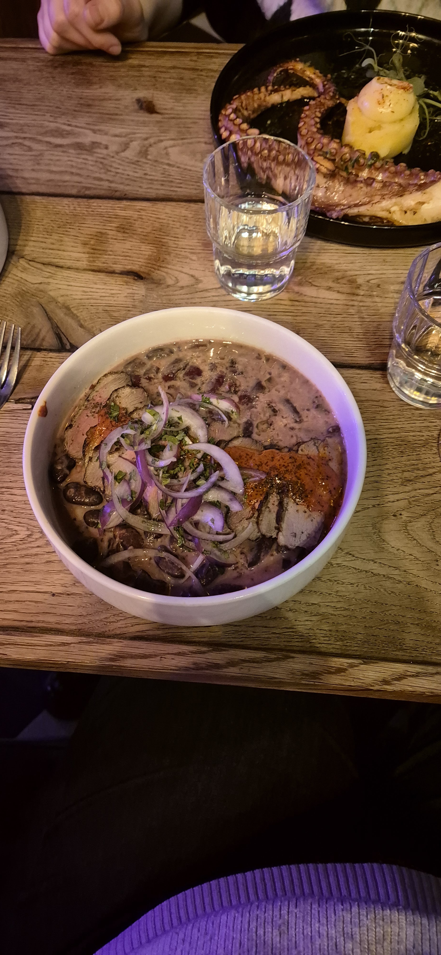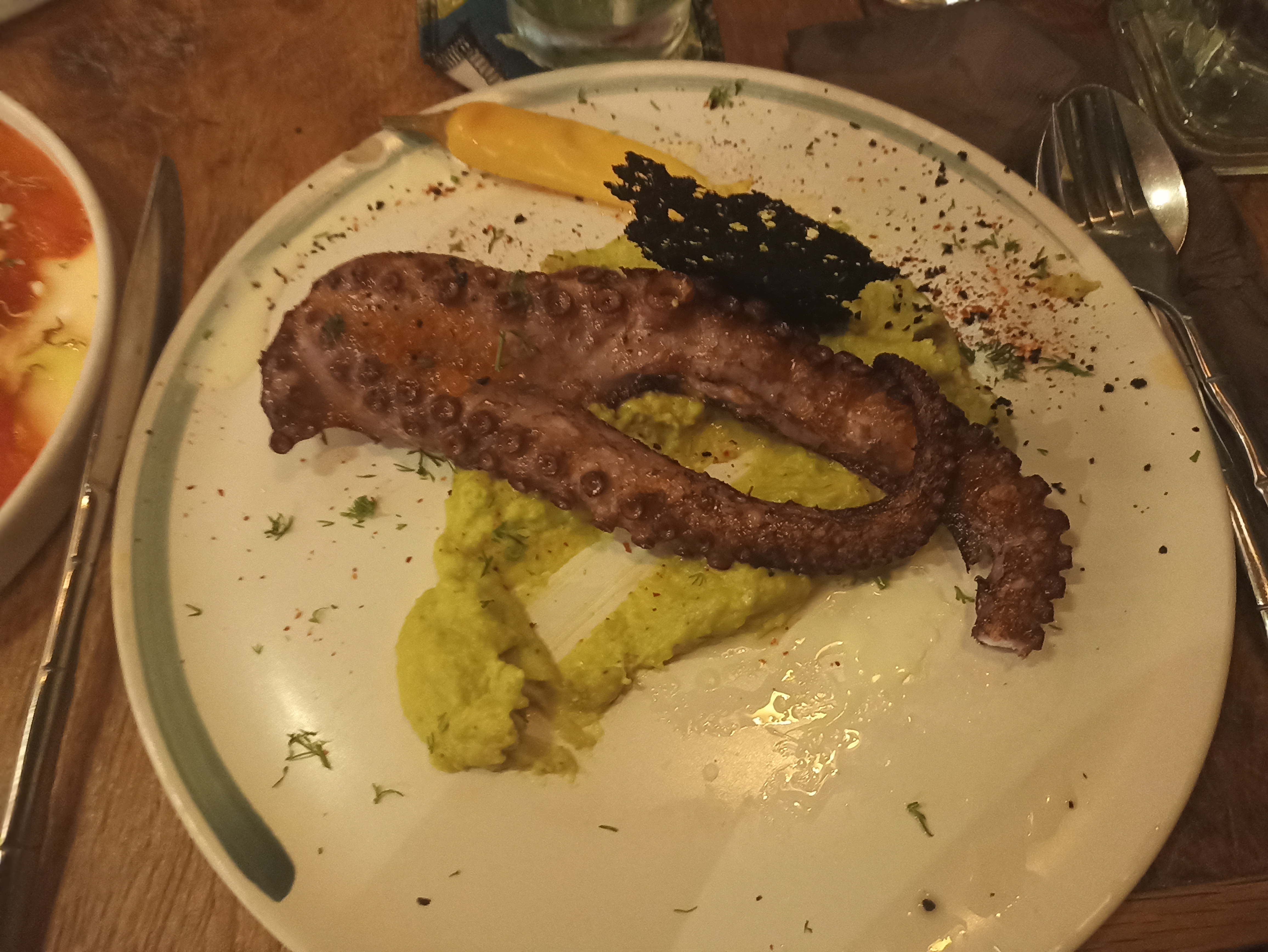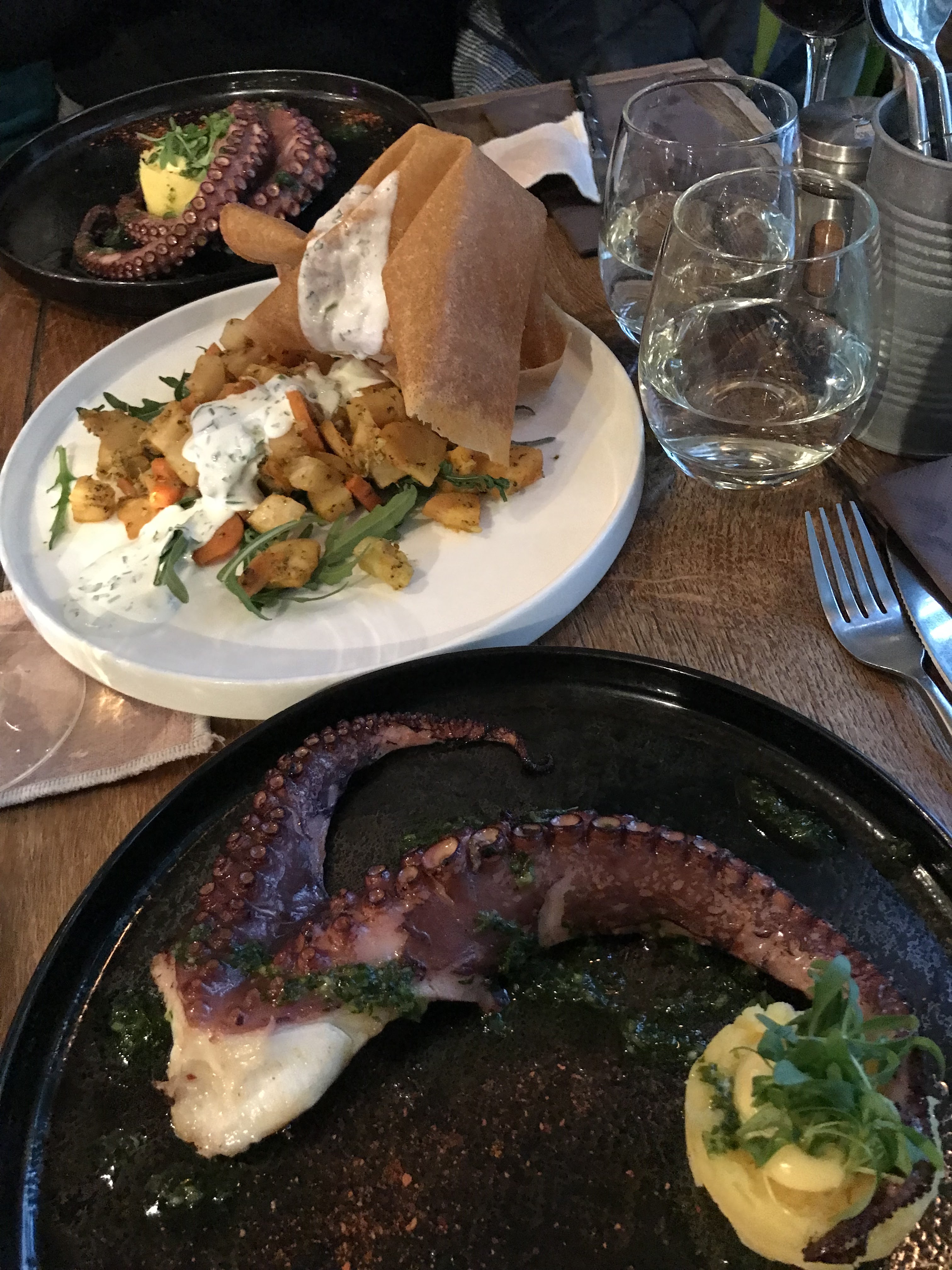 Bon restaurant avec jolie déco ! Un peu déçue car nos poulpes et la purée étaient tièdes. Je suis tombée sur un condiment très piquant dans la purée qui m'est monté au nez. Mais cela reste une bonne adresse avec des serveurs sympathiques.