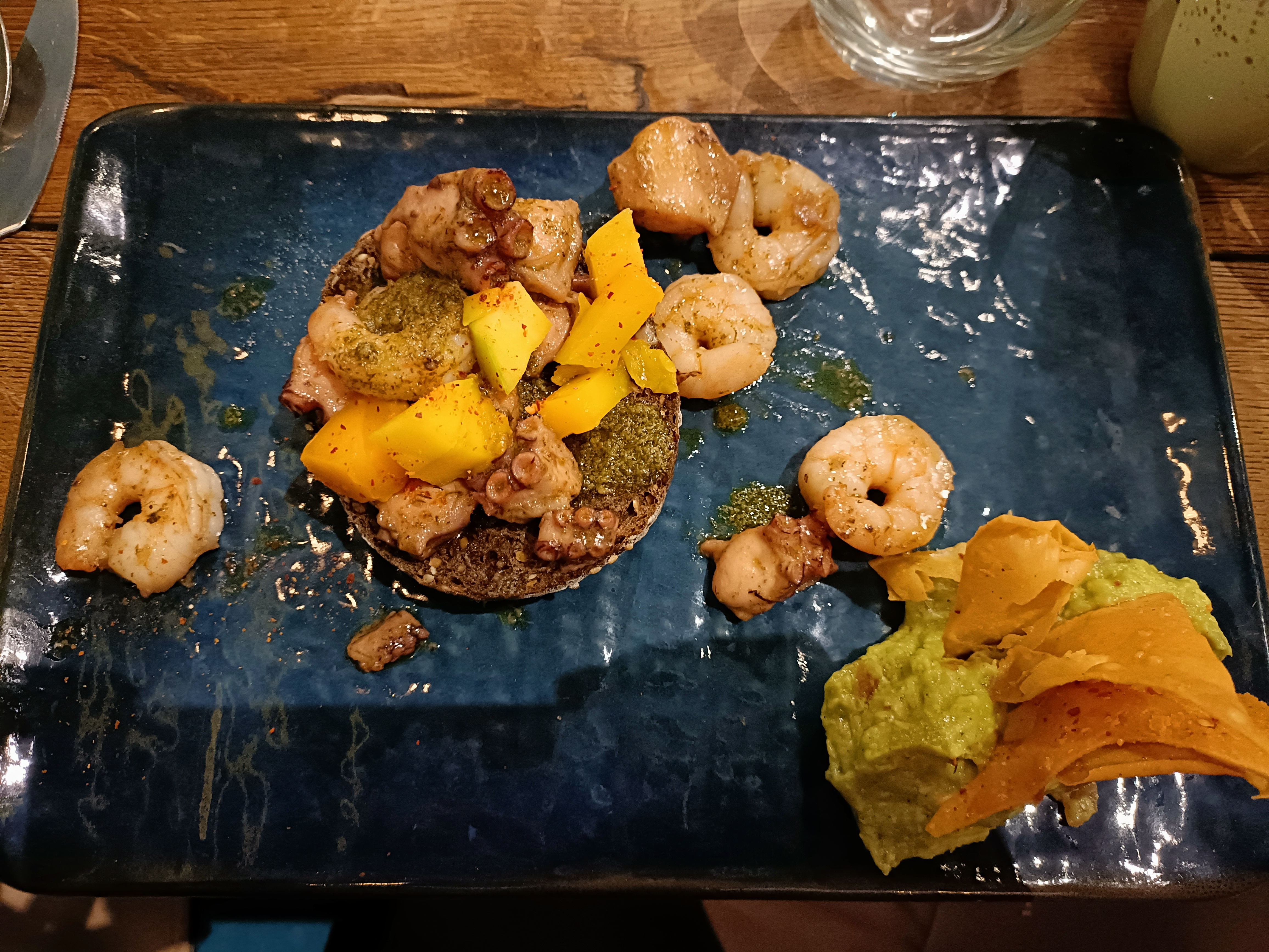 Belle carte, des produits de différents horizons, un service impeccable, et en plus c'était très bon (il manque la photo de la polenta : un délice, une magnifique découverte de saveurs, il faut l'essayer) Cocktail : Spice Invaders Plats : tacos (gésiers + guacamole, sauce piquante + sauce péruvienne (un régal)) & potiron (& la polenta sans photo) Desserts : purée de banane flambée au rhum (chocolat, noix de coco, caramel)