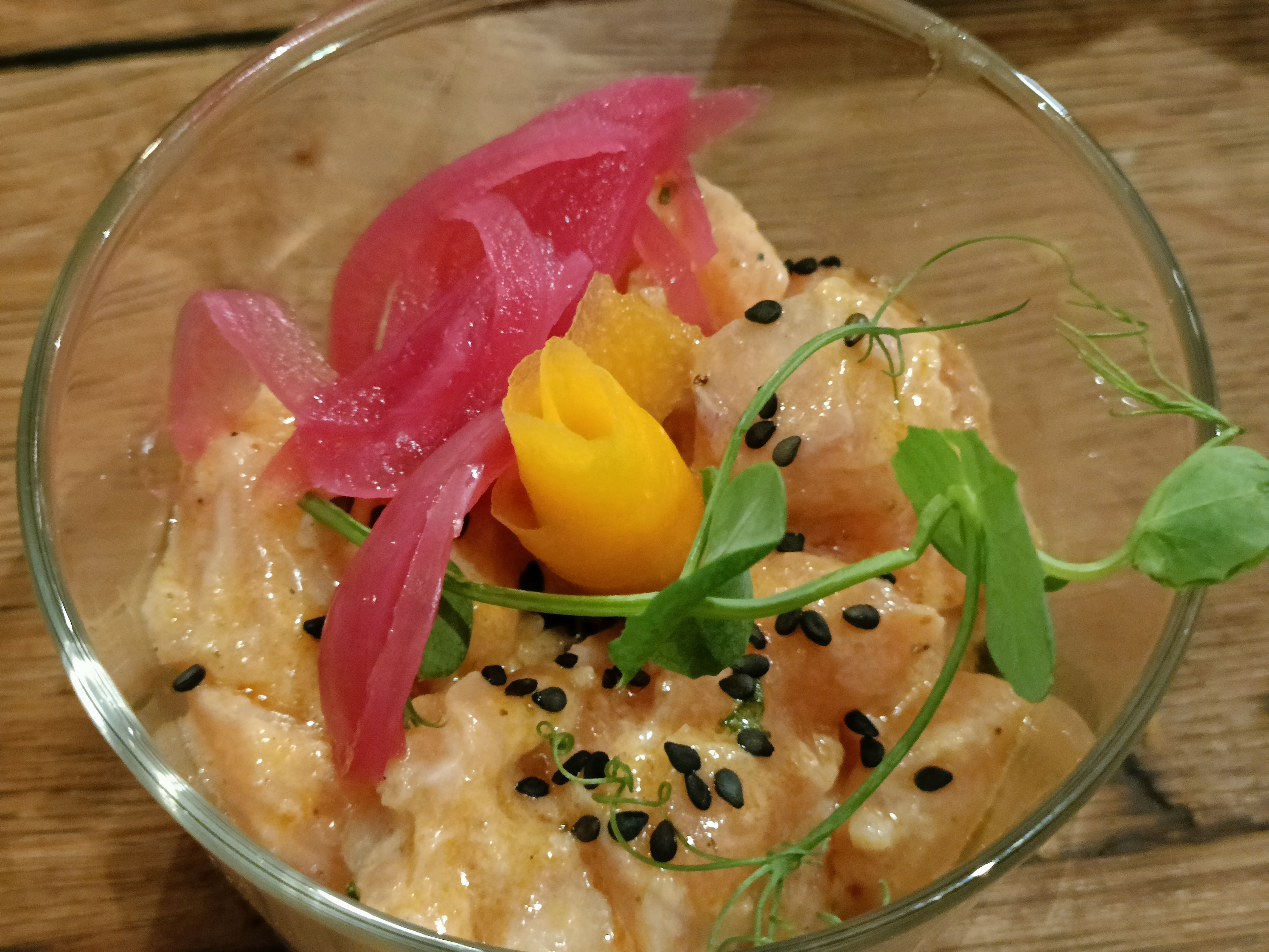 En entrant j'ai de suite été agréablement surpris par le bassin contenant de très beaux poissons. Mais la qualité des plats ma définitivement rendu fan de ce lieu. Tout l'espace est utilisé du coup on est un peu à l'étroit si on est trop grand, mais c'est réellement une adresse à recommander. J'ai pris du poulpe c'était juste excellent. Et leurs accompagnements sont originaux..