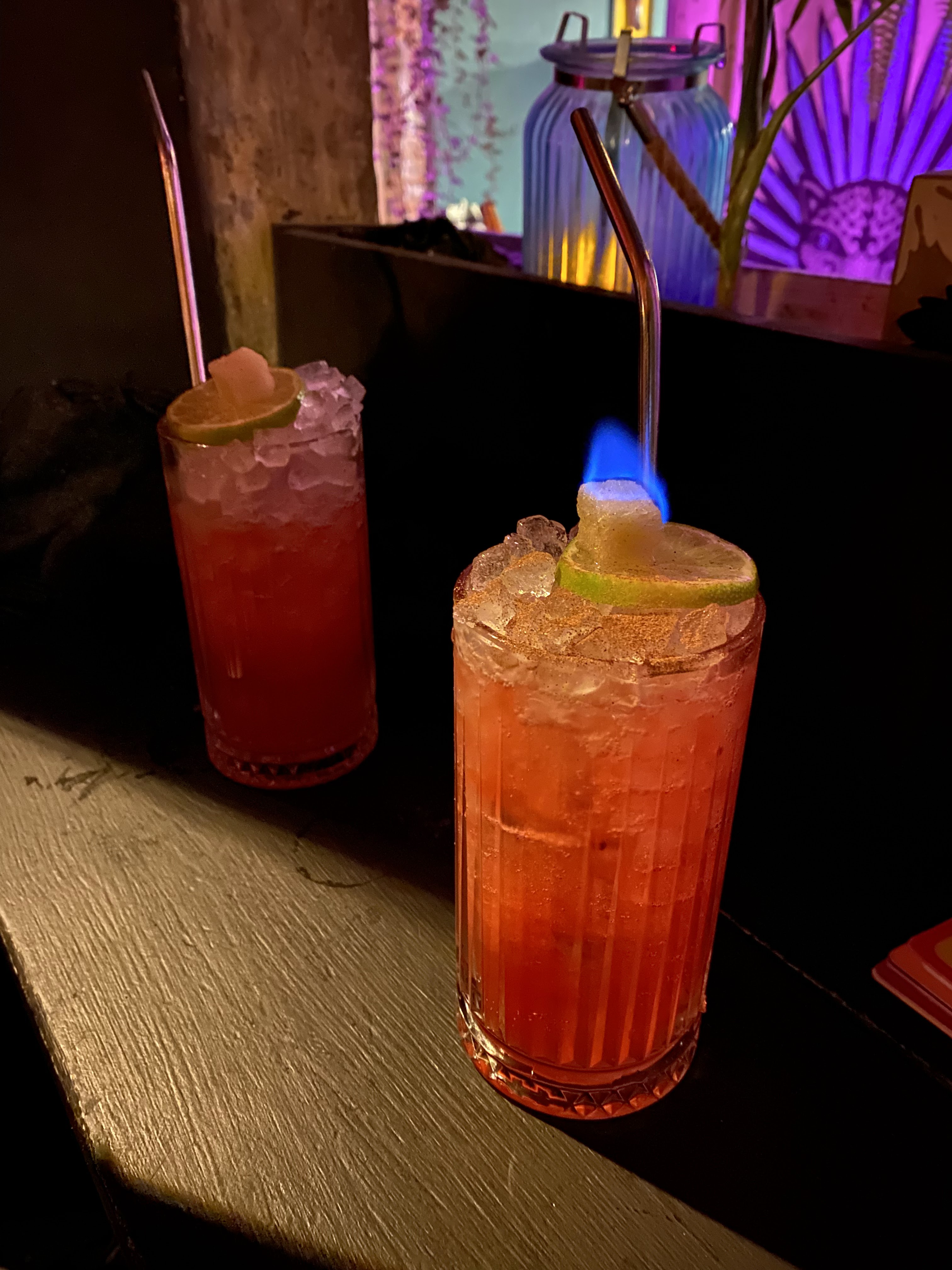 Une fois de plus la promesse de passer une bonne soirée est tenue. Avec un accueil des plus chaleureux, (si si on se sent vraiment accueillis chez vous), nous commençons notre première partie au restaurant... Et là... Catastrophe, le doute s'installe... On n'arrive pas à choisir ! Du coup on se lâche avec Poulpe grillé, Ceviché de Daurade, Courge cuite et sa sauce à tomber par terre, Arepas aux Cèpes, et une Basse côte de Bœuf mijotée pendant des heures avec ses Frijoles. Humm je salive encore. Chef, il faut qu'on parle ! tu nous as fait voyager ❤️. Ce repas accompagné d'un vin rouge Cameneré du Chili 🇨🇱, accord parfait. Nous étions un groupe d'une demie douzaine ? Non juste 2. Un petit dessert pour finir et Hop on change d'endroit pour rejoindre le bar à l'étage, le Pink Flamingo. L'équipe s'active, les shakers virevoltent dans les airs, les cocktails s'animent dans un mélange de saveurs, d'odeurs, de couleurs...le crépitement des étincelles sur le Thym passé au chalumeau... Quel spectacle les amis. Louis nous propose une création originale, un cocktail hors carte à base de café, rhum, épices... Un envoûtement. L'équilibre parfait des saveurs, le café laisse toute la place au rhum et aux épices pour qu'ils puissent s'exprimer avec délicatesse. Un vrai travail d'orfèvre, ou d'équilibriste. Bon bref vous aurez compris, pour notre 4ème visite dans cette Cantina Tropicale nous sommes toujours aussi conquis. Merci à toute l'équipe, et ? Ah si, un petit conseil... ... Ne changez rien. Géraldine et Xavier