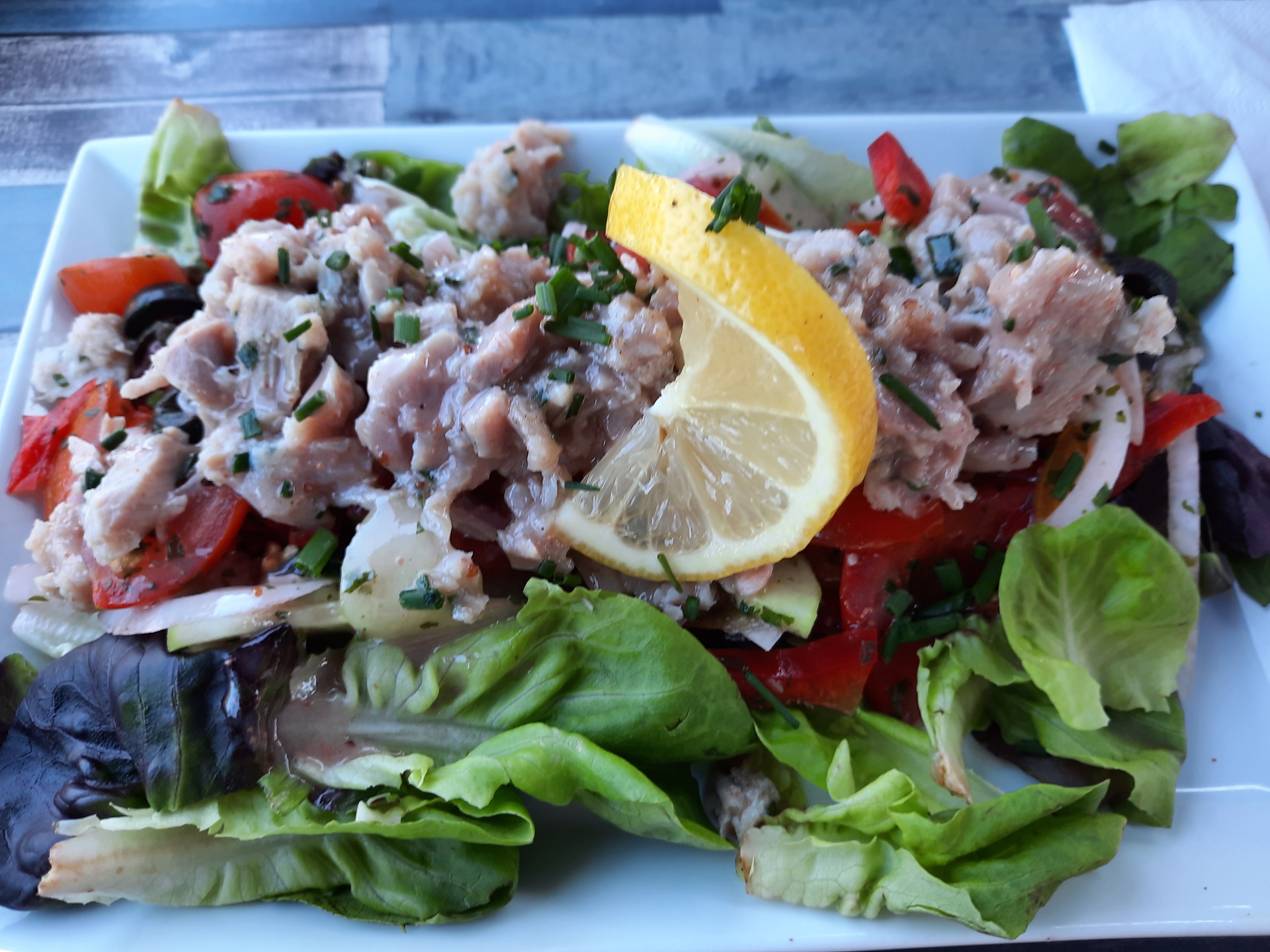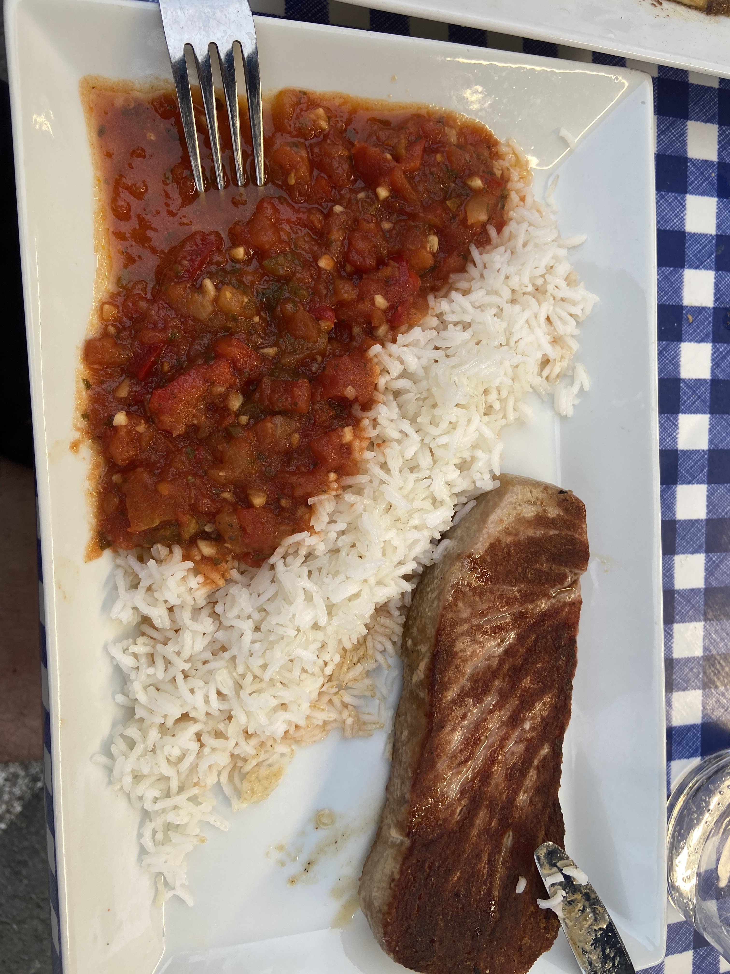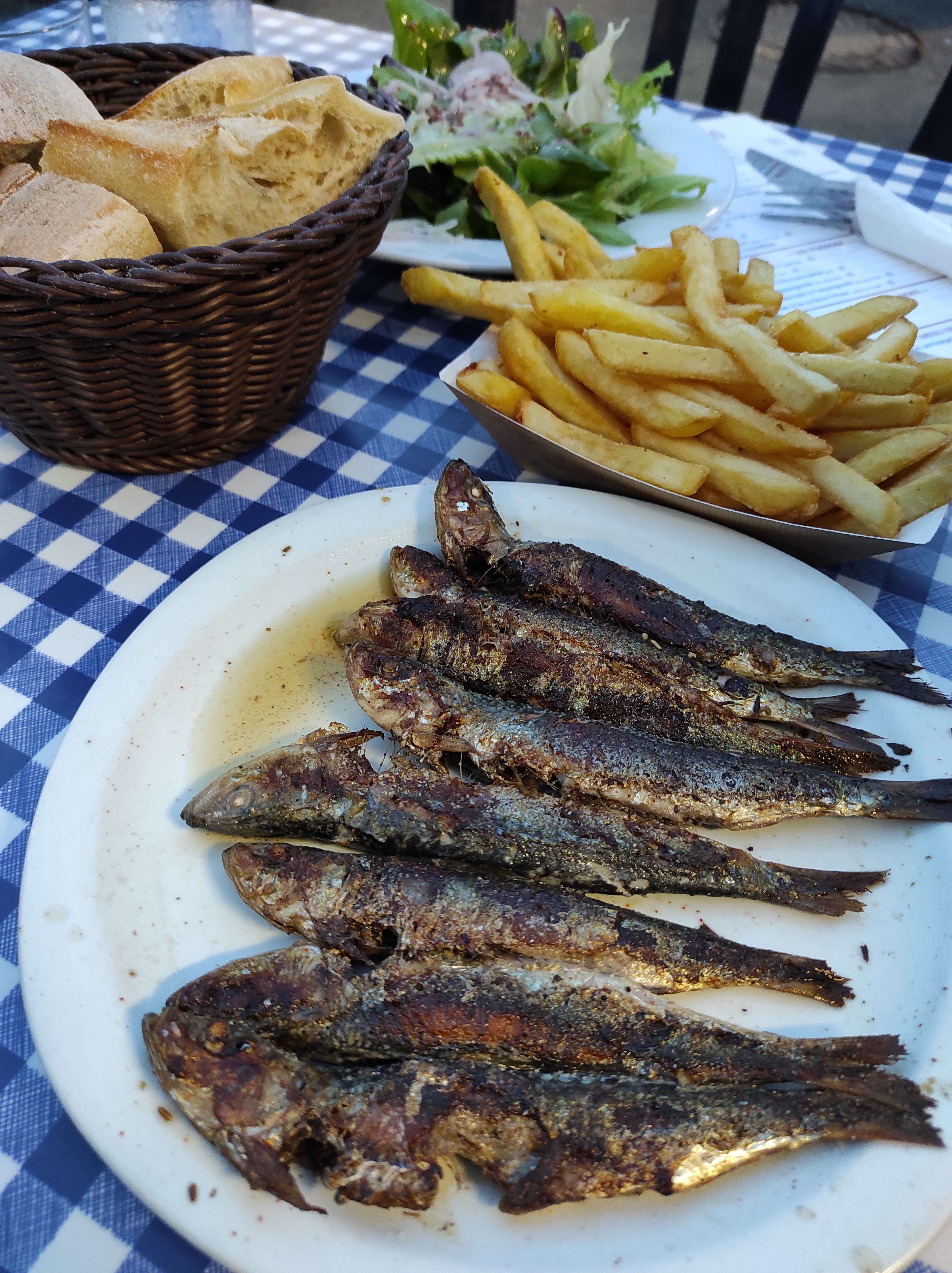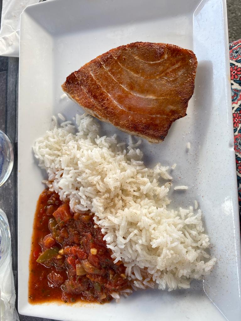 Direct 5 étoiles, ok il faut venir vers 18h30/18h45, peut-être boire un verre avant, et à 19h ouverture du resto et il y a la queue donc anticiper. Pour les entrées on a pris des sardines grillées qui étaient super bonnes et une salade de morue pomme de terre, très bon ! Et plats, le pavé de thon frais, le filet de dorade frais… Accompagnement clean, du riz simple, c’est sain, c’est bon avec sa petite ratatouille… C’est juste génial, frais, de la bouffe saine. Quoi demander de plus. Alors oui, il faut être un petit peu patient avoir le temps, il y a du monde mais on est en vacances, donc on s’en fou.