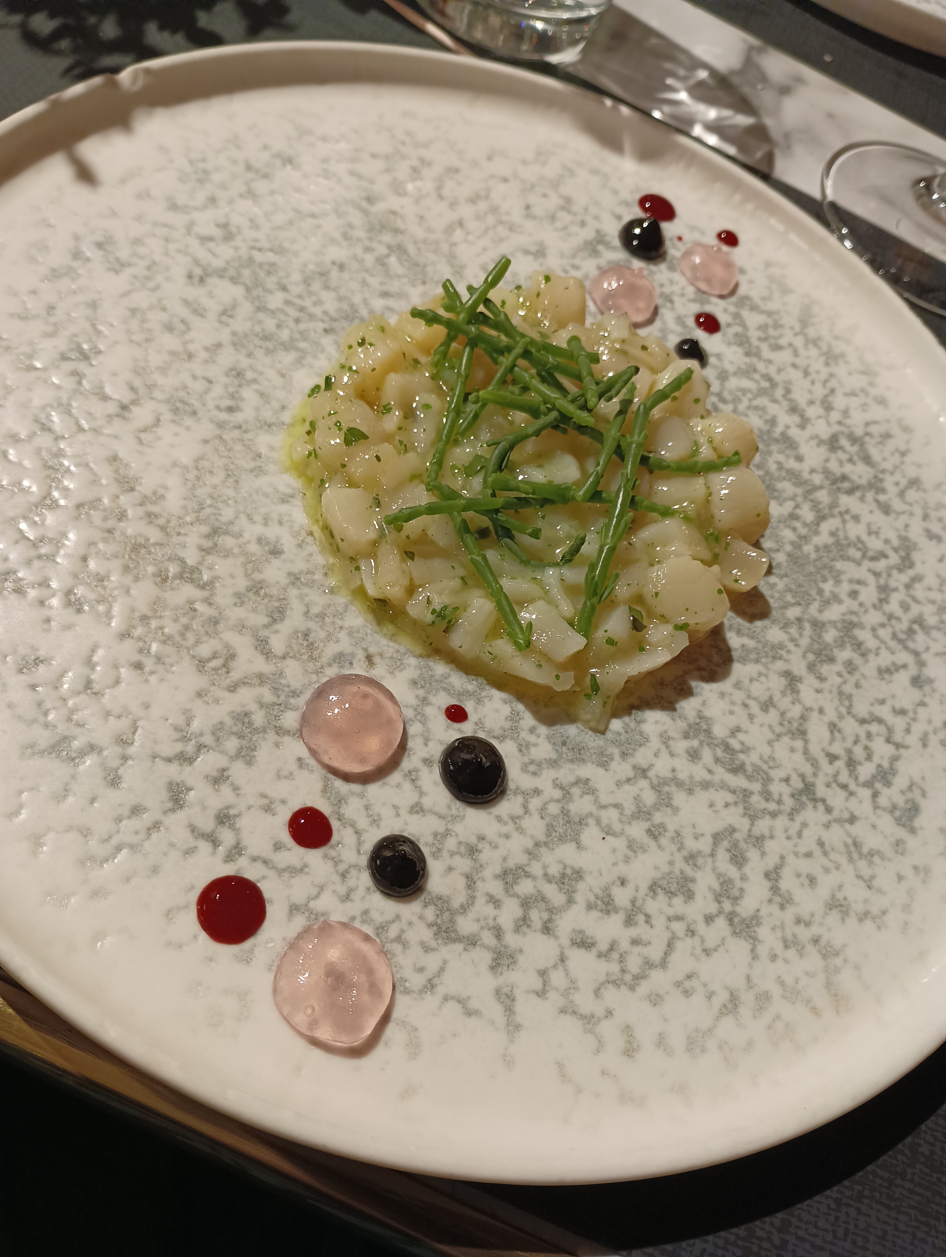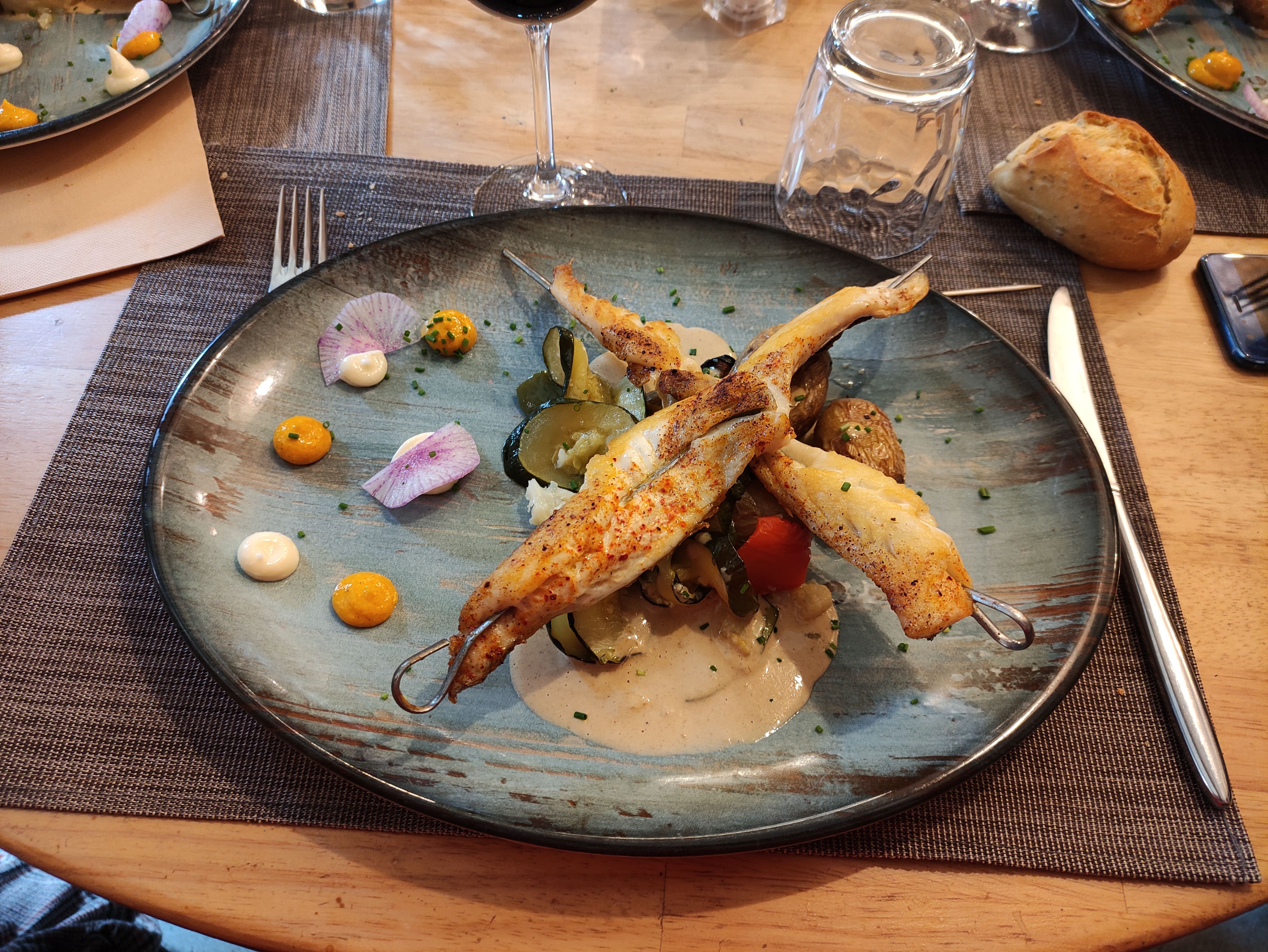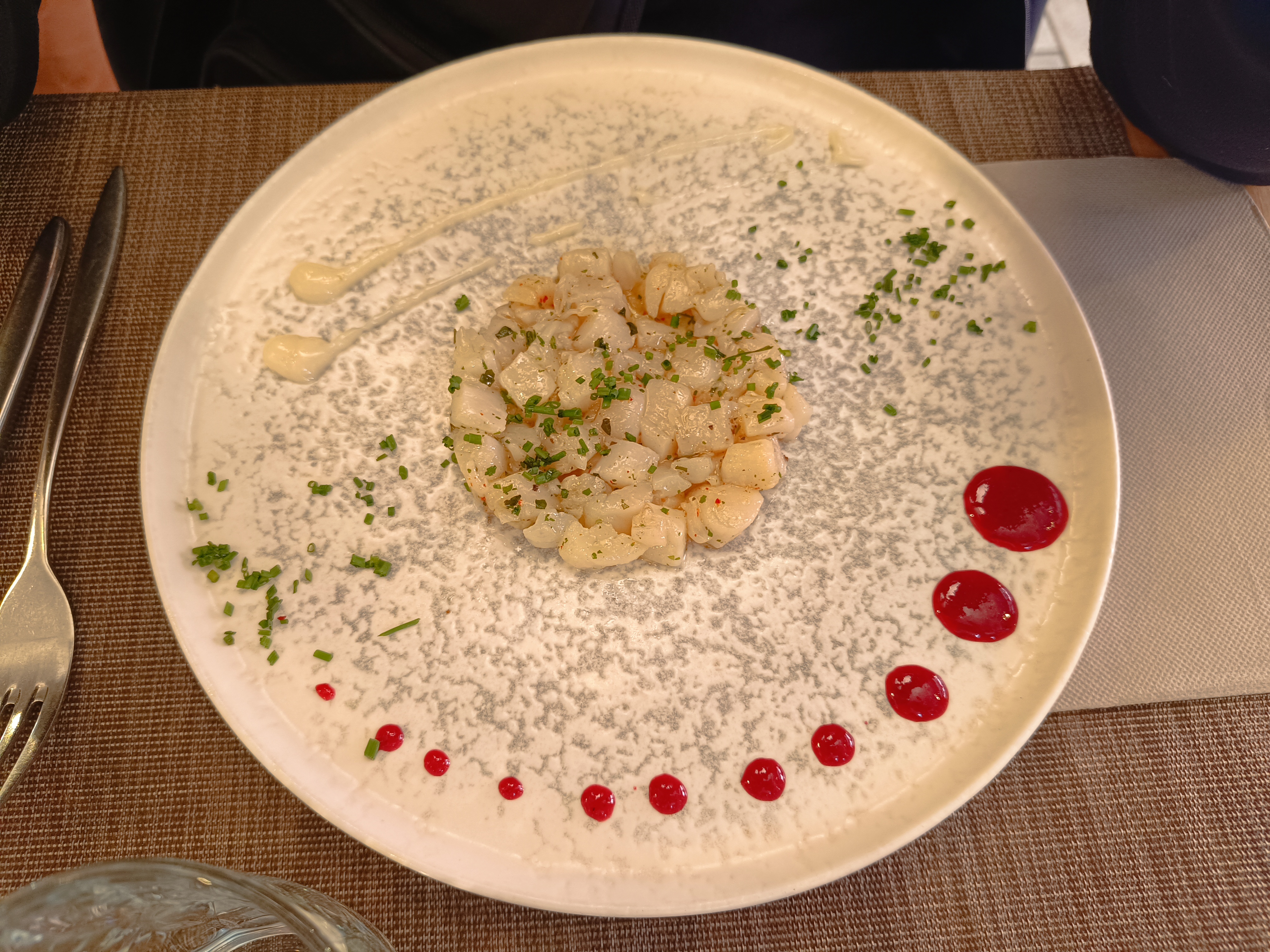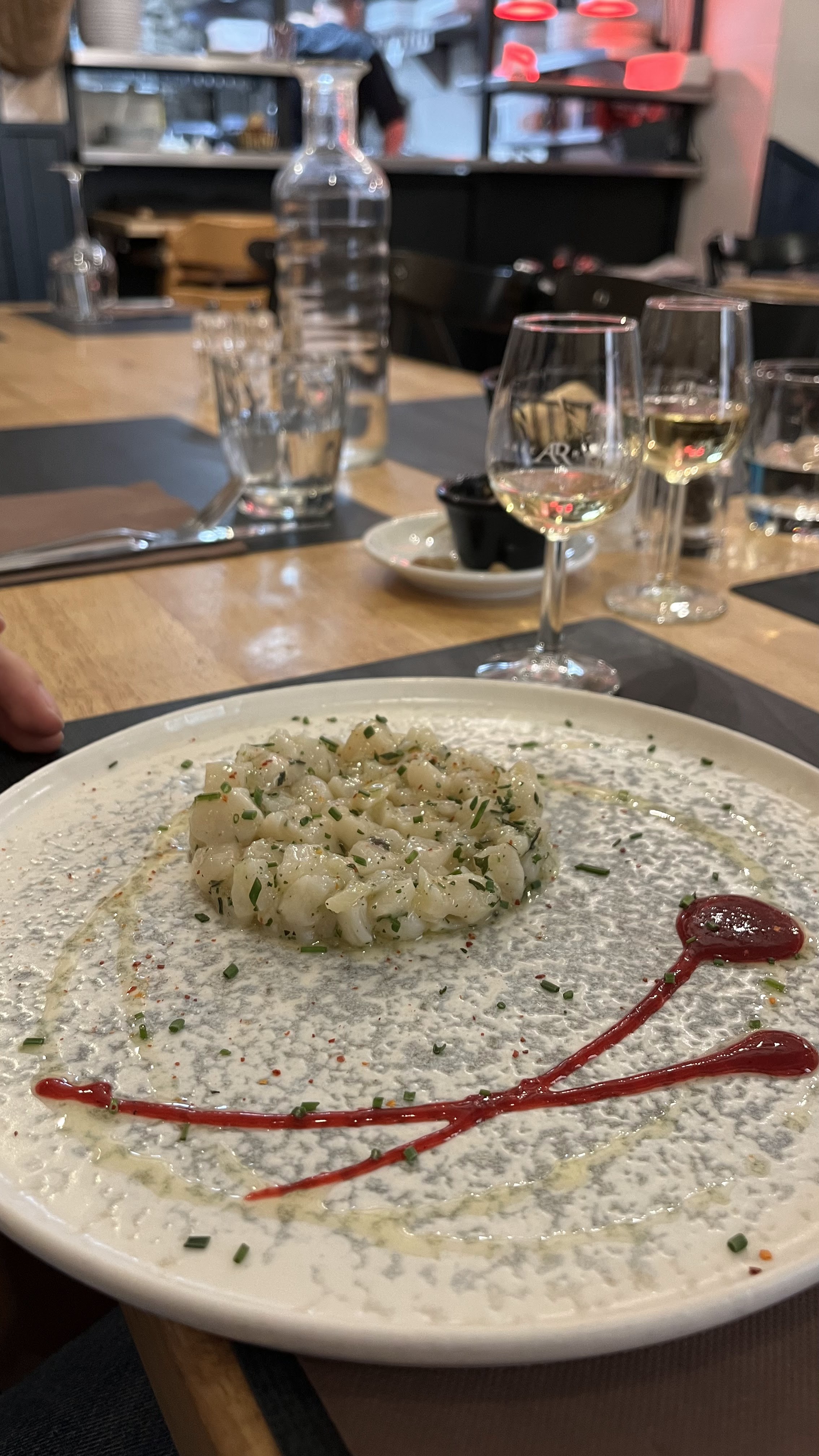 C'était tellement bien que j'ai ressenti le besoin d'écrire mon avis dès mon retour à l'appartement. Des entrées, un ceviche et un tartare de pétoncles ; les deux sont vraiment bien préparés et parfaitement assaisonnés. Et copieux. Nous avons eu une poutre de mer entière (cuit au four je pense) avec des parures de courgettes molles, des oignons caramélisés et des pommes de terre nouvelles au four. Le tout cuisiné à merveille. Terminé avec le trio café désert (pas de crème fouettée en vue, contrairement à la plupart des autres offres à proximité). Le tout accompagné d'un beau vin blanc produit localement, et pour la qualité une facture très raisonnable. Dans l’ensemble, c’est un dîner fabuleux, un excellent service et dont nous nous souviendrons certainement.