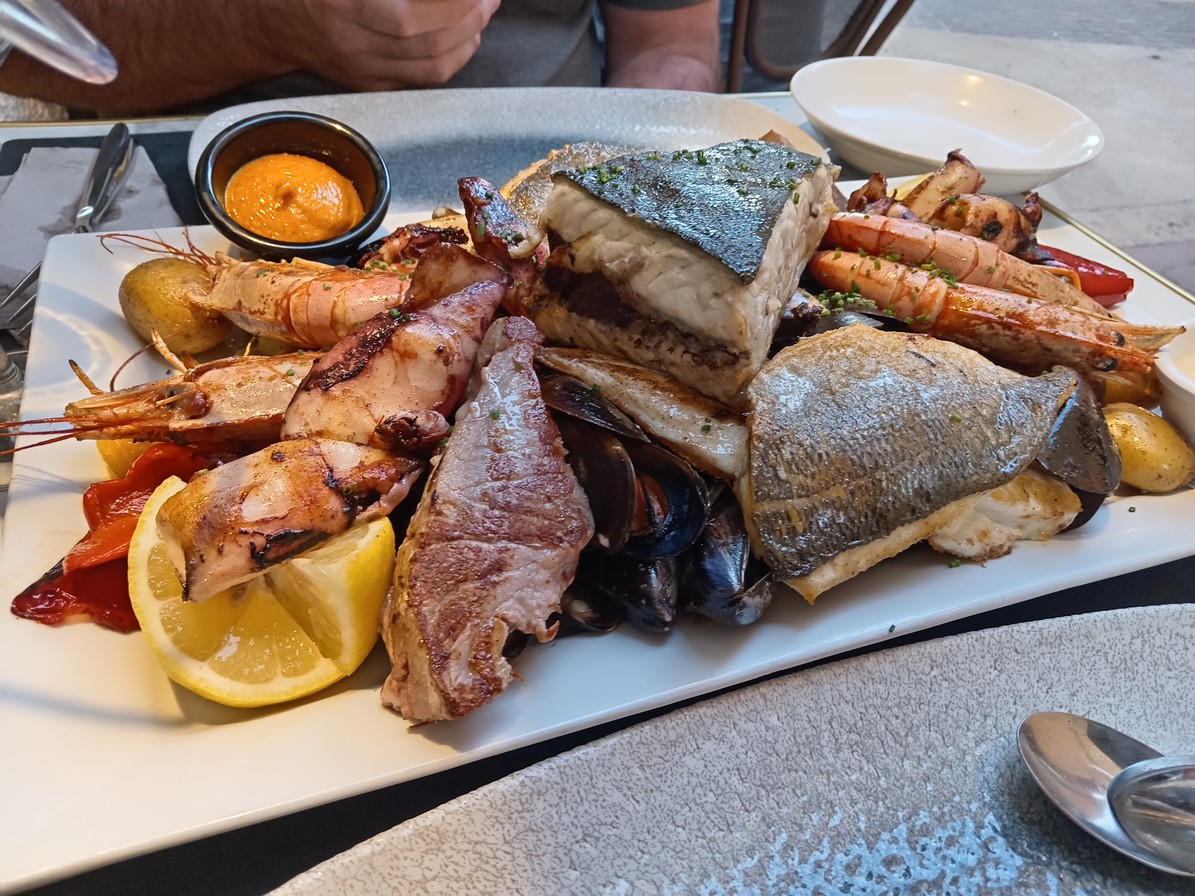 Très bonne parillade de poissons, juste un peu trop d'huile et manque de sel. Très bon accueil et bon service également.