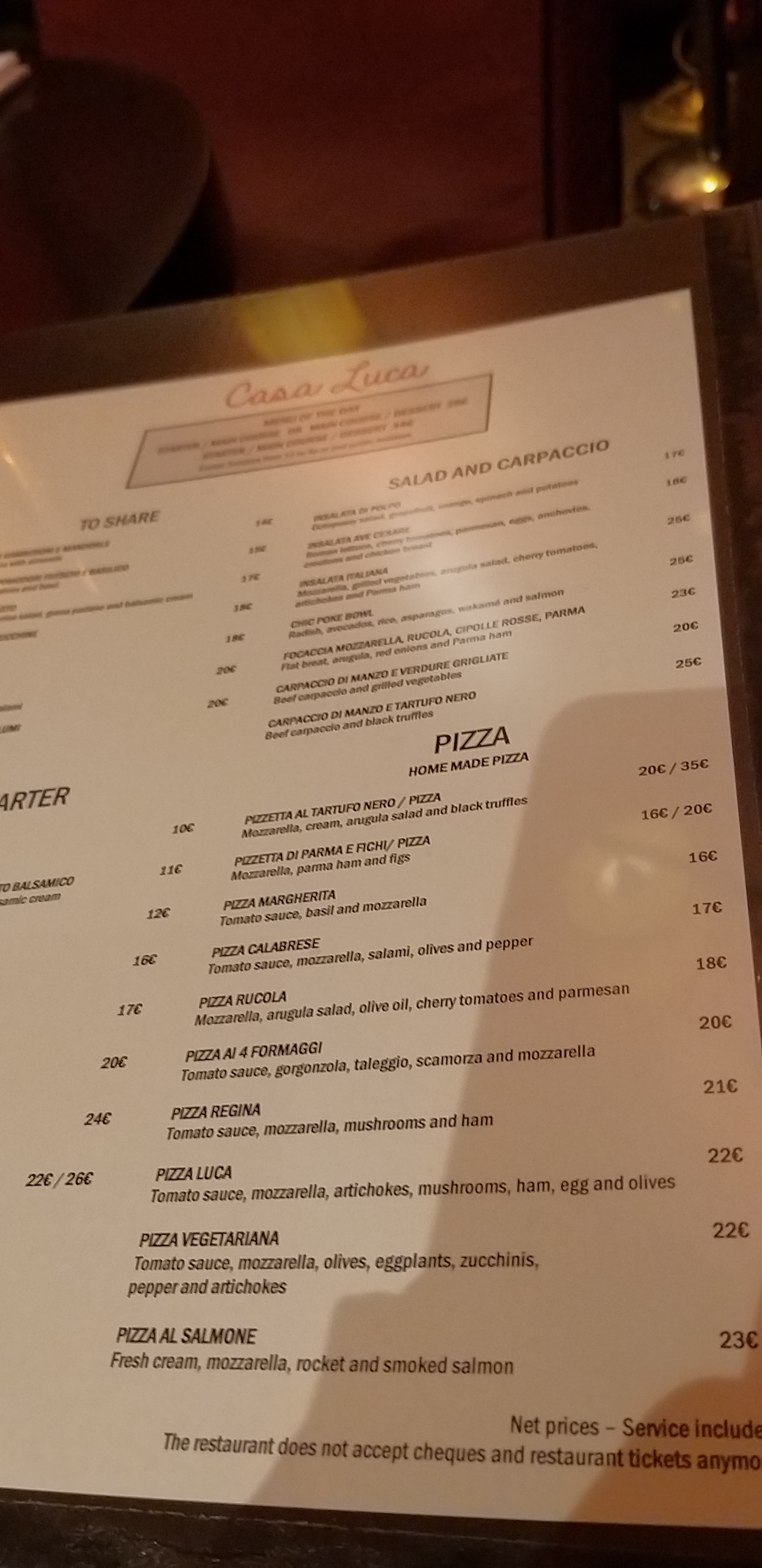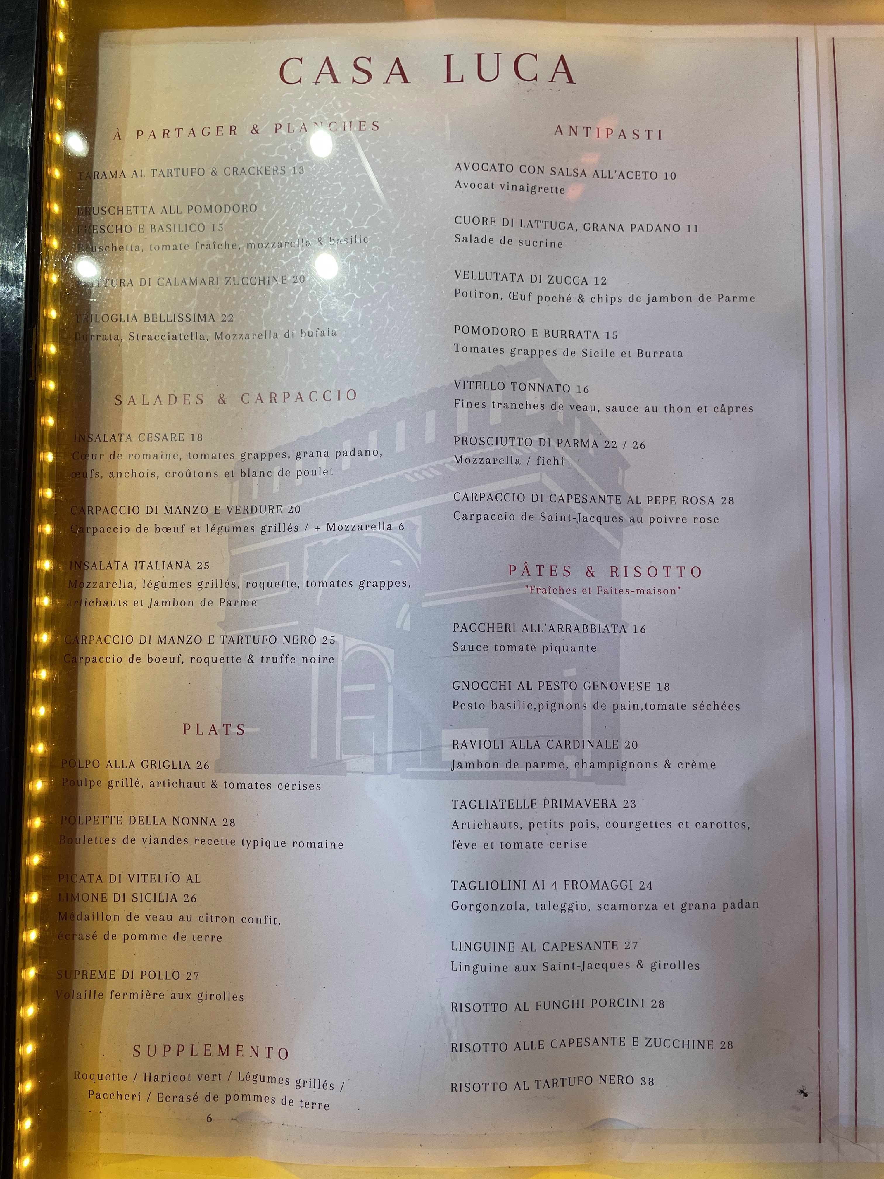 Casa Luca Restaurant italien à Paris près de l'Arc de Triomphe de l'Étoile. La pizza est tellement délicieuse. Les décorations de couleur rouge avec des lumières jaunes sont si belles la nuit. J'ai adoré un pot d'eau.