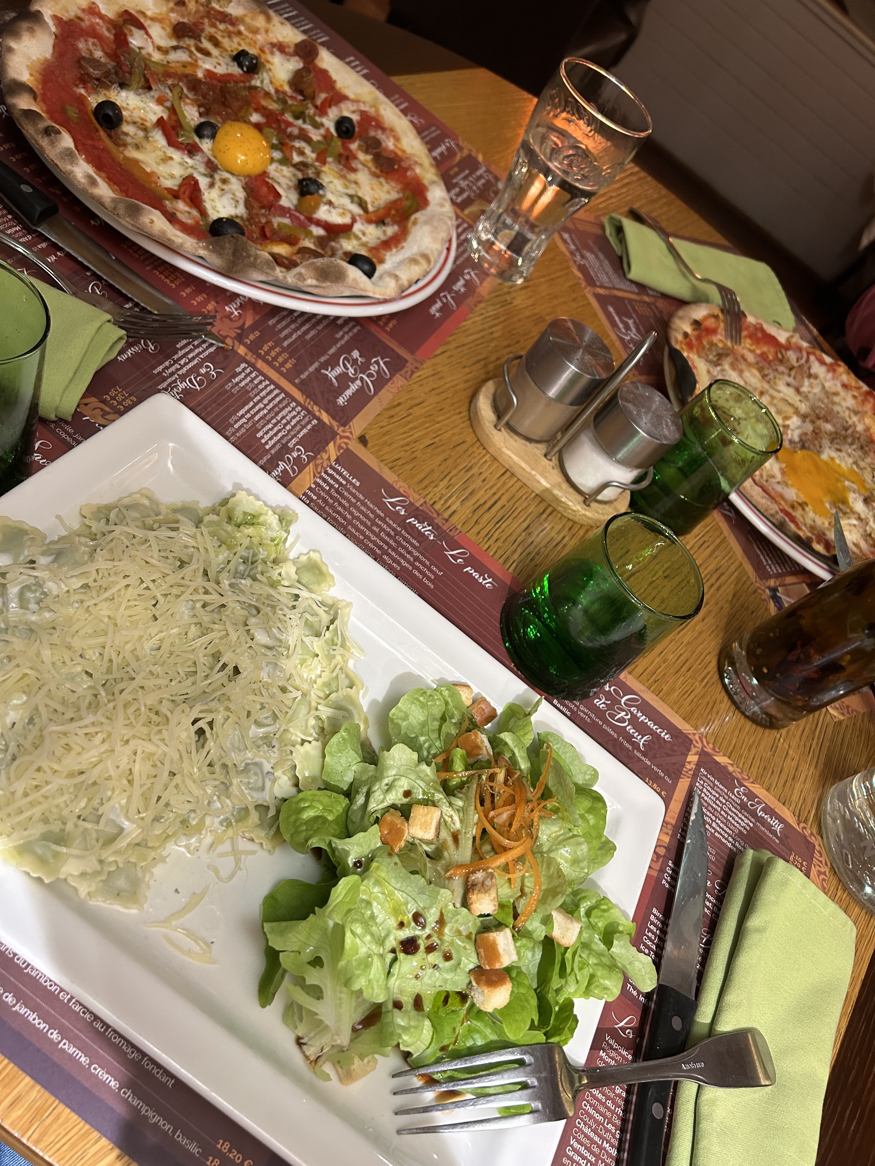 ravioles soi-disant farcis au fromage, je me retrouve avec des mini ravioles ricotta/épinards plutôt pauvre pour un restaurant soi-disant italien… le dessert était bon de plus notre table était trop proche des toilettes (passages, bruits, odeurs…)