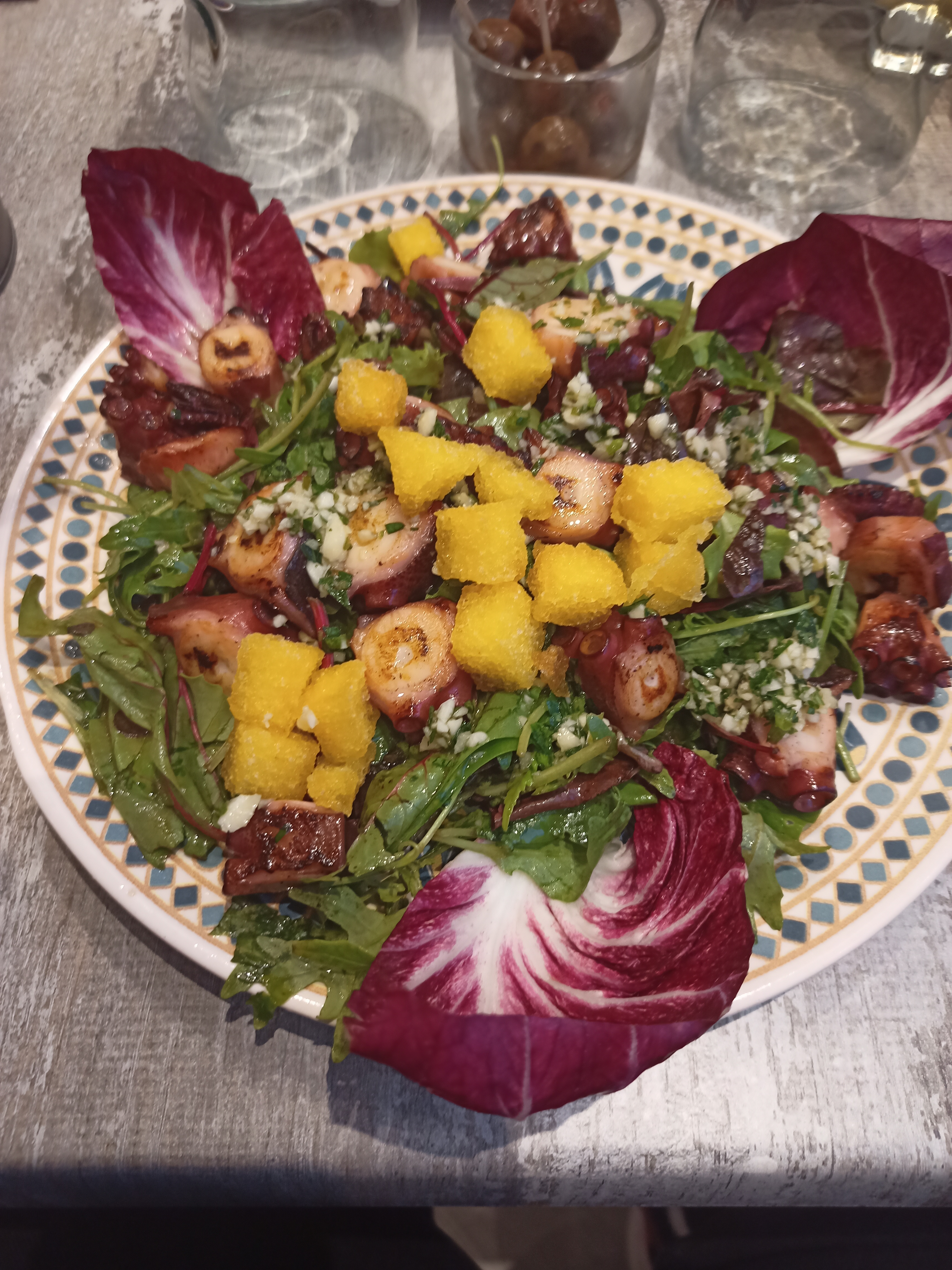 La salade de poulpe est extraordinaire Par contre j'ai été un peu dessus par l'escalope milanaise. Dommage la sauce tomate était un peu acide à mon goût. Le tiramisu traditionnel un incontournable a déguster..... Très copieux. Très bonne soirée passée