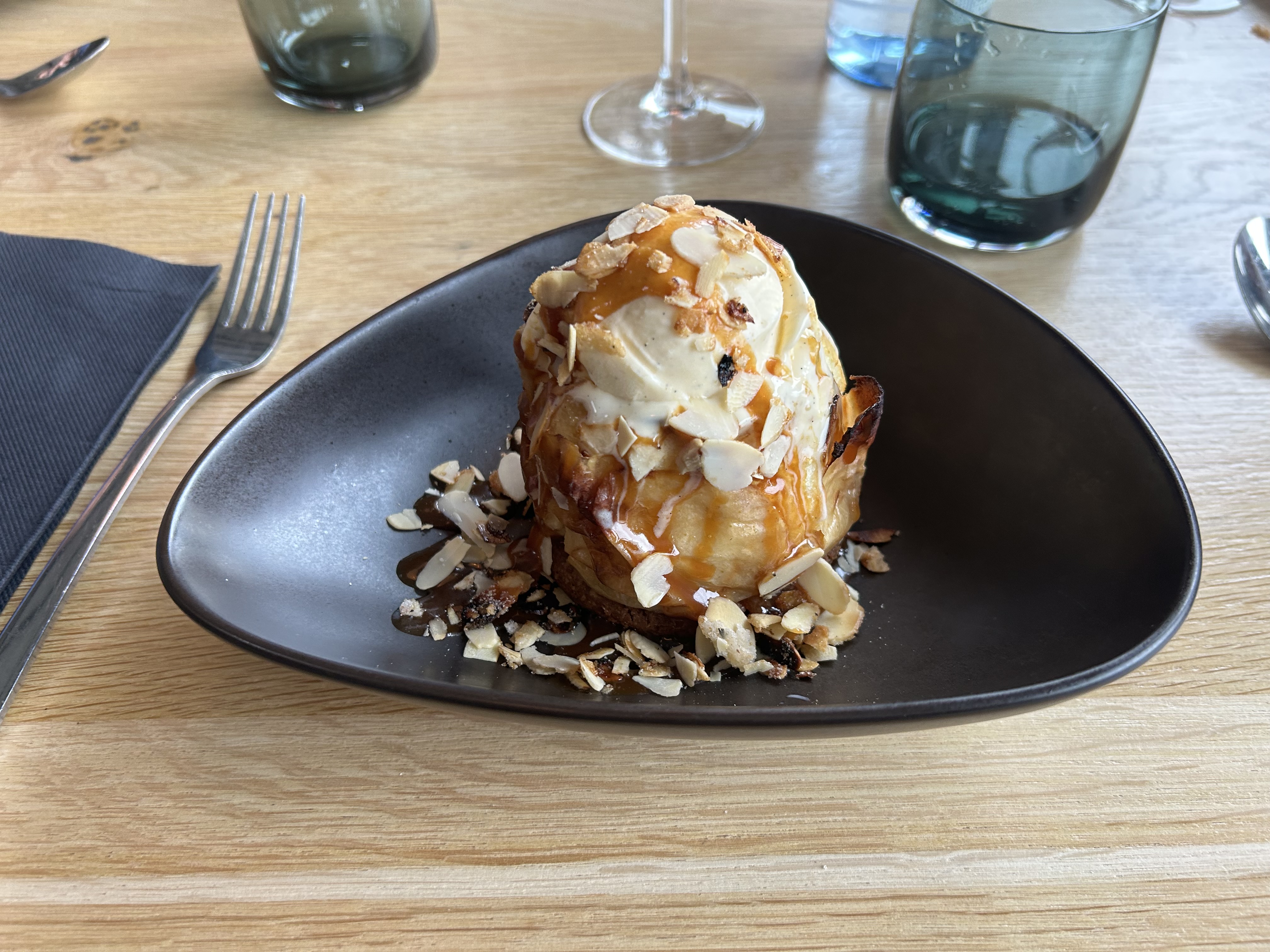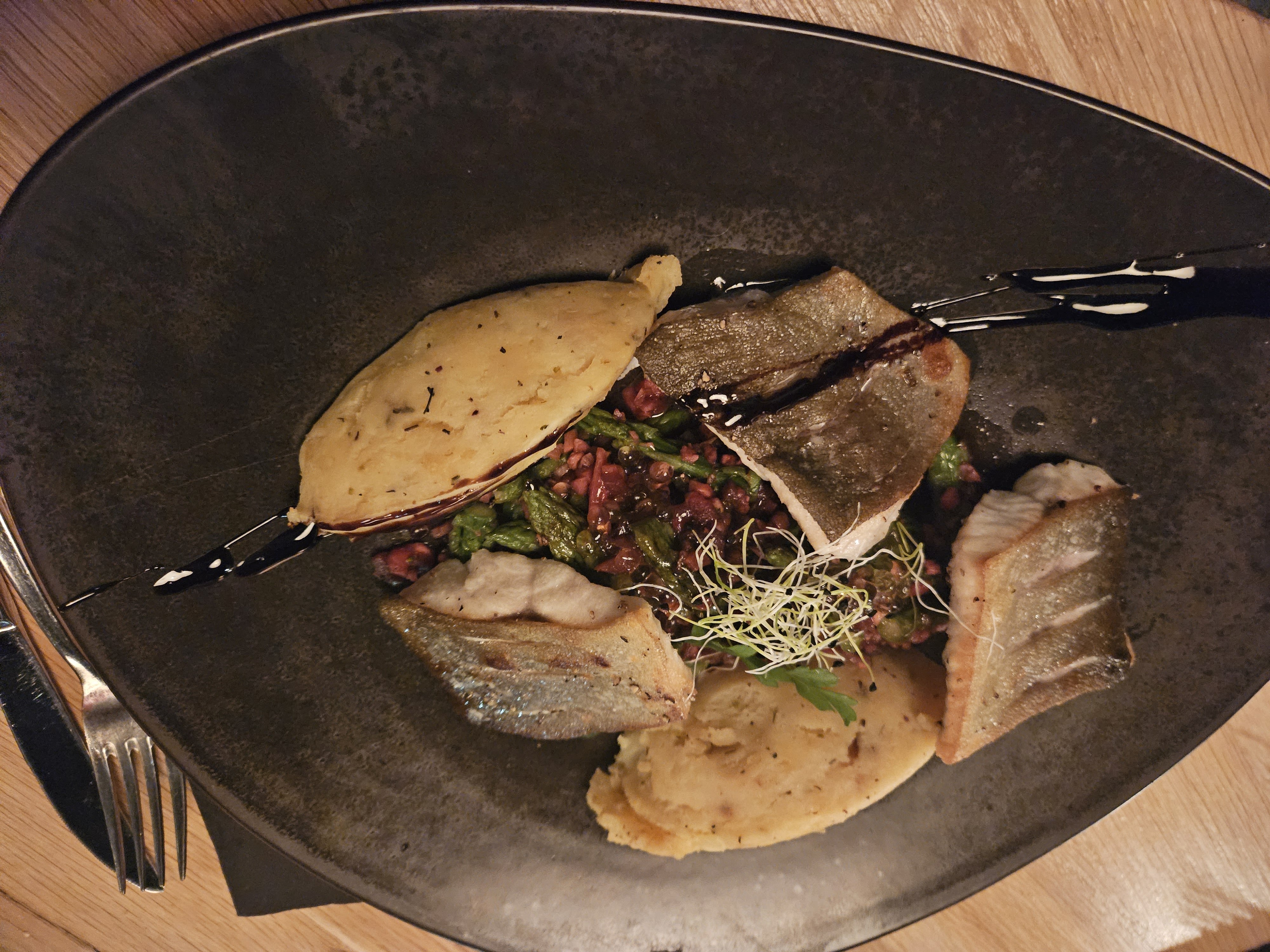 Quand j'ai vu mon plat j'ai fait WOW 🤩. Quel magnifique filet de bar grillé, bien présenté, subtil, rafiné. Il y a de la quantité, j'ai bien fait de ne pas prendre d'entrée. La tarte maison accompagnée e de glace vanille et chantilly est bien copieuse également. Pour les parents de -6 ans je conseille de prendre un plat pour deux sauf si entre temps un autre plat moins copieux sera proposé pour les enfants en bas âge. Nous avons eu très peu d'attente, serveurs très souriants. Grand parking sur place pour la zone. Très bonne adresse, à ne pas manquer si vous êtes dans le coin !