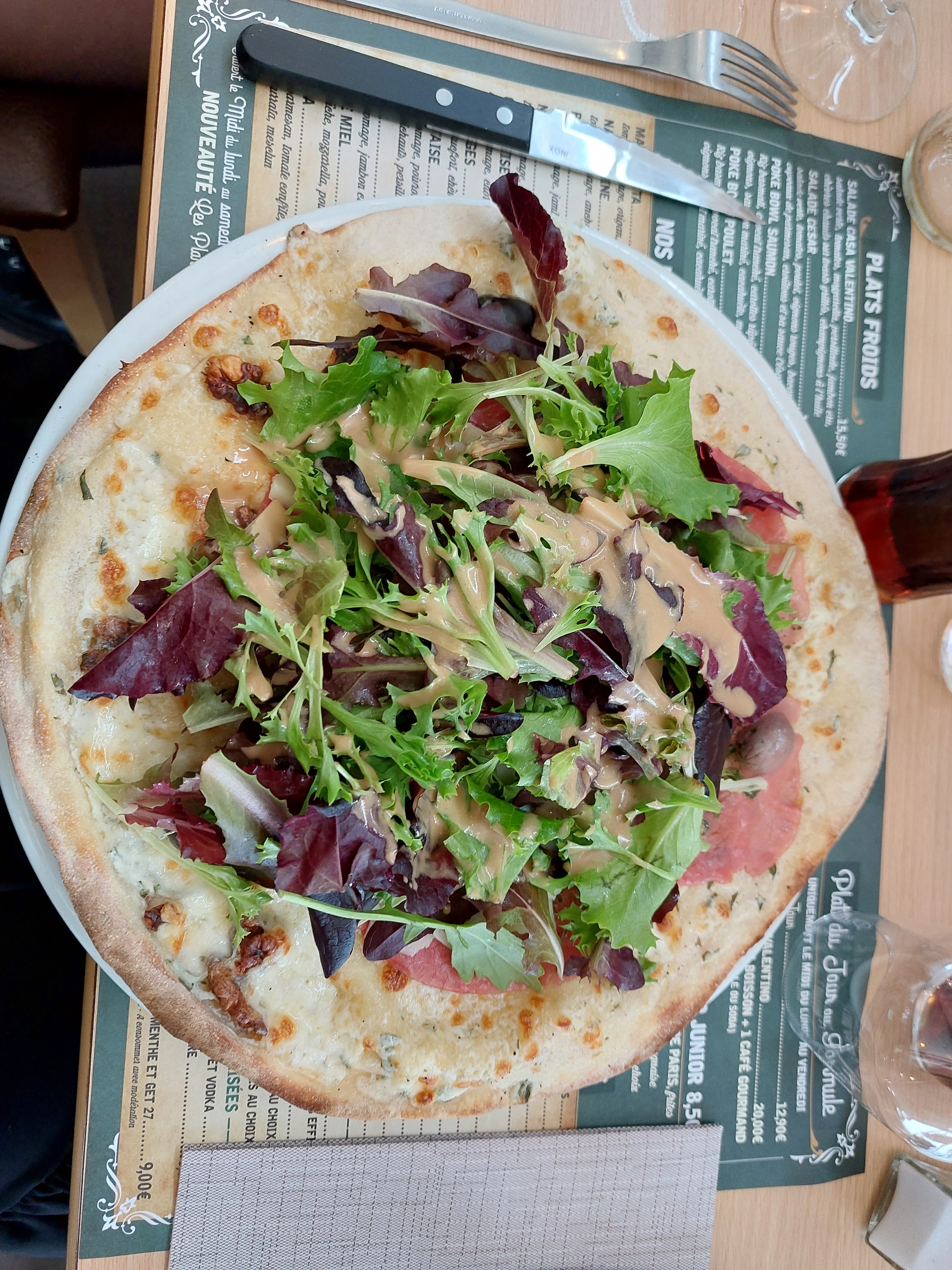 Pizza avec pâte un peu dure mais bonne dans l'ensemble .par contre verre de vin rempli à moitié pour 4.50 c'est quand même abusé.