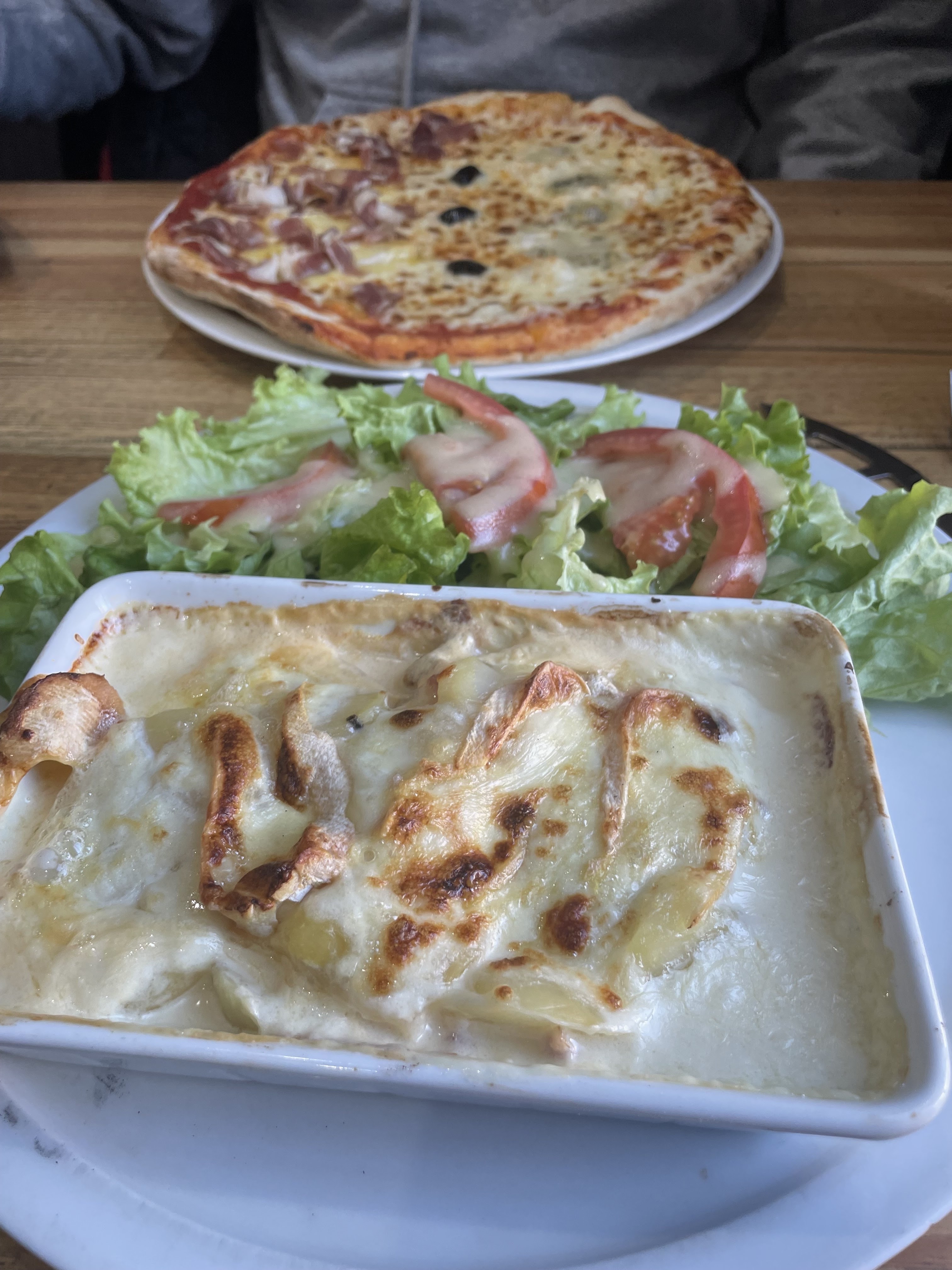 Gratin correcte, mais un peu trop liquide avec peu de fromage, la portion est relativement petite Le tiramisu maison a été une grande déception, biscuit complément sec, il a pas été trempé, il y avait peu de goût de café. Portion minuscule pour le prix. Le service pourrait être meilleur car le temps d’attente pour commander est beaucoup trop long malgré plusieurs signe faites aux serveuses, attendre 20min pour 3 plats rapides et encore 20min pour commander les desserts dans une pizzeria , jamais vu. Bravo pour la réponse du propriétaire, on est resté souriant tout le service malgré leur ignorance…. Et un bonus, sur la carte c’est écrit : glace avec morceaux de marron , mais il y a rien dedans :) C’est sur qu’on ne reviendra pas