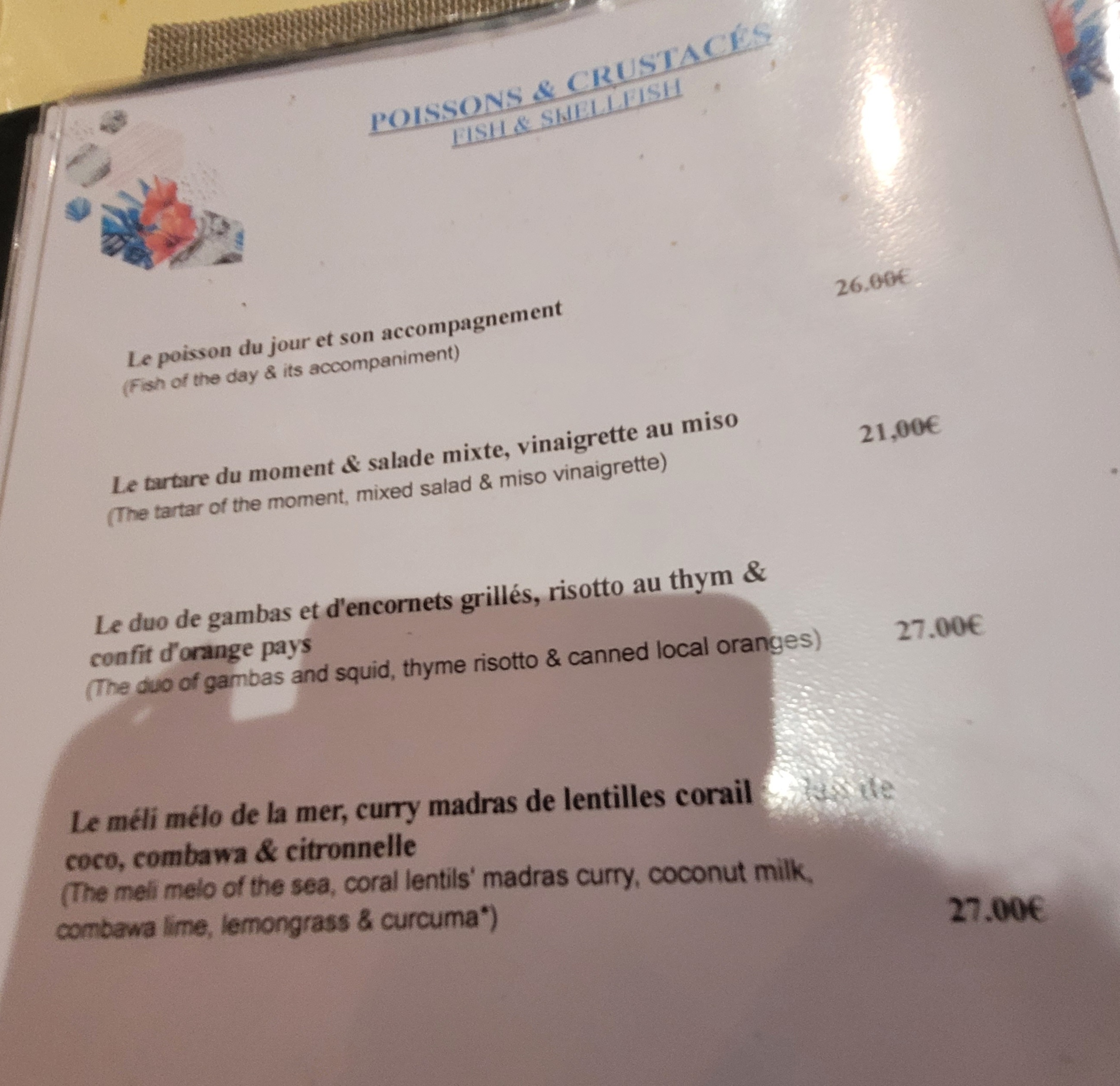 Nous avons pris le menu langouste 🦞 à 54€ , un vrai régal . Petit bémol , nous avons attendu très longtemps le dessert , qui un peu minimaliste à mon goût .