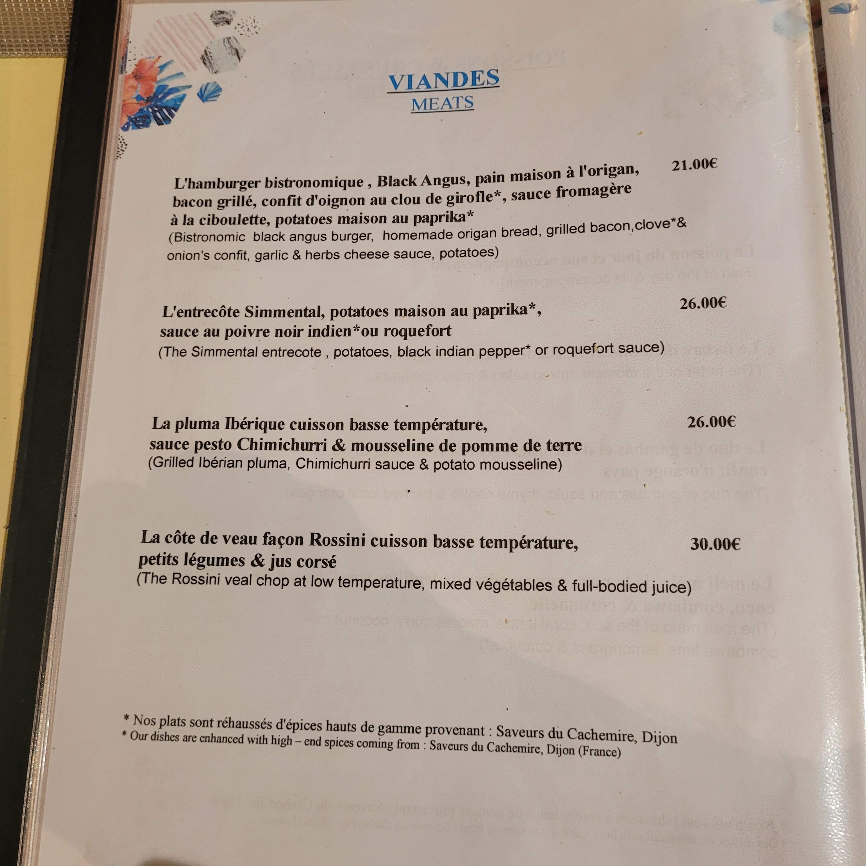 TOP!! nous y sommes allés un midi, et c était vraiment très bon. Il y a le menu du jour a 26€ et sinon les plats a la carte varient entre 15 et 25€. Les entrés et les plats étaient succulents, limite resto gastro, des goûts surprenants et qui changent des autres restaurants à côté. C'est ce genre d'endroits où on se dit en partant que c'est un petit peu plus cher que les autres restos, mais c'est tellement bon qu on paye avec une grande satisfaction. On reviendra !