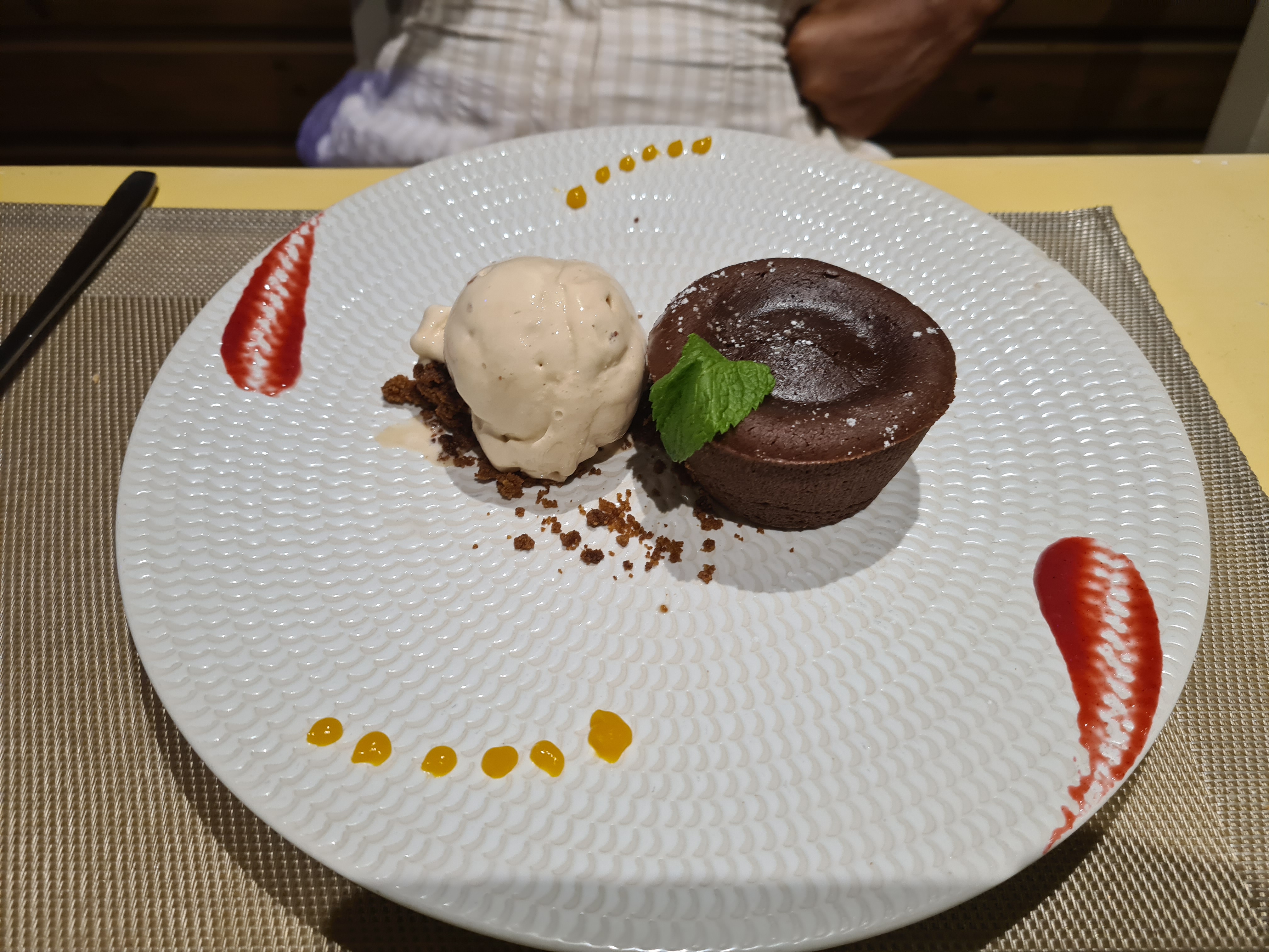 ➕Accueil super, cadre agréable, restaurant joliment décoré. Les assiettes sont bien dressées, joliment présentées et le goût y est. ➖Bémol sur la cuisson du magret de canard. Si je ne me trompe pas (amatrice que je suis), la cuisson d’un magret de canard ne se demande pas, il doit toujours être rosé. Résultat, il est arrivé trop cuit et je n’ai pas aimé en bouche.