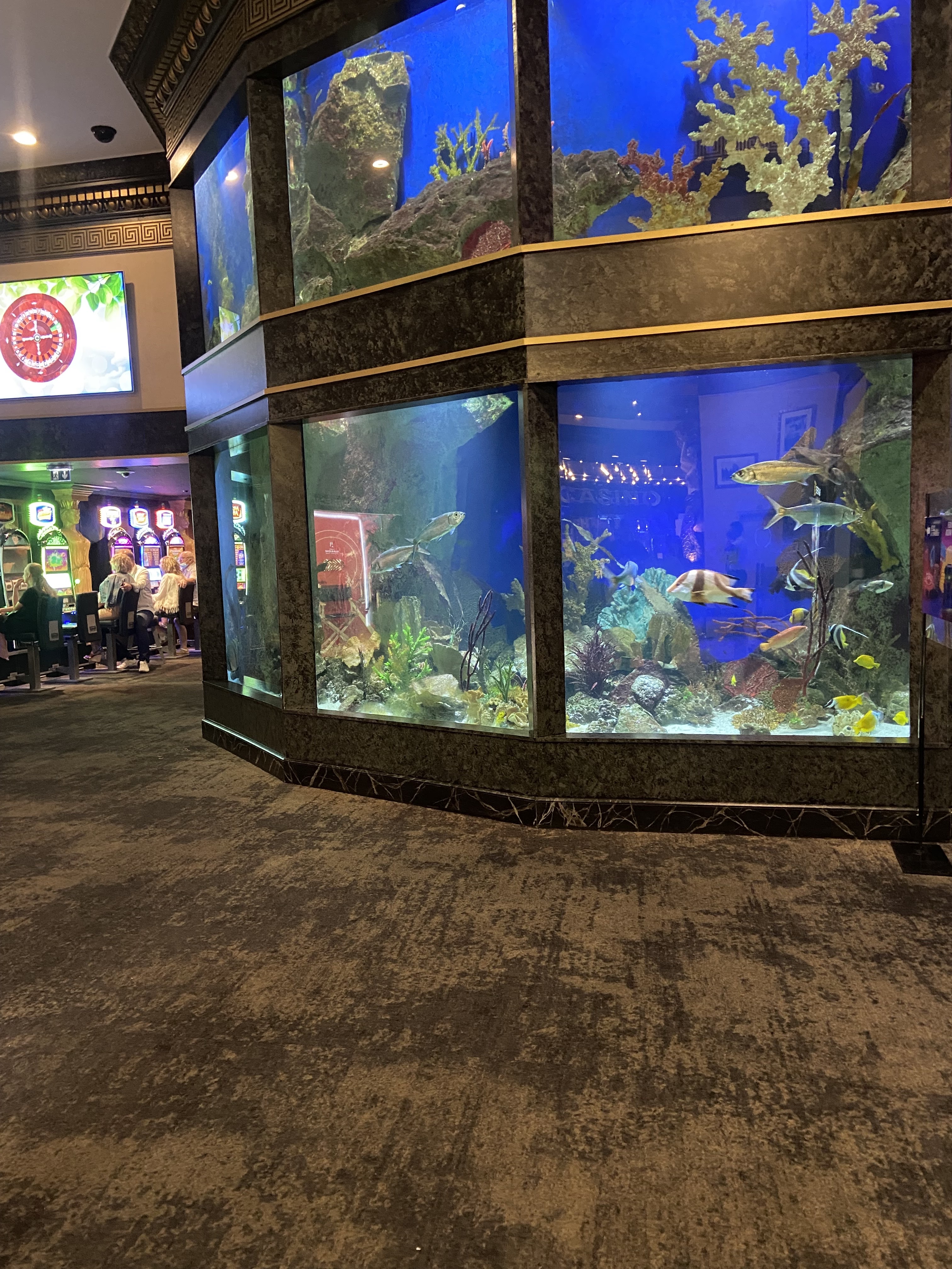Très beau casino avec son aquarium à l'entrée pas mal de machines à sous