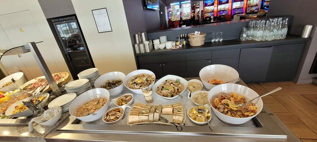 Nous avons visité le casino à trois le soir pour manger. Nous avons réservé par téléphone, car le site en ligne ne nous permettait pas de faire une réservation pour le jour même. Le buffet ouvre à 19h30. on a le choix entre plusieurs formules, comme l'entrée buffet et le menu principal, le menu principal et le buffet dessert. ou l'entrée buffet et le buffet dessert. Nous avons opté pour la formule gourmande, même si, après coup, nous aurions pu nous contenter de l'entrée et du dessert ou du menu principal dessert. Le restaurant est bien situé et offre une vue sur la mer. Le buffet était suffisant et toujours réapprovisionné. Le buffet d'entrée proposait des salades, des fruits de mer ou des quiches lorraines. Le buffet de desserts comprenait de la crème brûlée, de l'île flottante, de l'éclaire, des macarons, de la mousse au chocolat, fromages, etc. Le service était aimable et prévenant. Nous avons passé une bonne soirée et avons été satisfaits de la nourriture, surtout pour le prix. Ensuite, nous nous sommes promenés dans le casino, où chacun doit montrer sa carte d'identité avant d'entrer. Le casino est relativement grand et dispose de nombreuses machines. Il y a des places de parking devant le casino.