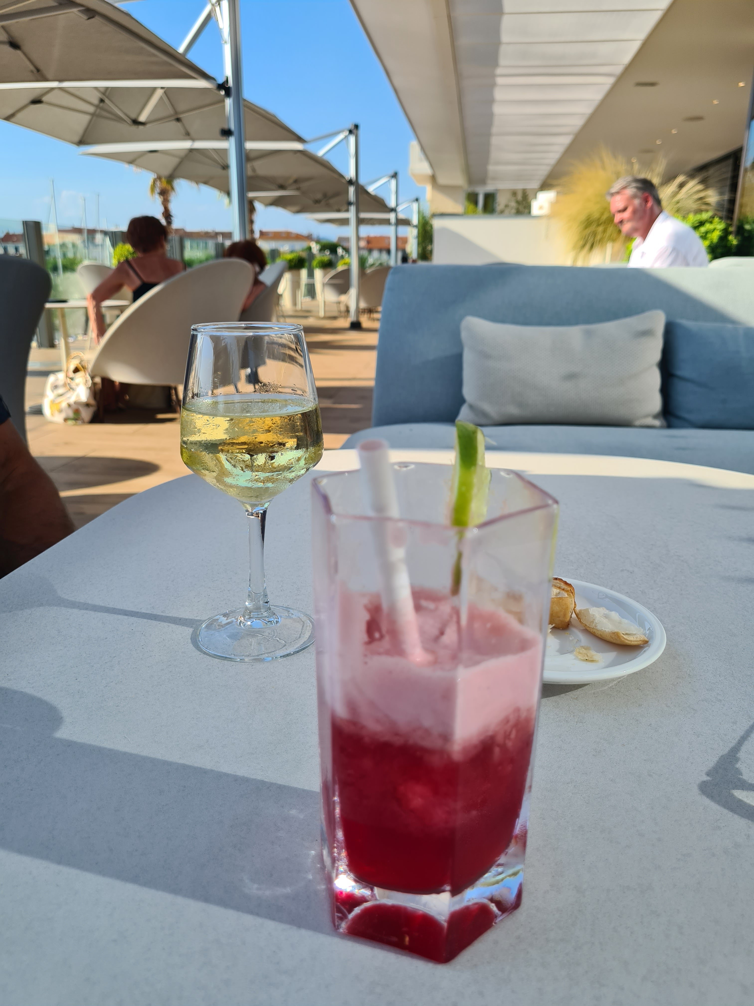 Très jolie terrasse pour boire un verre avec une vue assez panoramique sur le port. Attention déjà, vous ne pouvez pas manger en terrasse mais seulement en salle. Ensuite, le gros souci est la lenteur globale du service. C'est lent... Long. Et une fois servis, il ne faut s'attendre à rien, même la bière pression était fade, sans bulle et peu fraîche. Le gin tonic est sans gin, sans la moindre décoration ou effort, pas de petits trucs à grignoter alors qu'on consomme pour 50€. Bref, bienvenu dans le sud, c'est beau mais fade et peu qualitatif.