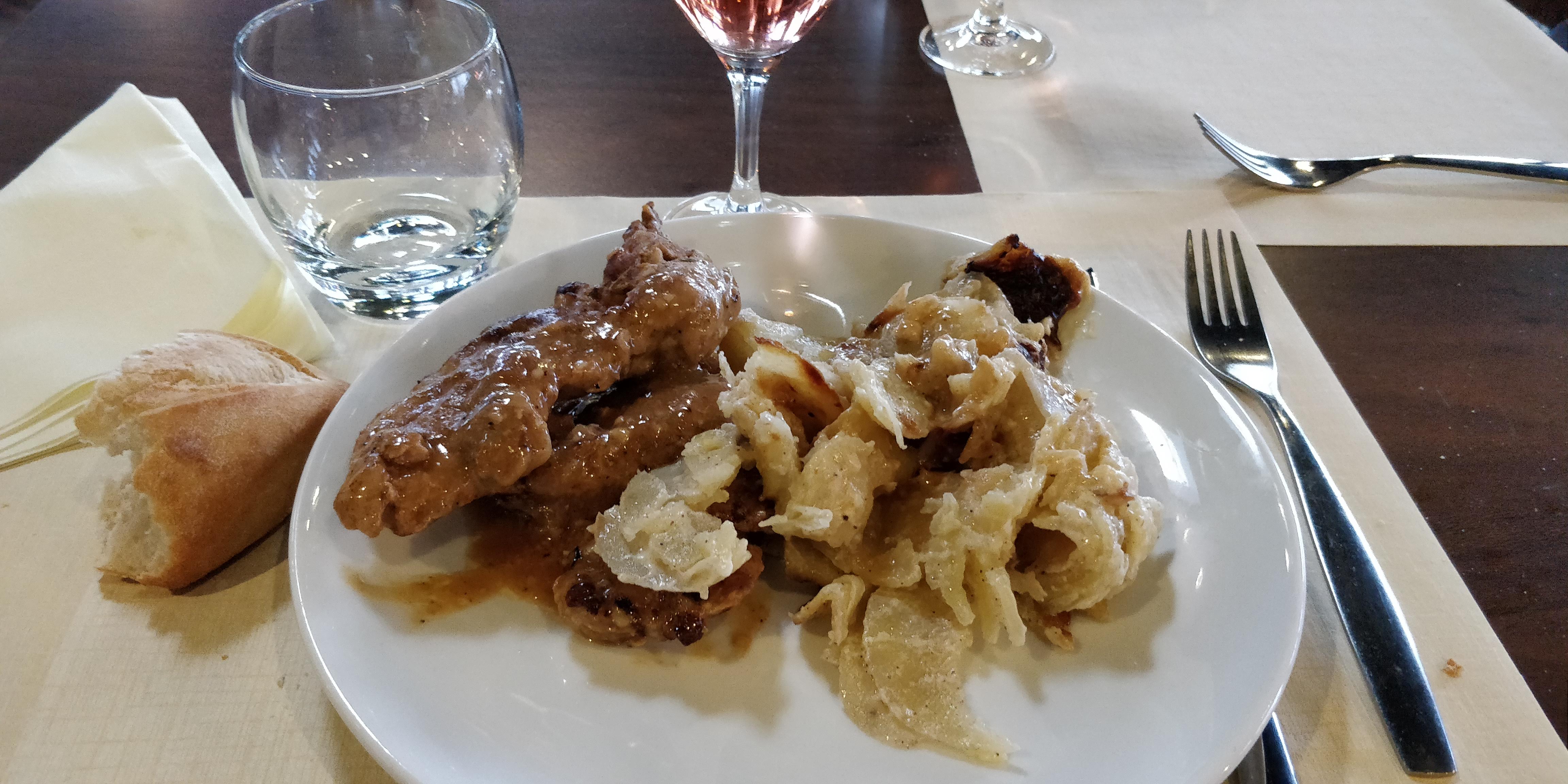 Un peu déçu du repas. Repas du dimanche à 16,50€ avec accompagnement musical par un chanteur, Charlie. L occasion de danser un peu. L animation correct, le service également mais dans l assiette c est pas ça. Wrap de poulet très bourratif, c est dommage le filet de poulet a l intérieur du wrap était moelleux. Tranche de gigot d agneau rosée accompagnée de flageolets. Le bon point du repas. Et en dessert une mousse abricot qui aurait eu besoin d un compagnon croquant. Vin et café compris