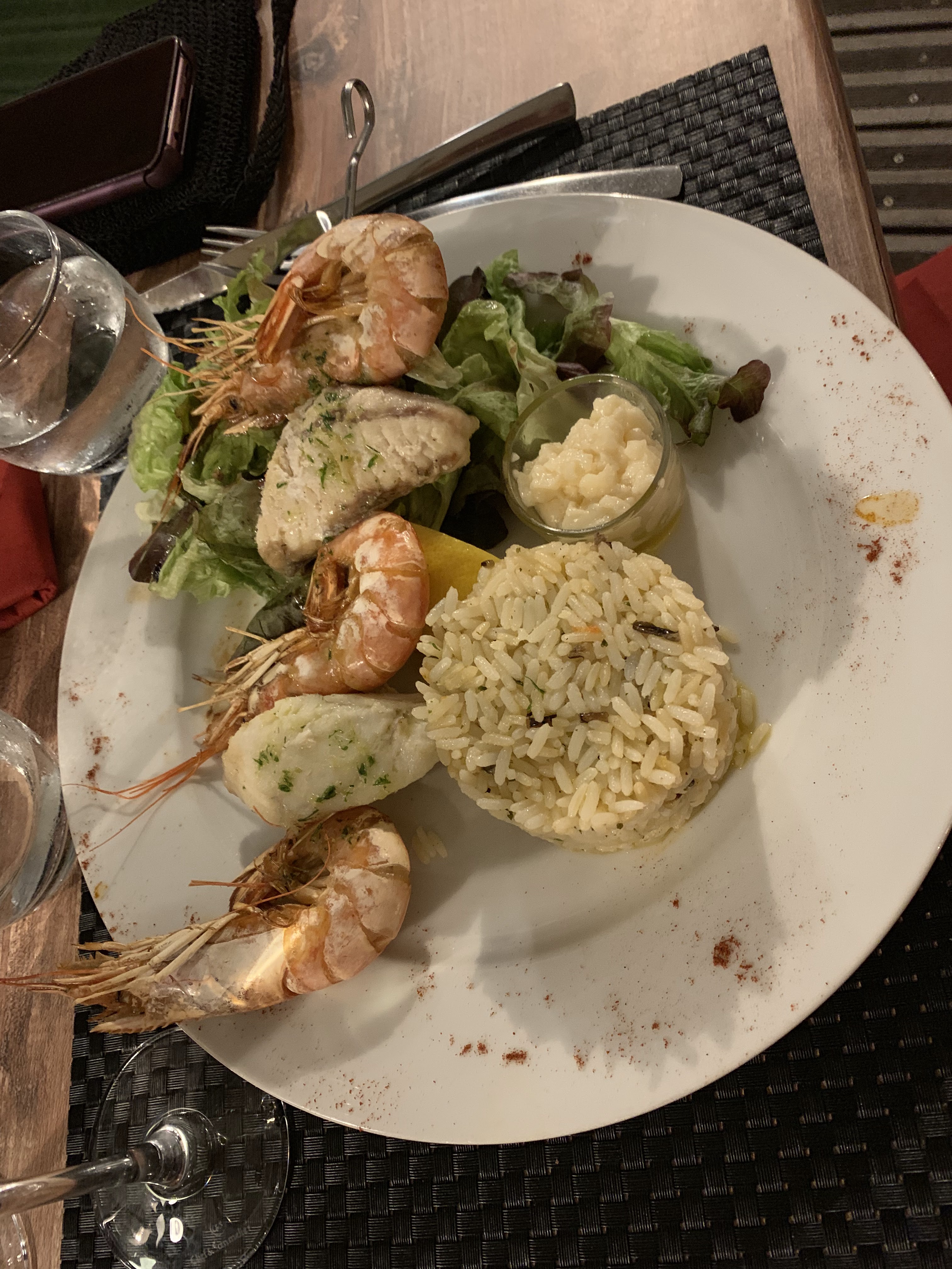 Super parillade de poisson à un prix de 19euros🏆,!!!! Filets de rougets brochette de coquille Saint Jacques, seiche persillée. Filets de poisson gambas crevettes moules. Servie avec une pomme de terre au four à la crème et une salade. Gigantesque et bon. Le casino est quelconque mais on s'y amusé. Excellente soirée. Personnel charmant. J'y reviendrais👍