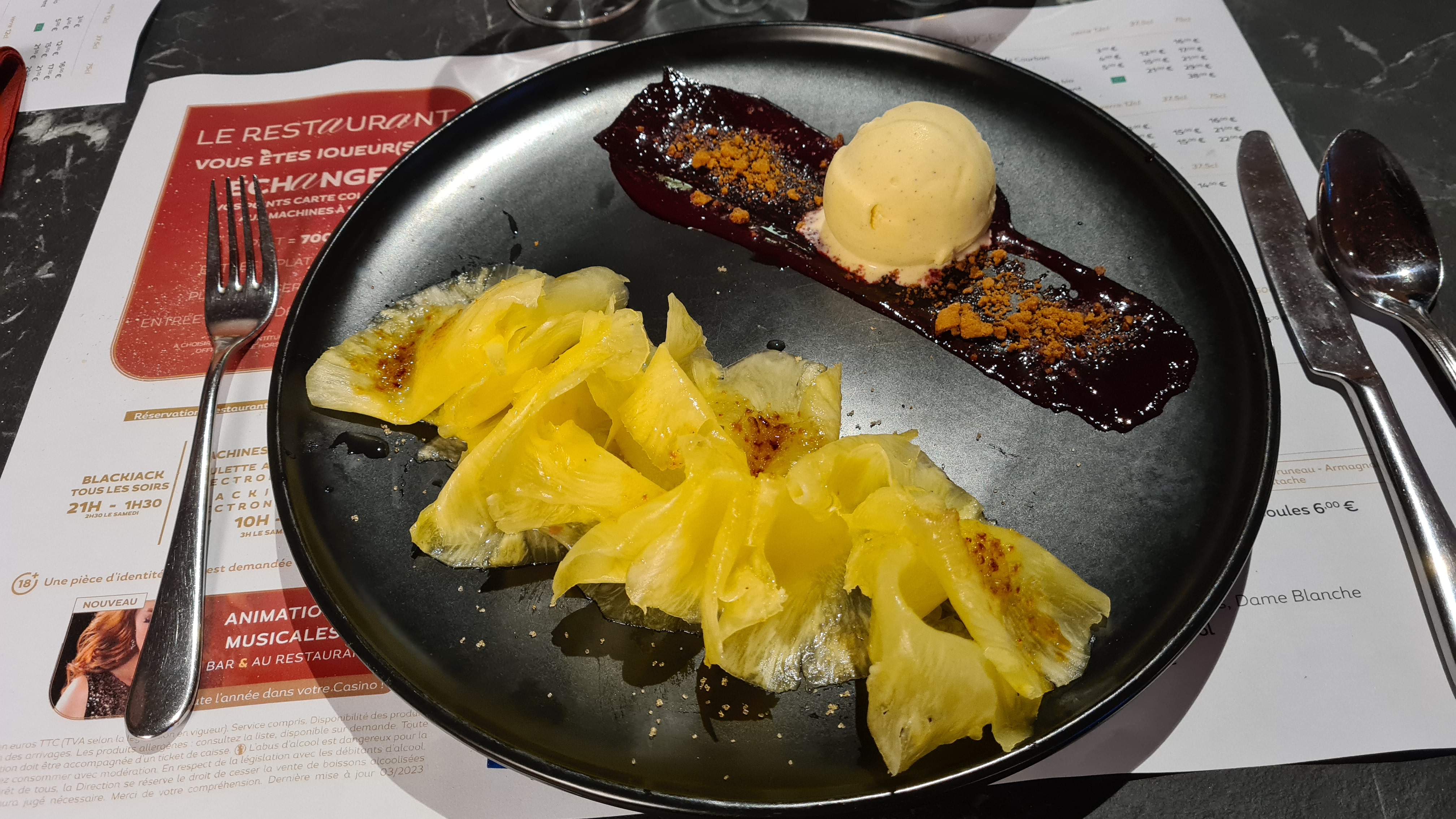 On a été mangé au restaurant du casino il y a quelques jours...c'est bon mais ça ne casse pas 3 pattes à un canard...une salade du sud ouest avec des micro bouts de foie gras sur une demi tranche de pain de mie grillé, je trouve ça léger, surtout pour 18 euros. Bon, ils nous ont offert l'apéritif parce qu'ils avaient oublié d'envoyer notre commande de plat en cuisine, merci pour ce geste mais j'avoue que ça n'efface pas tout. Pour les machines à sous, tout est en anglais donc on ne comprend pas grand chose mais on est quand même parti avec le double de la somme misée donc ça va, pas trop de casse niveau financier. On reviendra peut-être au casino mais sûrement pas au restaurant.