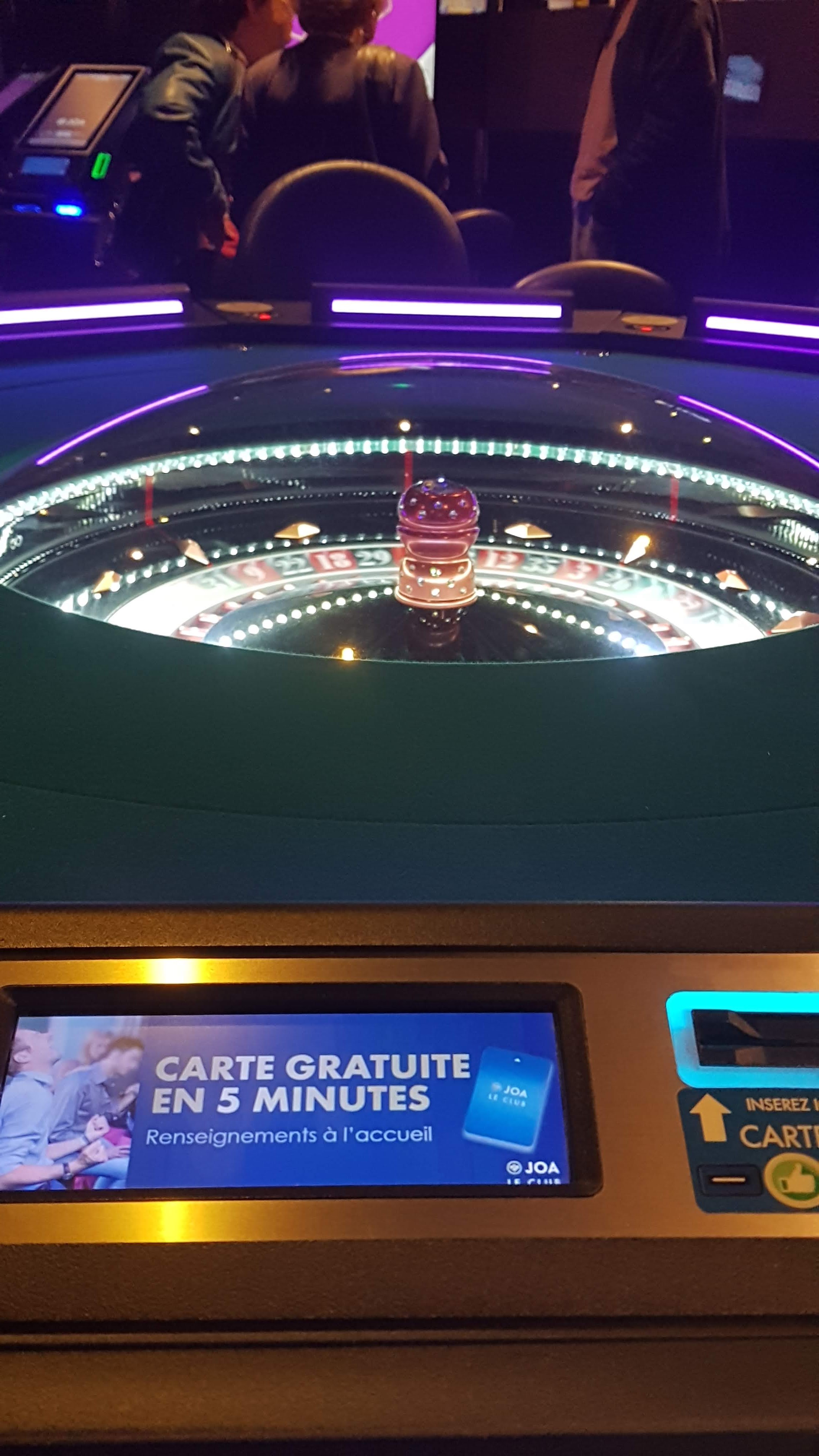 Désolé question pas en français Par déduction Très beau établissement toujours très bien reçu, personnels très charmants un plus pour ceux qui sont au bar et au restaurant qui sont vraiment top Nous venons 1fois par mois (budget restreint et nous ne gagnons jamais mais c est le jeu) Continuer comme ça et n hésiter pas à nous envoyer une invitation au restaurant à moi et mon épouse (c est surtout elle qui joue moi je m instal au bar et regarde mon téléphone avec une bonne bière Cordialement mr Martin