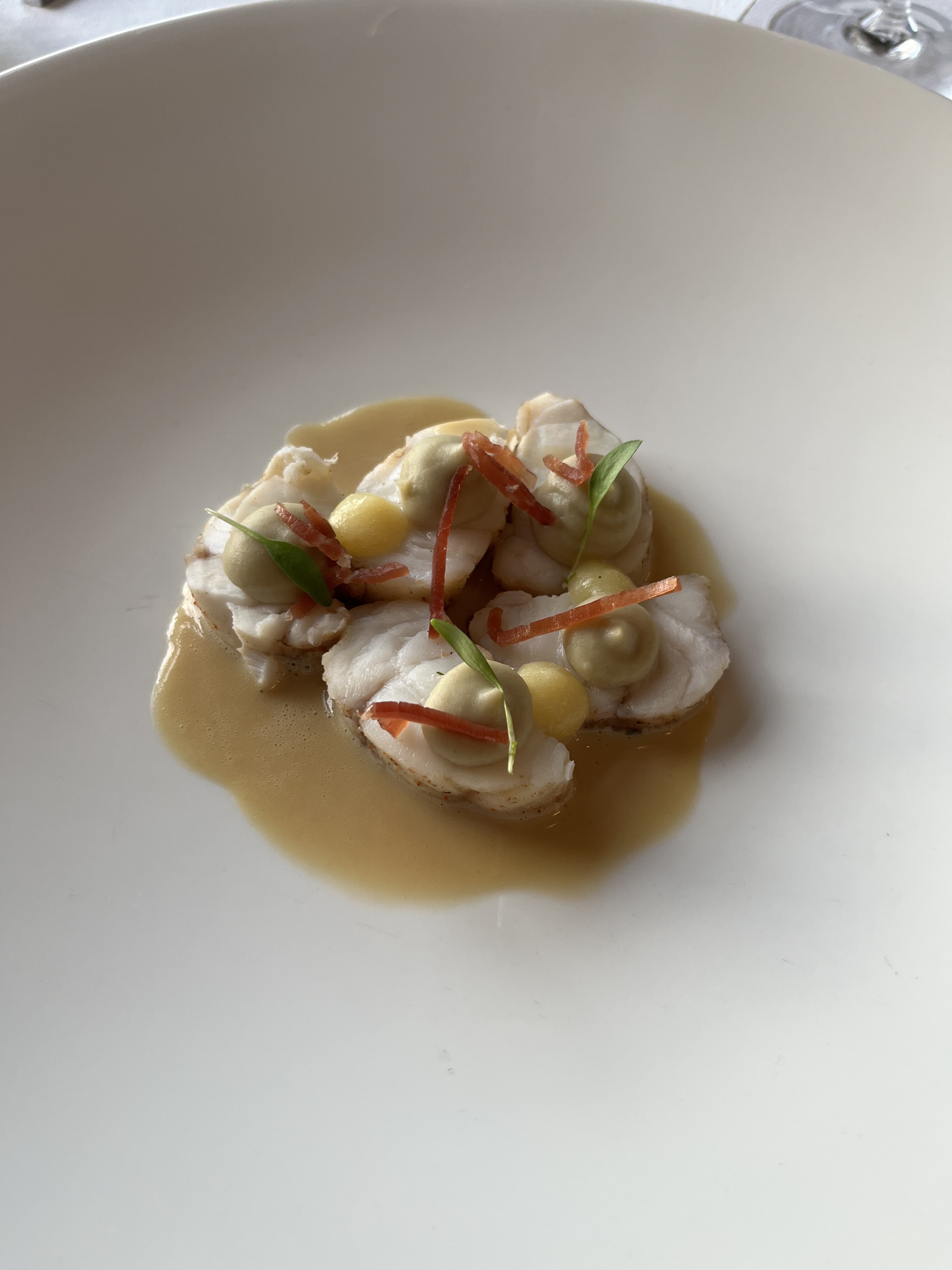 Un Lieu magique, très pro et relax à la fois Le nom un peu désuet de cet hôtel cache en fait un lieu très contemporain avec une vue sublime sur la côte de granit rose. Prendre un cocktail et 6 huîtres sur la terrasse ensoleillée à 18h est assez magique et vaut déjà le détour. Le resto gastro est plus mitigé. Les plats sont certes sophistiqués mais les saveurs se perdent parfois dans leur complexité, et/ou leur minimalisme. Un plat émerge, et il émerge avec brio par son équilibre et sa réalisation parfaite : la tourte de pigeon et foie gras avec choux et champignons est un délice. Ce plat vaut à lui seul un dîner au resto gastro. Le service est pro, jeune et sympa. Bémol qui m’agace toujours ; la carafe d’eau du robinet filtrée facturée 7€… Dommage à tous points de vue.