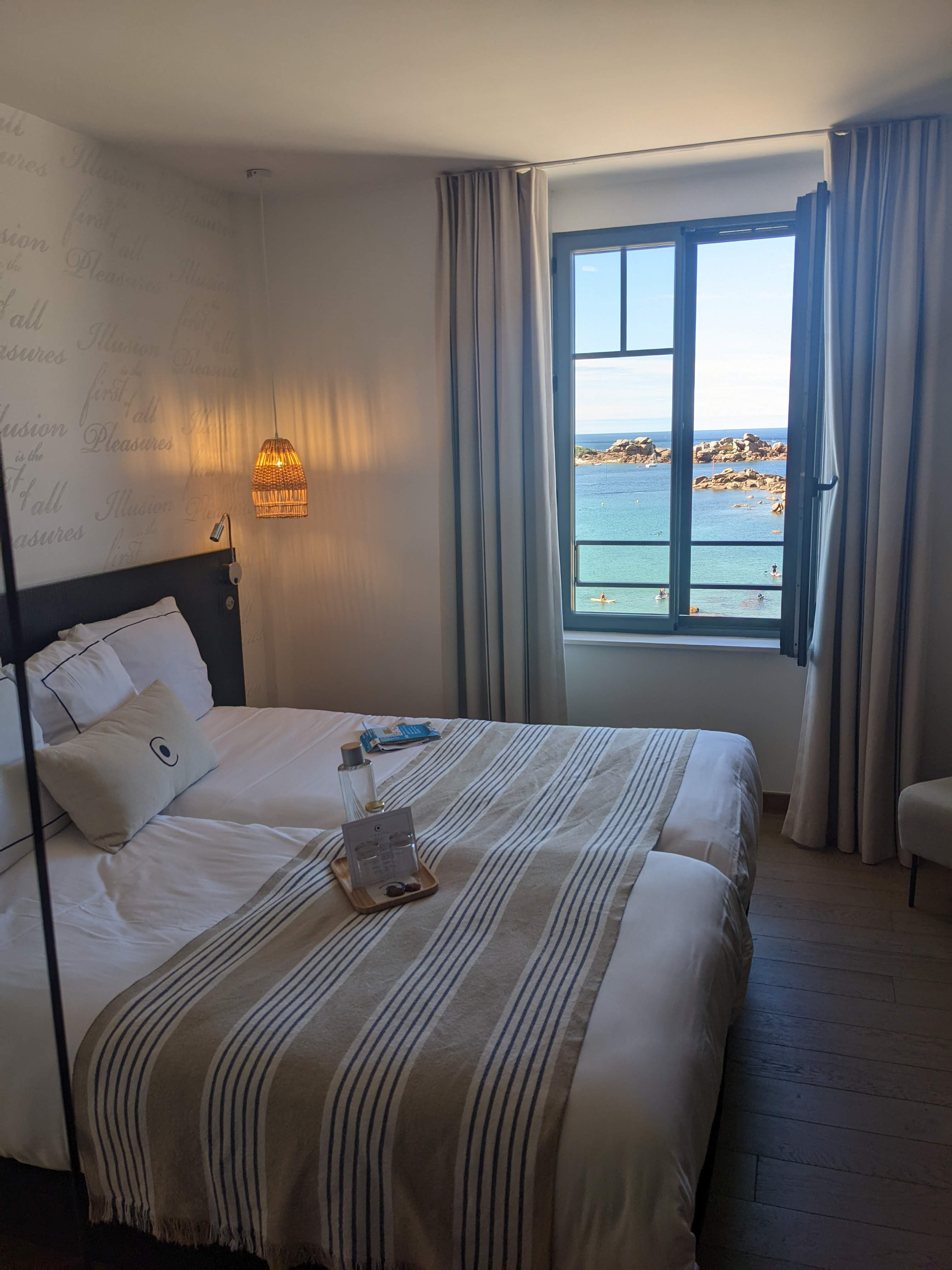 Excellente situation, vue magnifique sur la mer et les rochers de granit rose. Chambre assez petite,20m2 environ il n’y a pas de frigo dans la chambre,. insonorisation parfaite , tout est feutré , literie impeccable Personnel souriant Petit déjeuner EXCEPTIONNEL : que des bons produits ! Et des options produits chauds proposés : parfait 👍