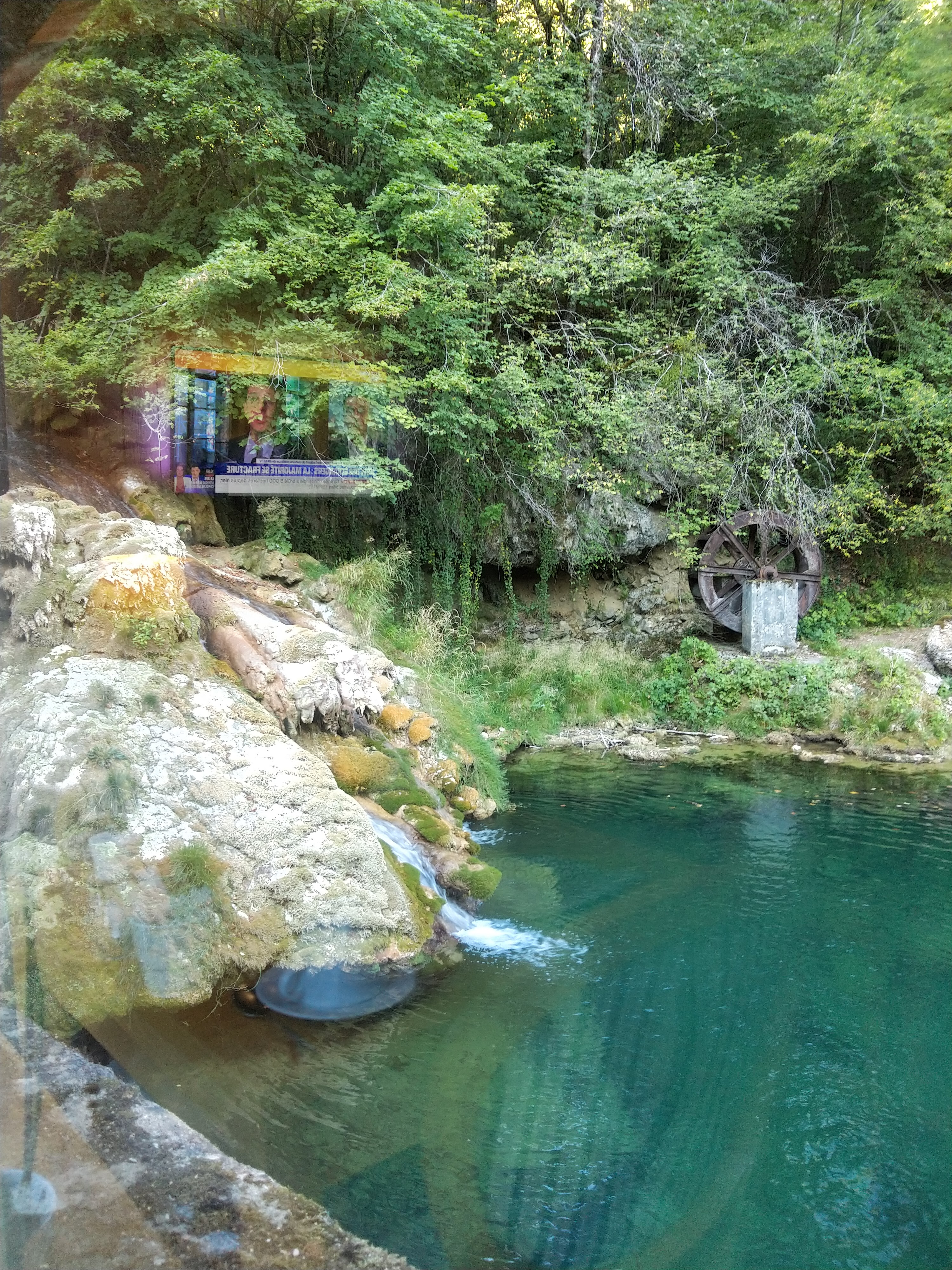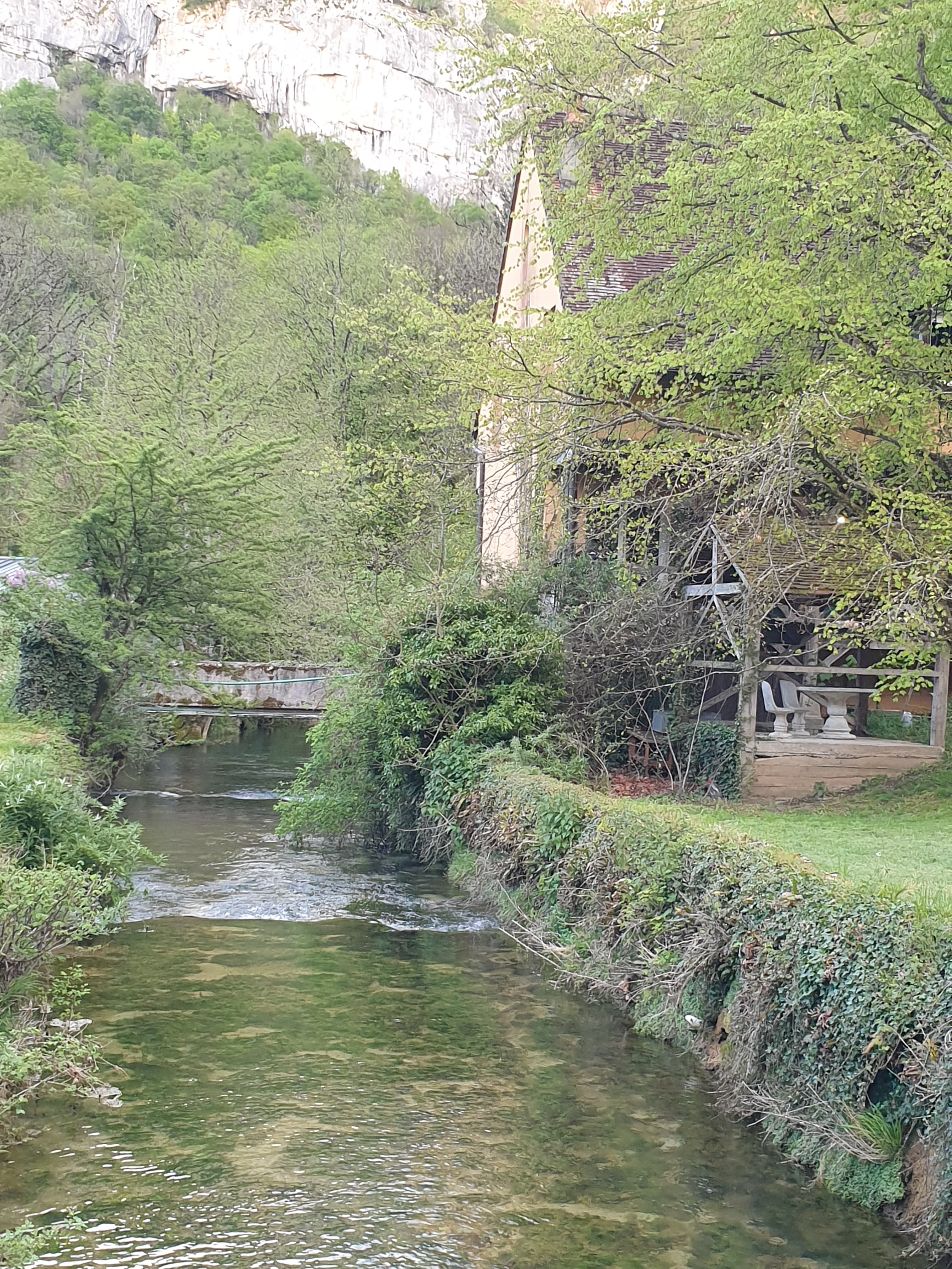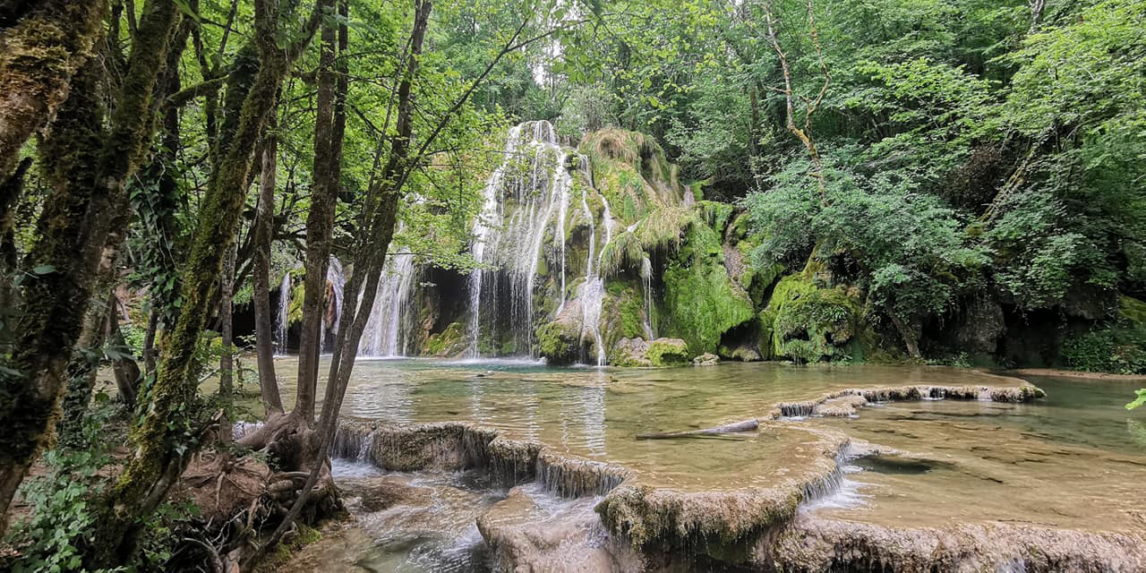 C'est superbe splendide il y a la source de la cuisance qui se prolonge par la rivière avec ses nombreuses galettes puis une grande cascade en éventail où il y a un près et des sentiers pour faire une boucle en promenade enfin le resto ci:dessus avec sa cascade c'est ombragé et magnifique coin où l' on voit les falaises depuis le resto j' ajoute que ce resto a succédé à la mère Michelle dont la spécialité était le poulet au vin jaune et morilles je parle du lieu car je ne suis pas allée dans le resto