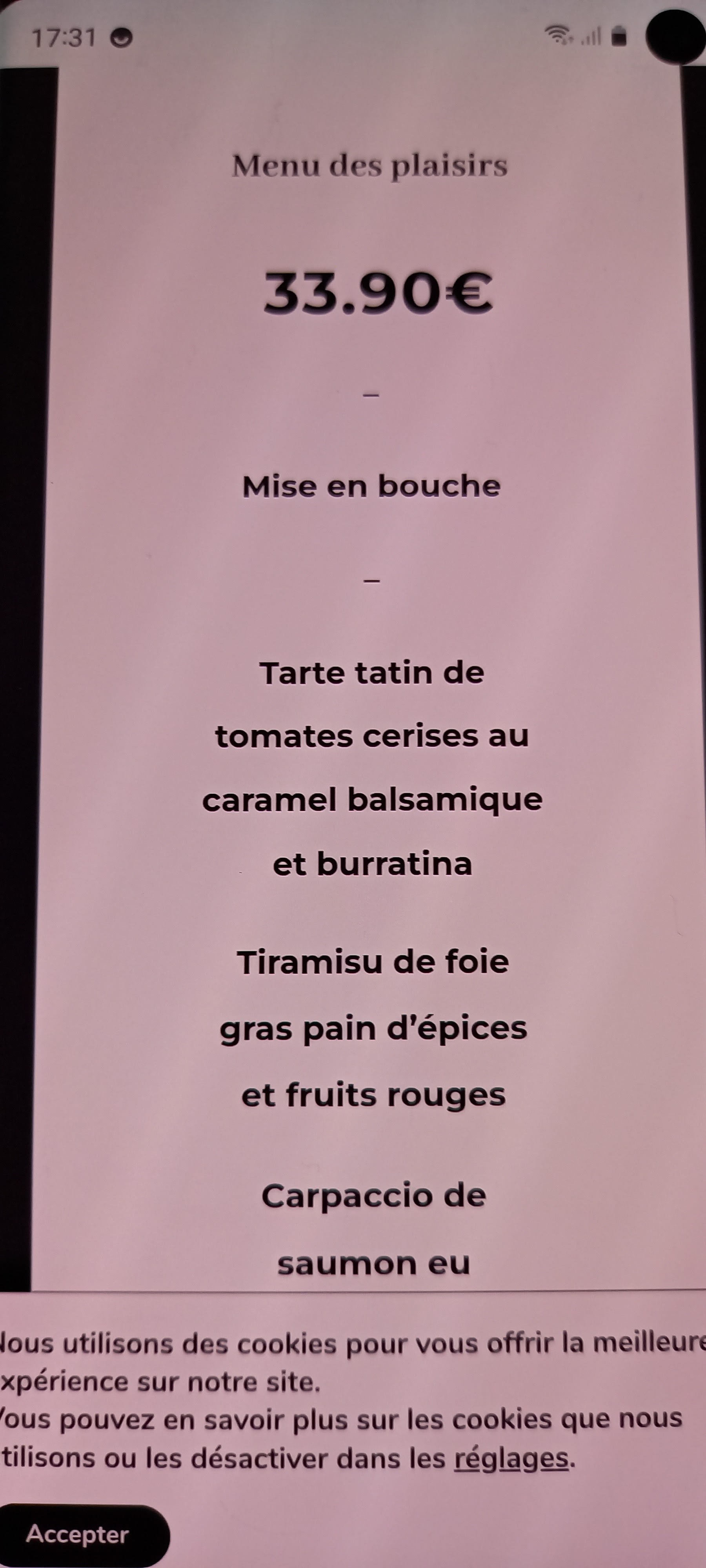 Alors je vais être un peu dure mais la carte guindée m'a poussée à être exigeante. Donc, le pain est bon mais on aurait aimé autre chose que de la baguette pour accompagner ce repas chic Les entrées : le tiramisu au foie gras (fade) n'est pas un tiramisu mais plus un entremet et une entrée rose fluo, spécial lol. Le carpaccio de saumon ben c'est du saumon fumé et malheureusement, le guacamole était fade. Les plats : alors les viandes et poissons WAAA supers bons, parfaitement cuits, on adore et les sauces au top ! En revanche les accompagnements bof, rien de spécial et la plâtrée de poivrons oups, beaucoup trop et surtout aucun intérêt gustatif, on les aurait aimés confits par exemple. Desserts : fades aussi dommage. Et trop de flocage tué le flocage 😉 Ah oui, l'amuse bouche et bien on a du le réclamer parce qu'on avait oublié de nous le servir.