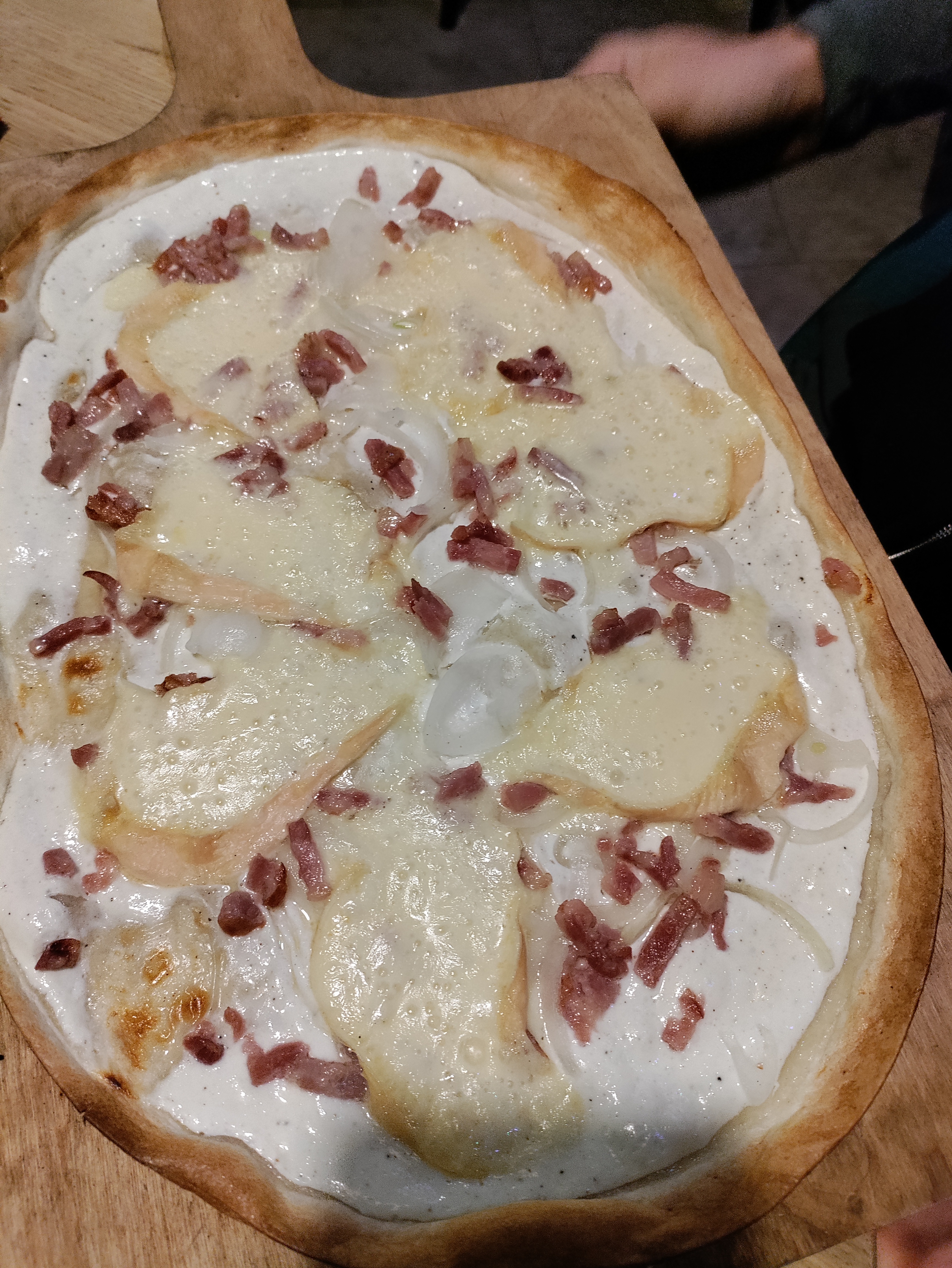 Vraiment très bon, tarte flambée servie sur une grande planche en bois, pizza délicieuse...