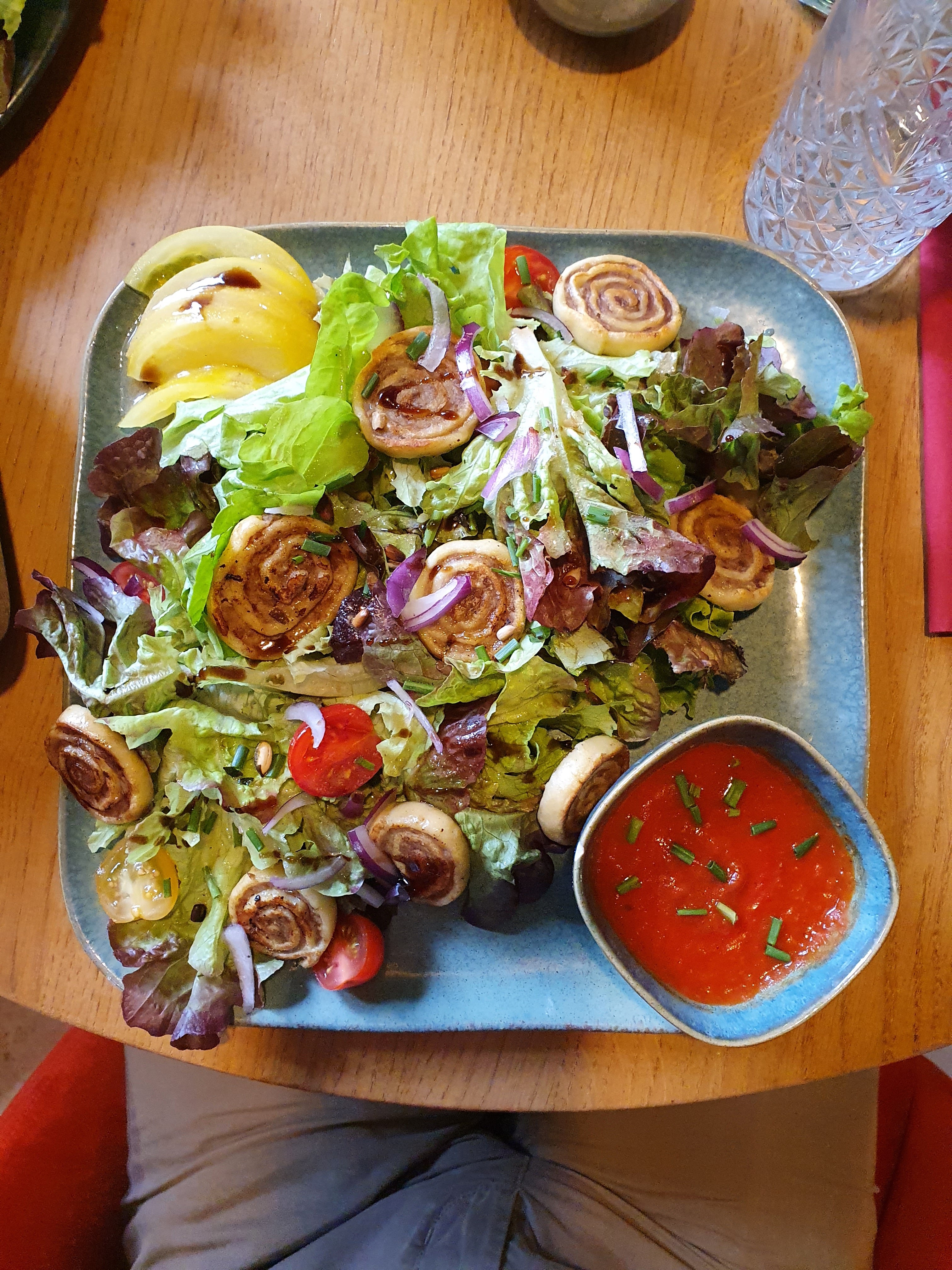 J'ai pris une petite salade composée au munster, puis une tarte flambée moitié/moitiée au roquefort et au munster. Tout était copieux et délicieux. Les serveur et serveuses étaient au top et très agréables. Je recommande vivement. Excellent !!!