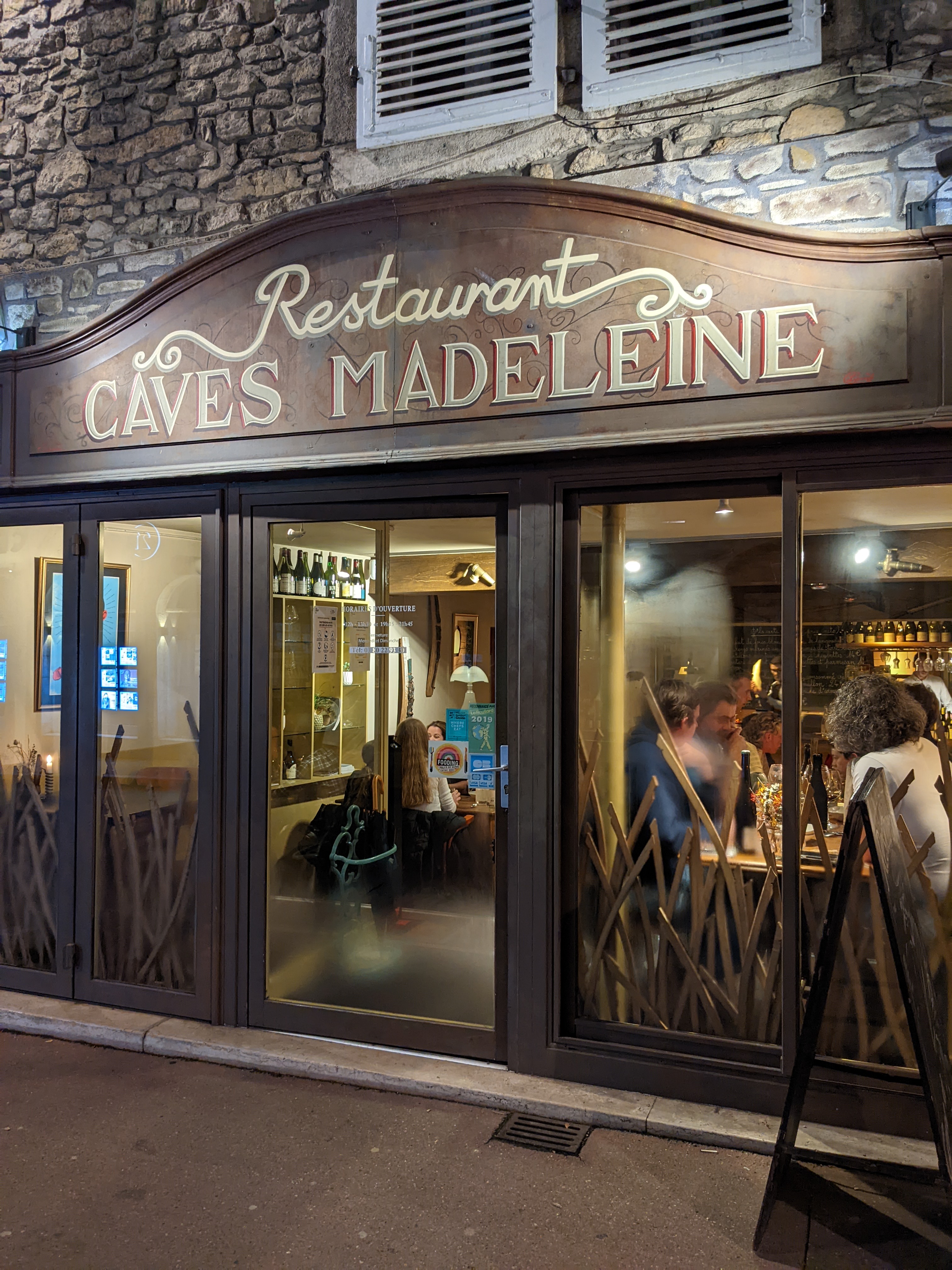 Les Caves Madeleine sont déjà un classique à Beaune. Pas facile de trouver une table dans la petite salle à manger toujours bondée. Nous étions à la table commune, ce qui est appréciable si l'on trouve des gens sympas autour de soi (c'était le cas). Mais cela rend le sentiment différent de celui d’avoir sa propre table. La nourriture est délicieuse. Cette fois, cependant, nous n’avons pas commandé le menu (je recommanderais cependant le menu). Nous avons eu les raviolis à la citrouille et la viande bouillie. L'accent est mis ici sur leur vaste carte des vins et nous avons partagé de nombreuses bouteilles : une excellente expérience à des prix équitables. Le service et le personnel étaient très sympathiques, mais en général c'est lent (ce qui n'est pas grave, vous ne devriez pas venir ici si vous êtes pressé). Dans l'ensemble, c'est un endroit que vous devez visiter au moins une fois.