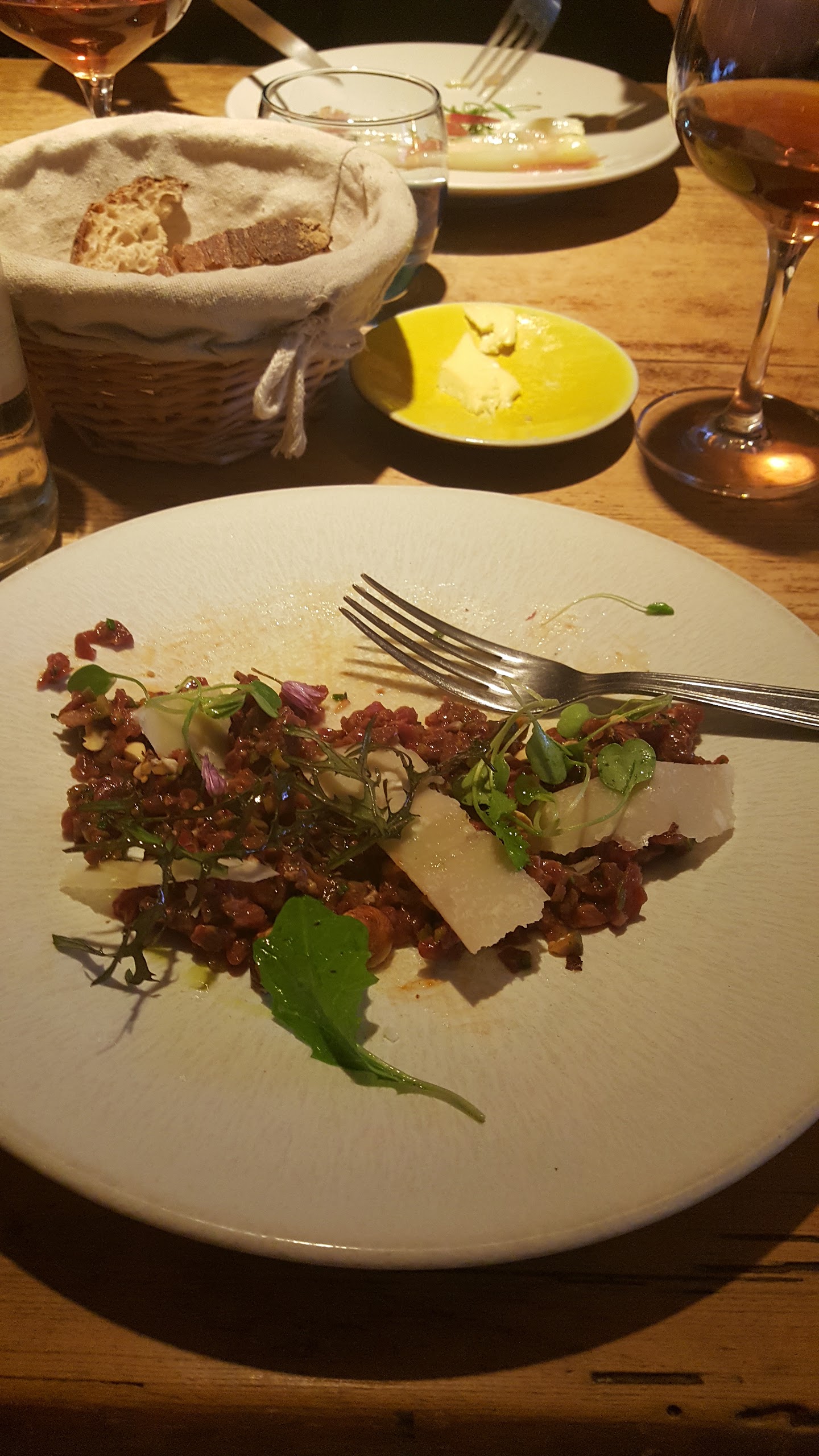 Bonne nourriture, bon vin! Nous étions ravis. Tout comme le magasin, le menu est assez restreint et nous nous sommes assis à une longue table entourés d'étrangers. Nous avons trouvé cela génial, mais c'est une question de goût. La nourriture est de haute qualité de produits et de préparation. Nous avons eu un tartare de veau, une tourte au porc, un raviolo de lapin et des dumplings au poulet. Comme beaucoup de lieux à Beaune, la carte des vins est un petit livre regroupant de nombreux trésors du terroir. Une soirée globalement réussie avec des hôtes très sympathiques et attentionnés.
