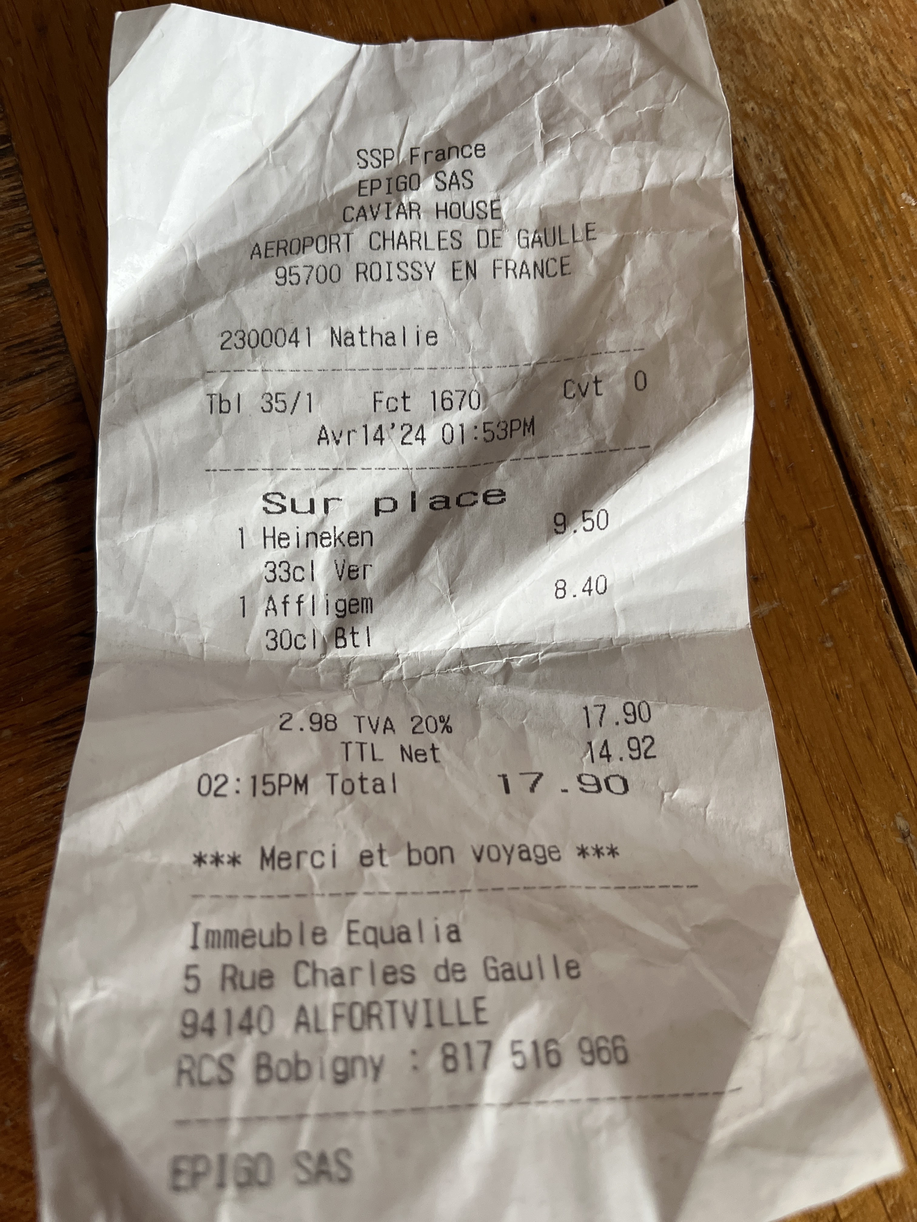 D'accord avec d'autres critiques, le personnel aurait besoin d'un peu plus de gentillesse. Nous nous sommes arrêtés ici parce que c'était le seul endroit où il n'y avait pas trop de monde. Bourbon et café commandés, les prix étaient élevés comme prévu dans un aéroport très fréquenté. Je choisirais probablement d'autres restaurants à essayer lors de notre prochain passage à CDG.