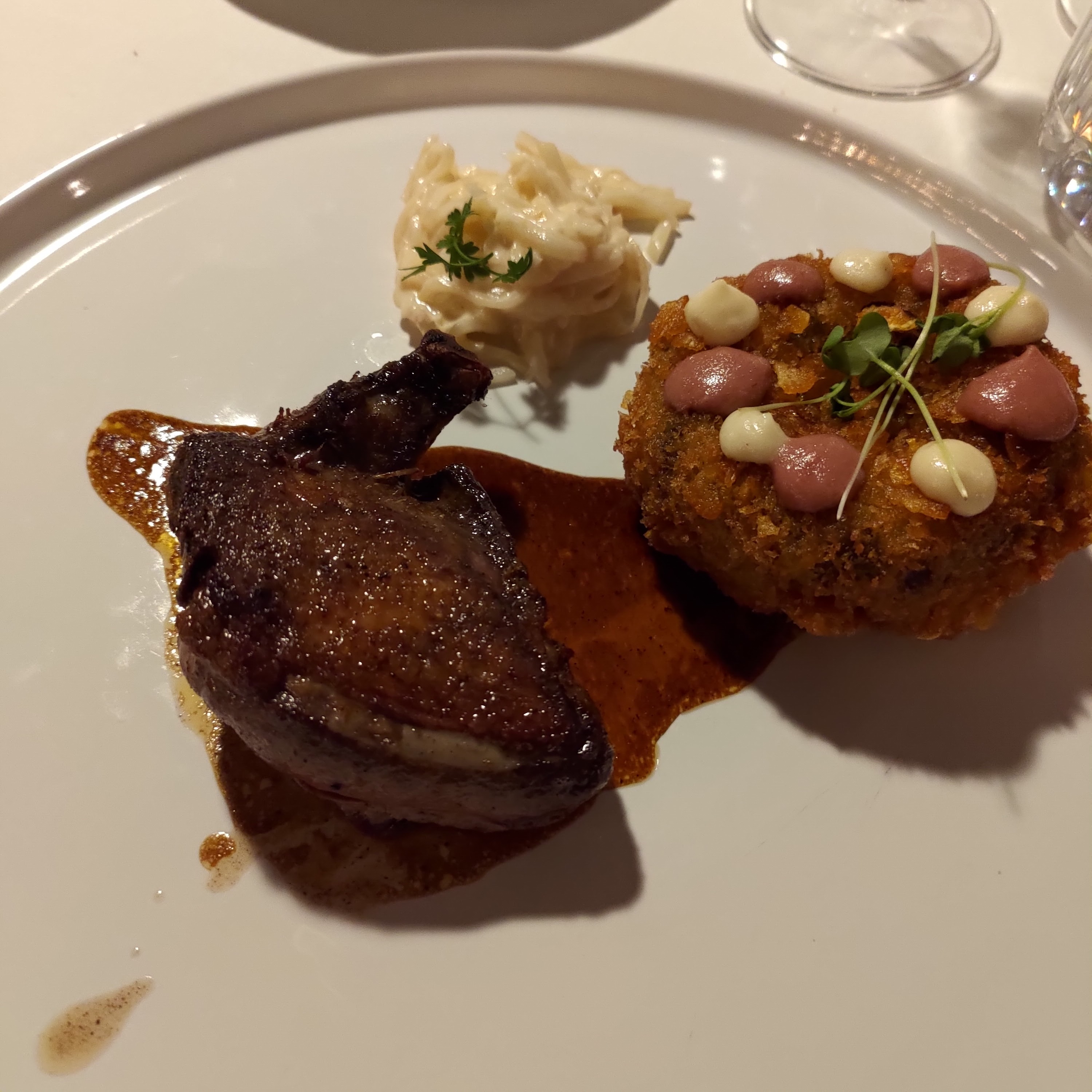 Dîner agréable dans un lieu agréable. Repas en sept temps. La veille du 31/12 Servis par un personnel très jeune. Vin au verre recommandé par la jeune sommelière mais pas forcément à mon goût . Dressage des plats impeccable Des associations de saveurs inattendues et du plus classique. Je n'ai pas du tout apprécié le plat avec panure et lardons. Pour le gibier c'était plus que bien cuit. Le dessert coco fruit de la passion ou mangue était bon mais pas transcendant. Les mignardises mangées par gourmandise mais en trop pour mon foie. En conclusion un repas agréable dans un cadre cosy avec un service aux petits soins. À renouveler en été pour manger des plats plus légers sur la terrasse . Cela restera tout de même un moment très agréable en mémoire. Le lieu est facile d'accès et avec un grand parking arboré.