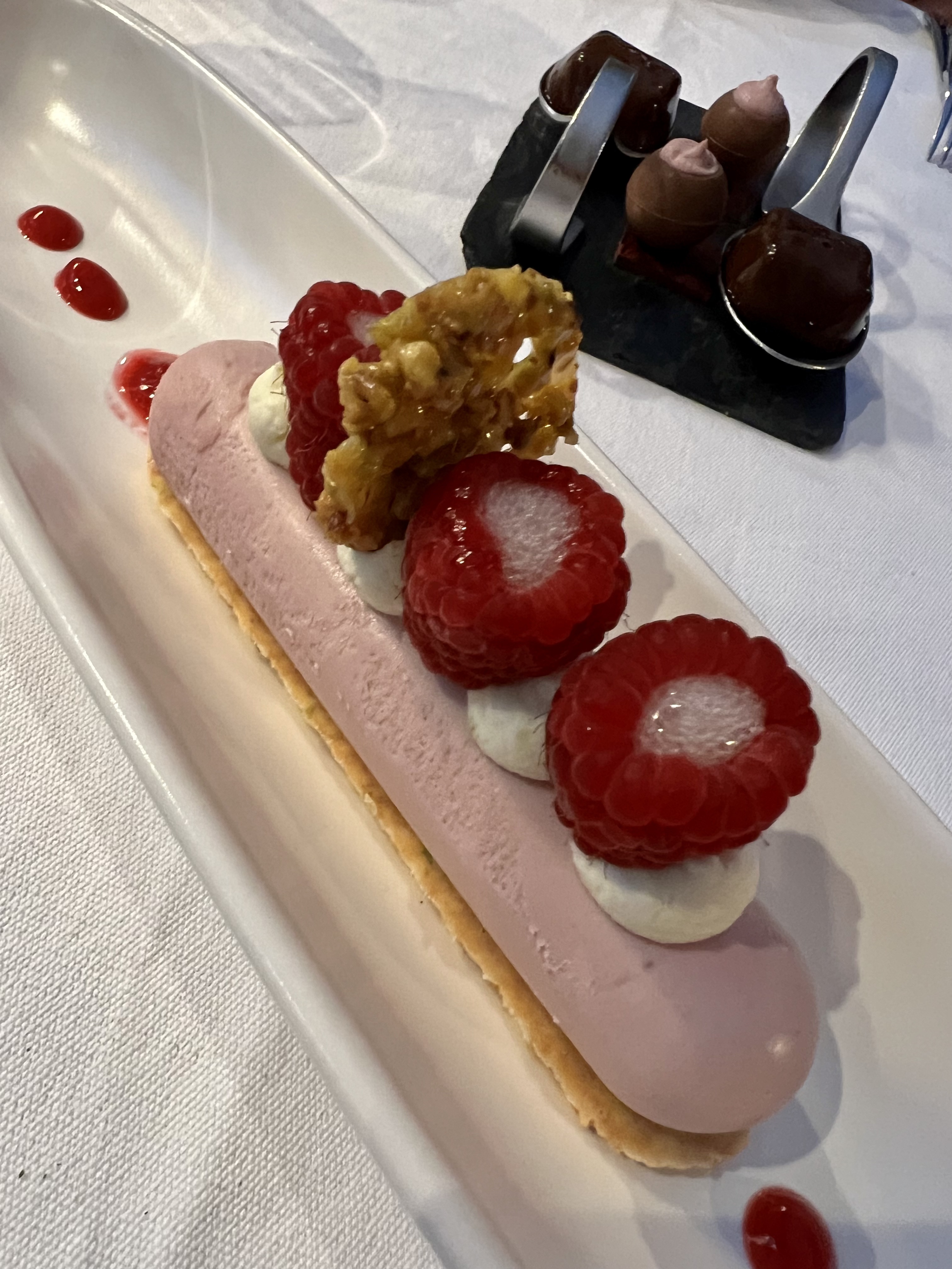 Dîner de très bon niveau. Le canard était délicieux, les St Jacques à cuisson parfaite et les vins conseillés par le sommelier (très sympathique par ailleurs) étaient tous magnifiquement adaptés à nos plats. Merci !