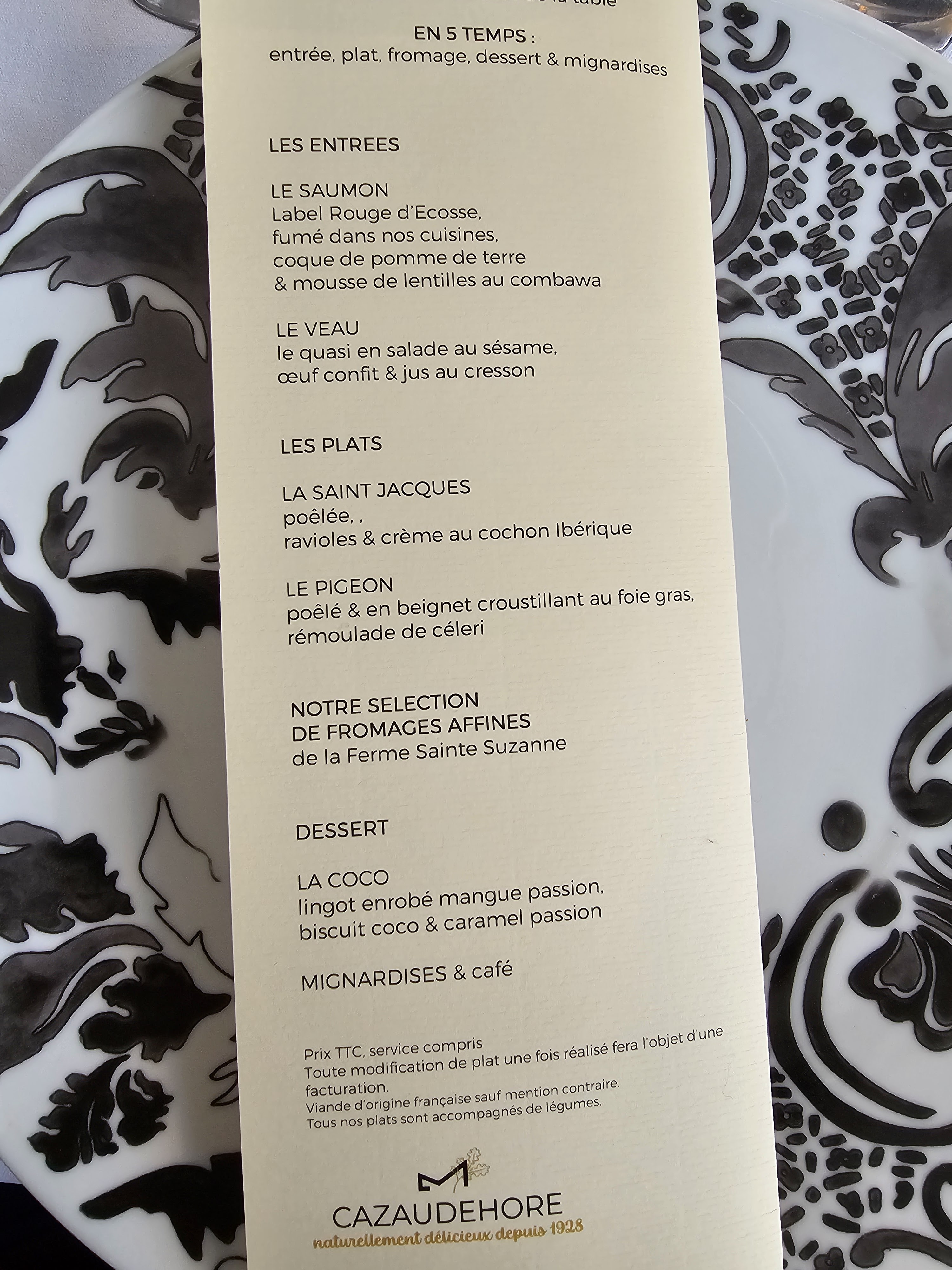 Nous avons été très déçus par le repas d'un samedi soir. Nous choisissons le Menu gastronomique : - foie gras mi-cuit excellent. - sur la carte à choisir : ou thon ou agneau. Nous choisissons agneau. Il n'y en avait plus... Nous a été proposé en remplacement du chevreuil. Ou bien, des plats à la carte, en ajoutant bien sûr le supplément qui va avec. Il nous a été servi une lotte insipide et vraiment la queue de la queue de lotte. Indigne d'un cuisinier. Digne d'une gargote. Des choix de plats à la carte qu'il n'y avait plus. Il nous a donc été facturé les menus gastronomiques 75 € + les suppléments des plats à la carte. Pas professionnel du tout et surtout pas commercial. Les vins étaient par contre très bon et nous avons été bien conseillés par le sommelier. Nous ne recommanderons pas le restaurant et nous n'y retournerons pas. Je voudrai faire un rectificatif de ce compte-rendu, en faveur du Cazaudehore. En effet, mon avis défavorable a interpellé la direction de cet établissement qui m'a contactée immédiatement. Nous nous sommes expliqué et le directeur a convenu de l'anomalie de nous faire payer les plats de la carte, alors que nous avions pris le menu et qu'il manquait un certain nombre de propositions. Ceux-ci m'ont sans délai remboursé le surplus que nous avions réglé. Les avis ont donc leur importance.