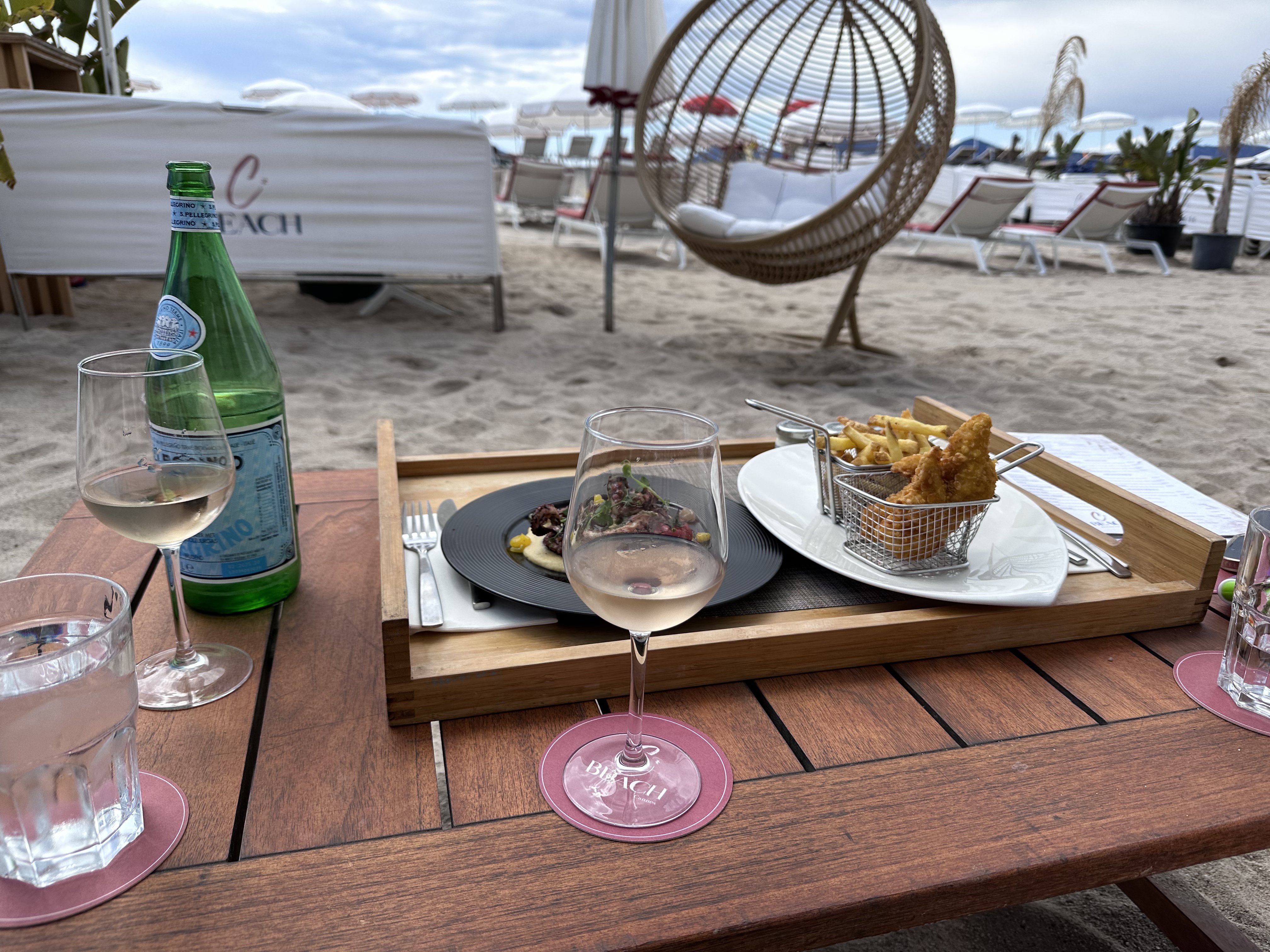 Prix raisonnable pour Cannes - j'ai dépensé 95 euros pour le déjeuner, le café, le dessert, l'eau gazeuse, le vin et une chaise de plage privée pour 1 personne.