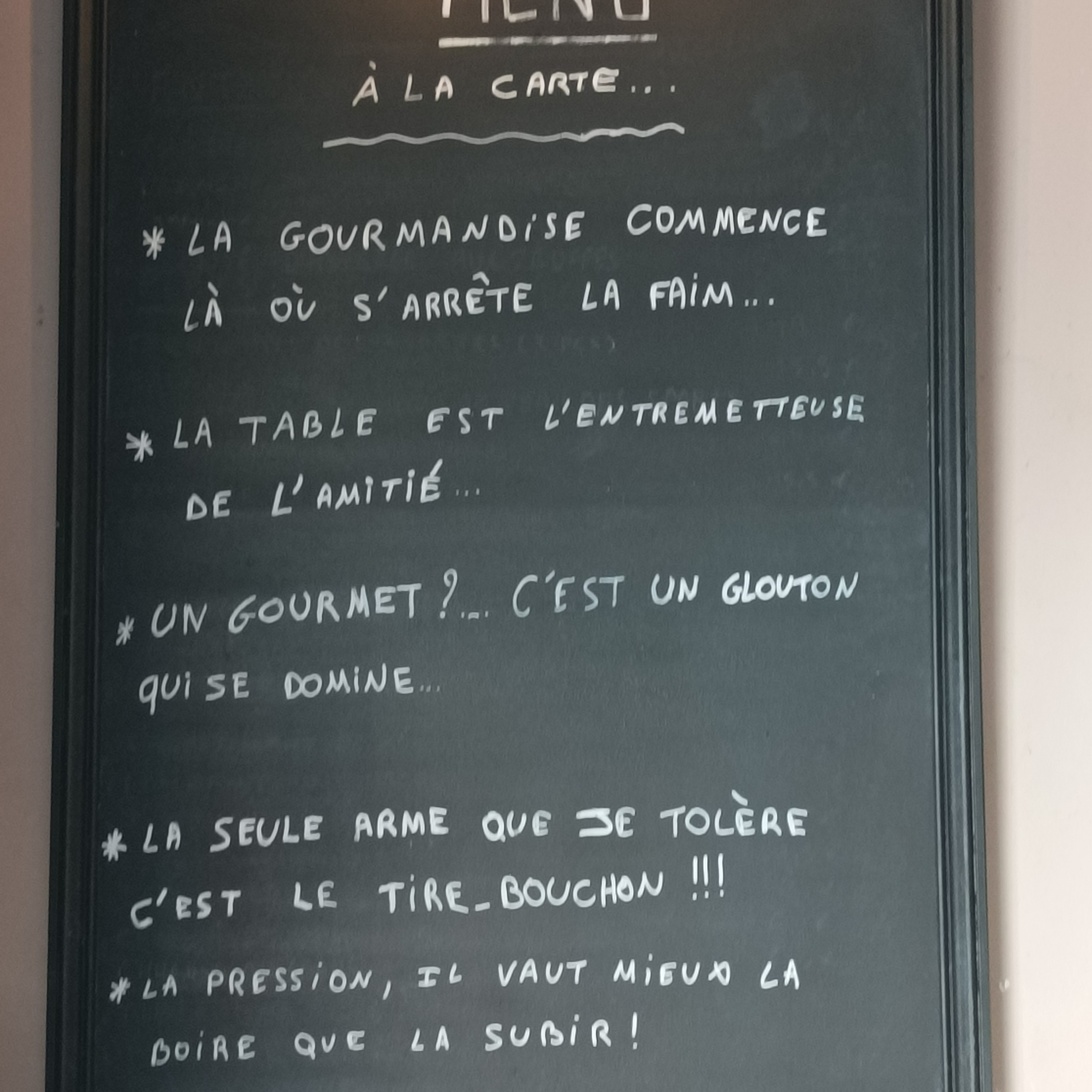 J adore cet endroit ! La façade est splendide On y mange toujours bien . Le choix des vins est top . Et l équipe est toujours super sympa .