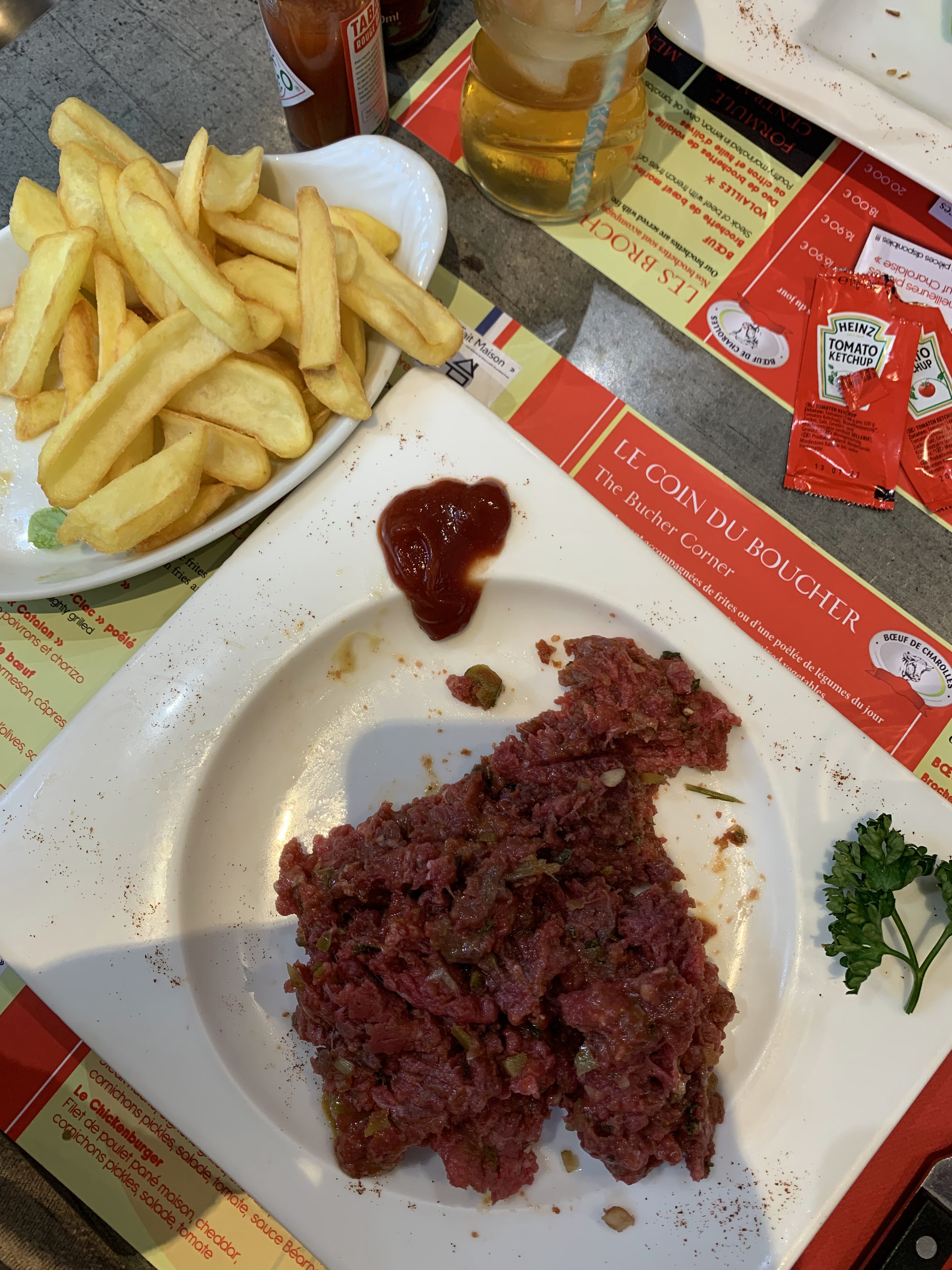 J'ai eu envie de manger un tartare catalan accompagné de frites et d'une salade verte, une crème caramel et un expresso. Sans oublier de commencer par une pelforth blonde.