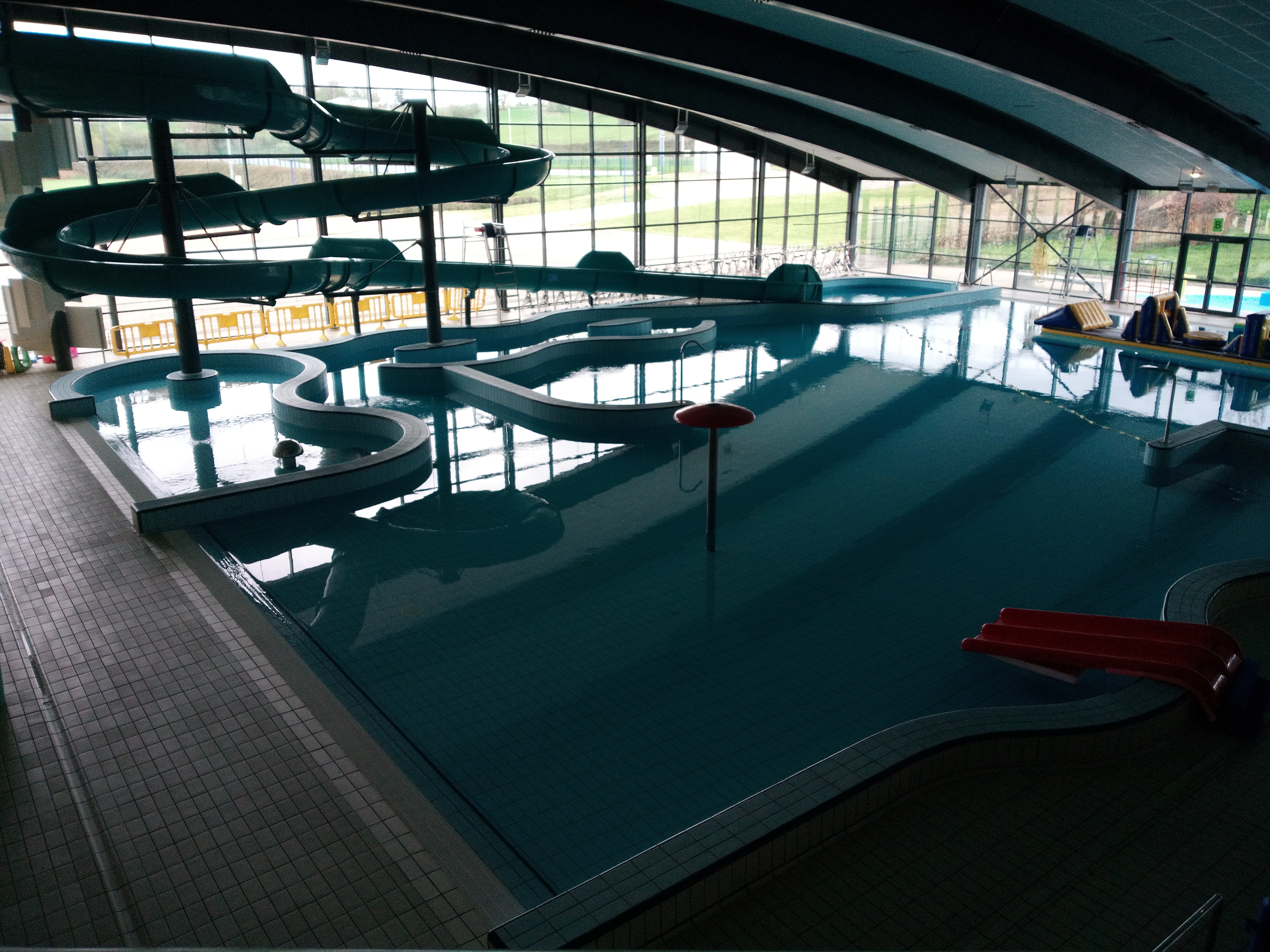 Super après-midi au centre aquatique ! 2 grands bassins et 1 toboggan à l'intérieur, 1 pataugeoire, 1 petit bassin et 1 toboggan à l'extérieur ! Il y a une grande pelouse pour faire bronzette à l'extérieur ou se poser à l'ombre sous les arbres, mais petit bémol il y a très peu de chaises à disposition, donc prévoir des serviettes