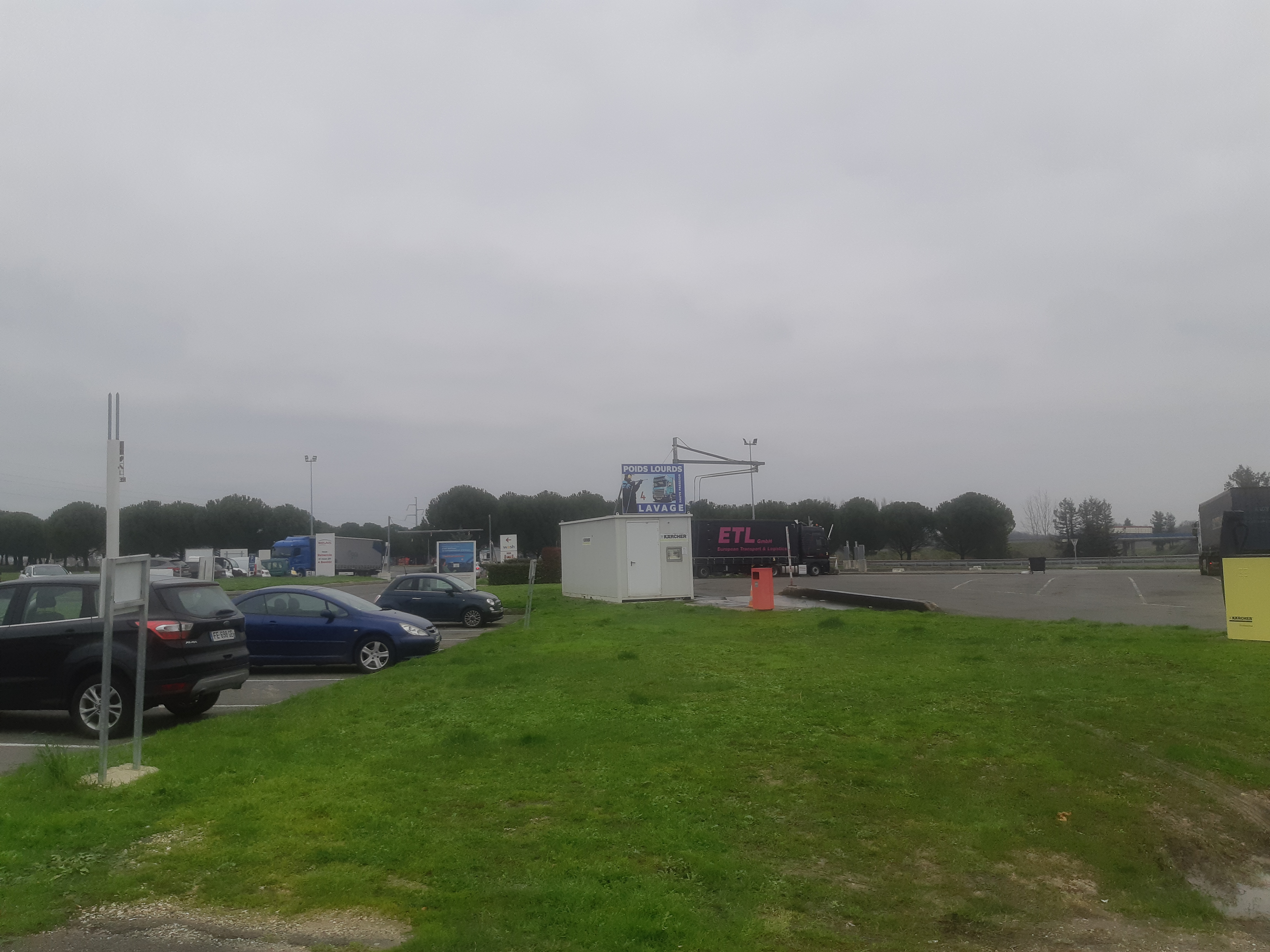 Grand parking pour camions, il y a une douche, des toilettes, un lave-linge et également un magasin TIR