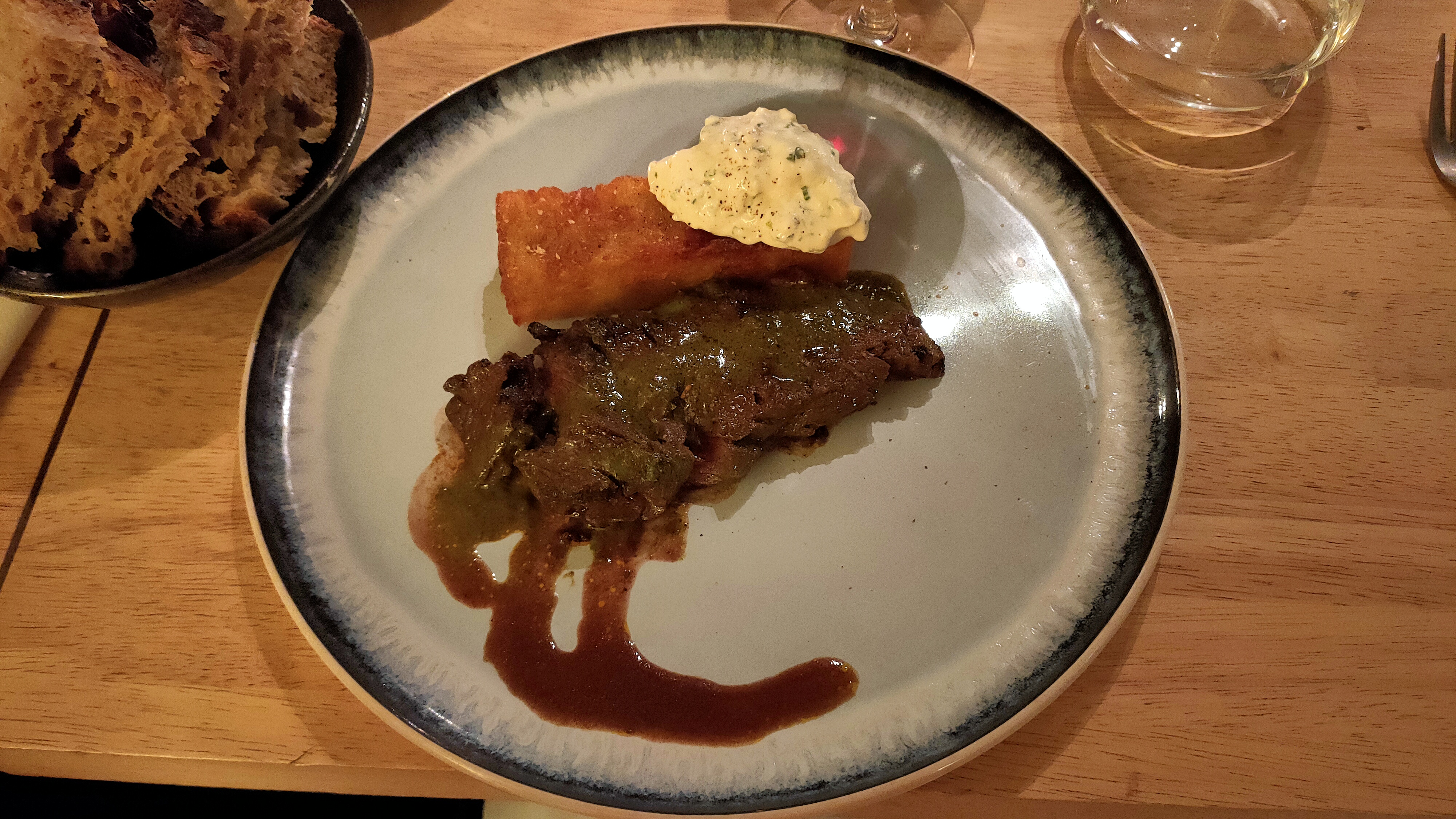 Très bon menu à 3 plats avec certains des meilleurs porcs que j'ai mangés comme plat principal (bien que je n'aime pas trop l'accompagnement de salade de pommes de terre froide). Le taco au tartare de bœuf en entrée était également excellent. Service très sympathique et bons cocktails avant/après le dîner.