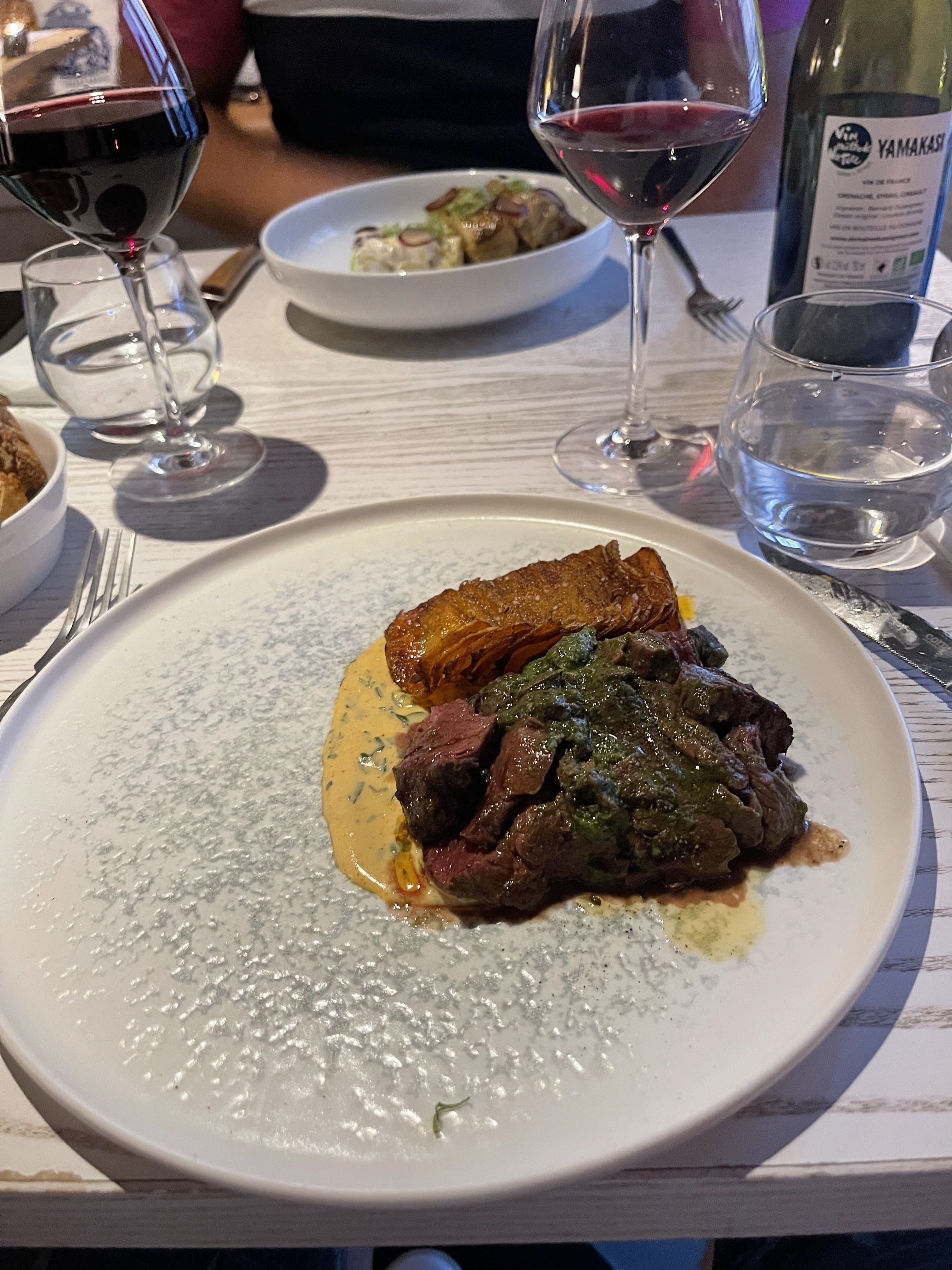 excellent petit bijou de restaurant ! Facile à manquer, mais l'intérieur est assez accueillant et confortable. Le menu est très court, mais tout ce que nous avons commandé était excellent. Nous avons eu un tartare de thon en entrée qui était délicieux. Nous avons essayé le poisson du jour et le bœuf. Le poisson était plutôt bon et le bœuf était complètement magnifique. Le dessert était bon aussi. Le serveur était super gentil et continuait à nous surveiller pendant que nous attendions l'arrivée de nos amis. Je ne pouvais pas très bien le suivre à cause de mon manque de compétences en français, mais il avait une ambiance vraiment positive.